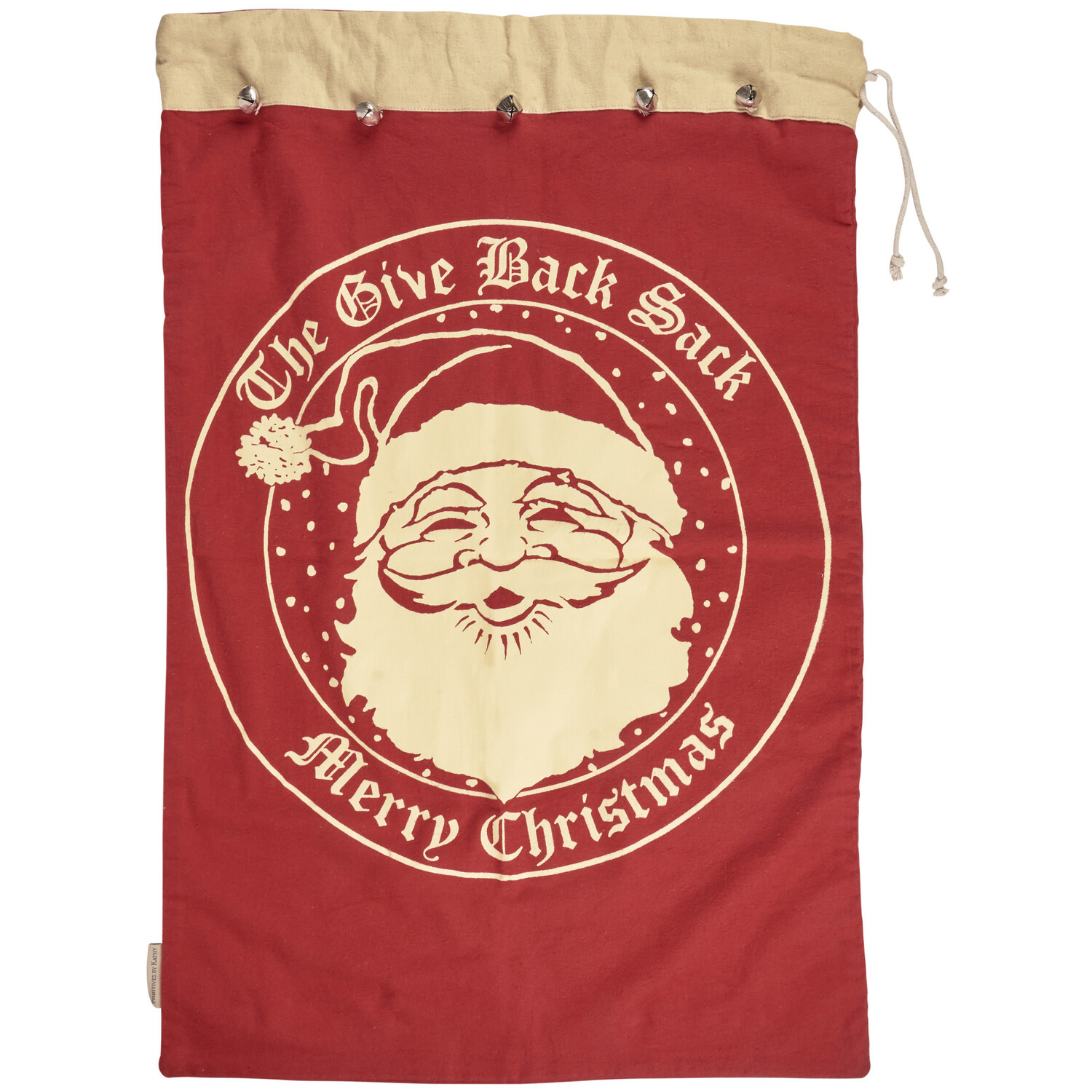 A double-sided canvas Santa sack displaying a vintage Santa design on the front with sentiment that reads "The Give Back Sack - Merry Christmas."