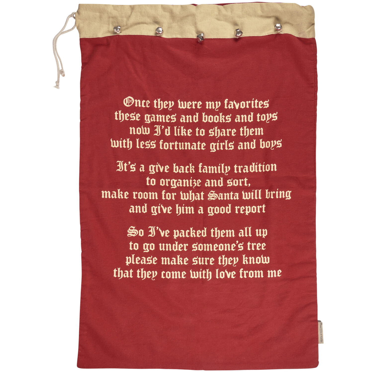 A sentiment on the back describes how the sack should be used to give toys from around the house to someone in need.