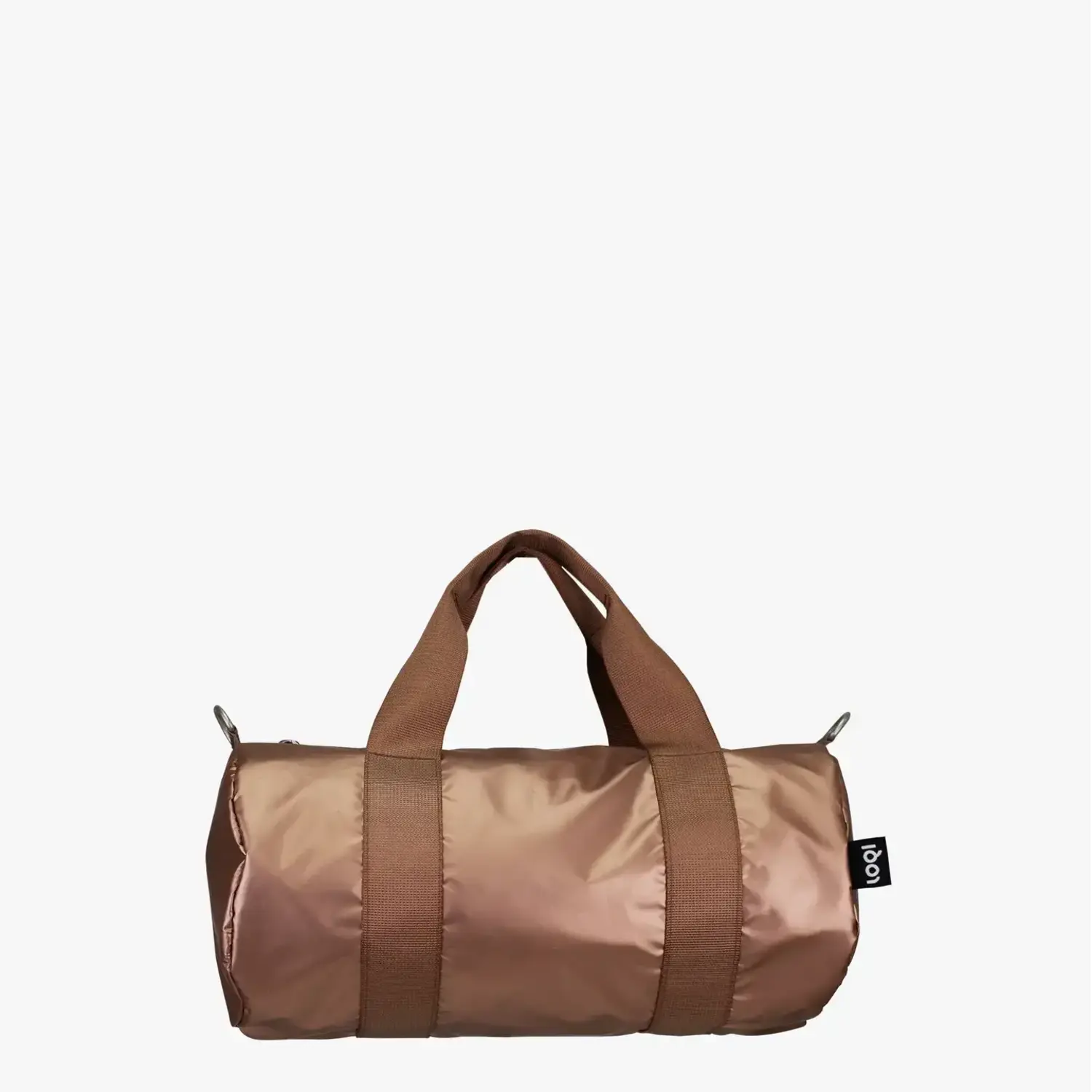 The Metallic Rose Gold Weekender Bag combines sleek, shiny material that’s soft–to–the–touch with practical functionality.
