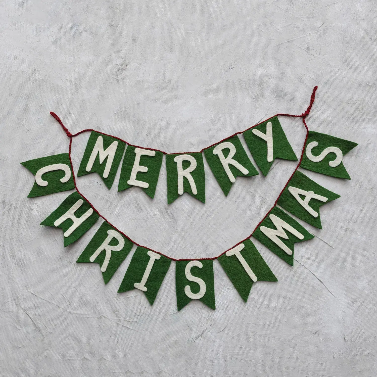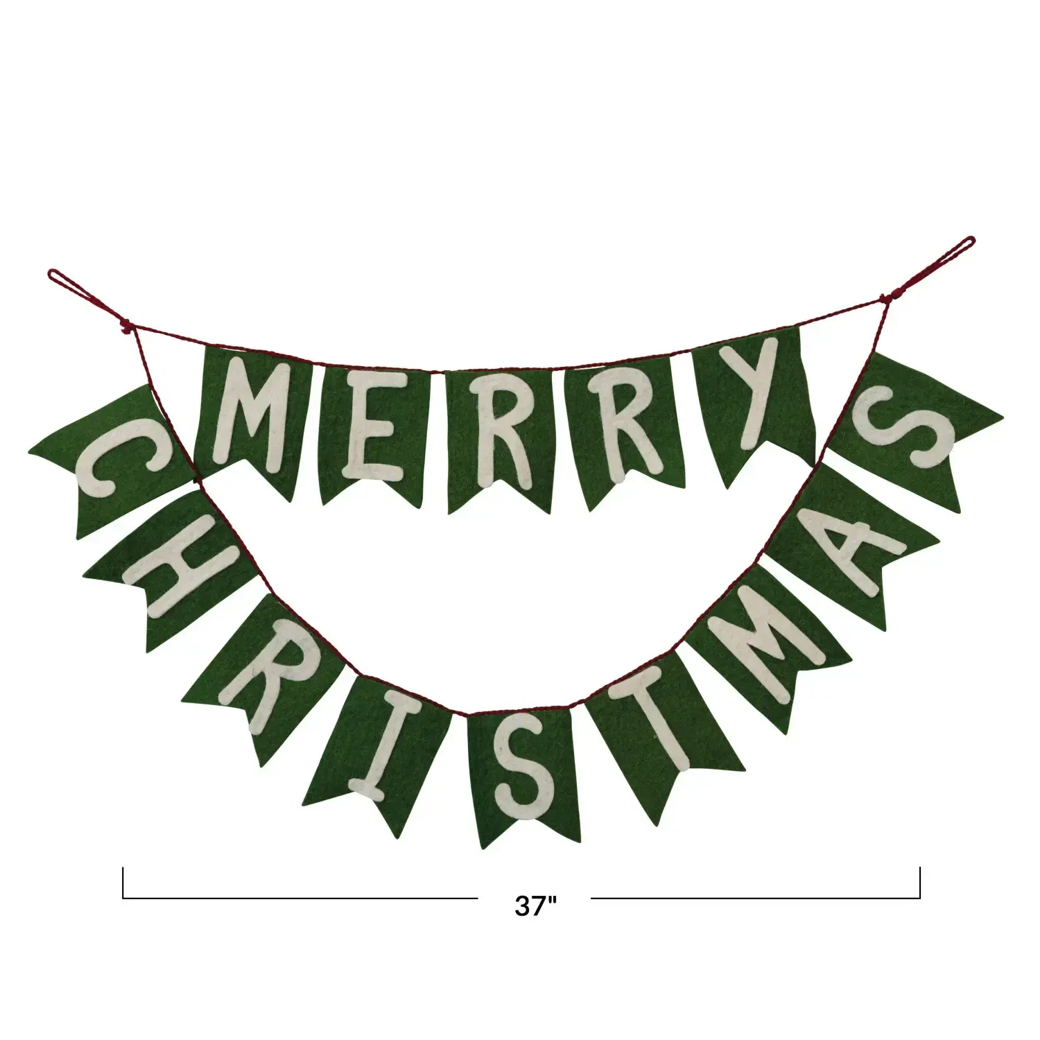 37"L Handmade Wool Felt Banner "Merry Christmas", Green, White & Red.