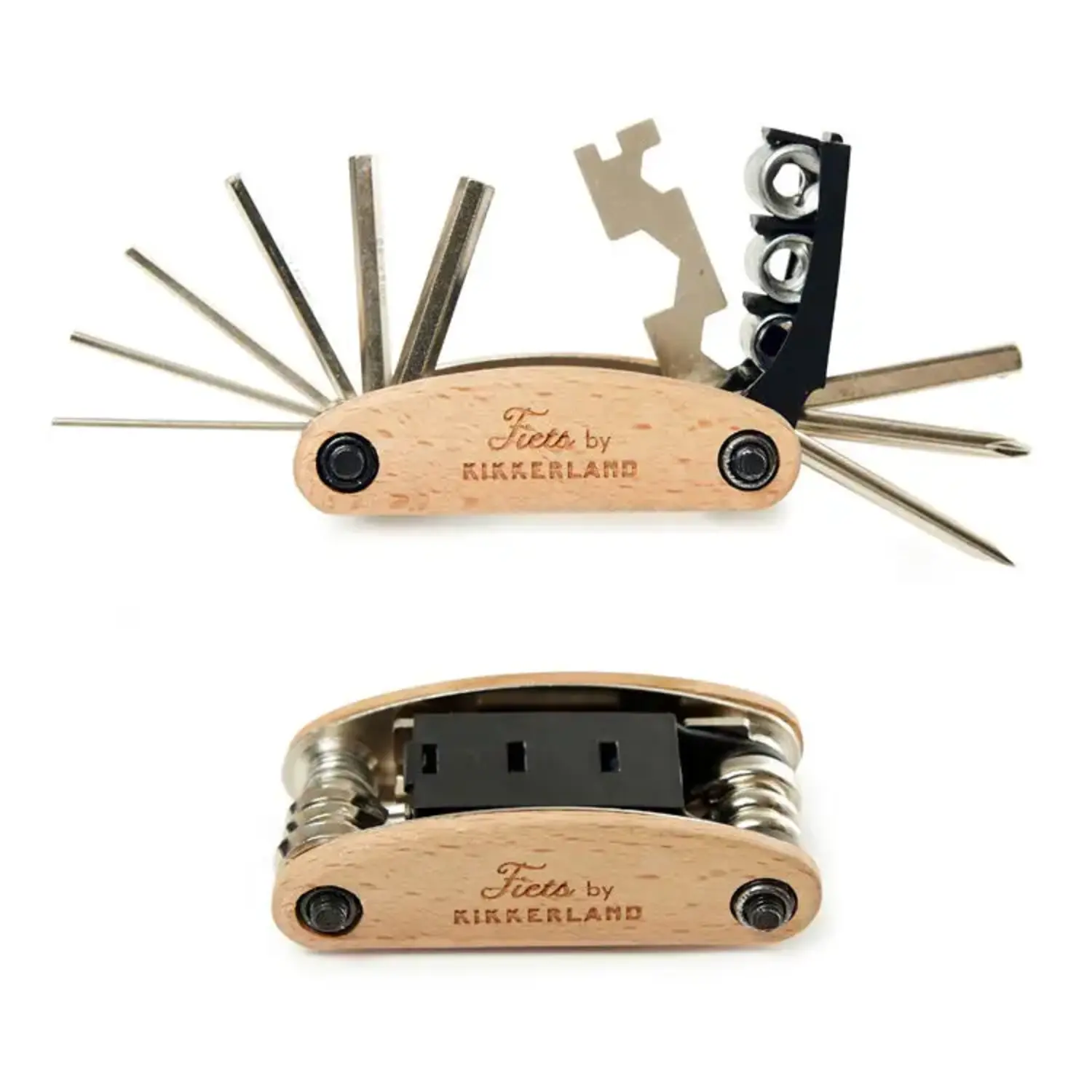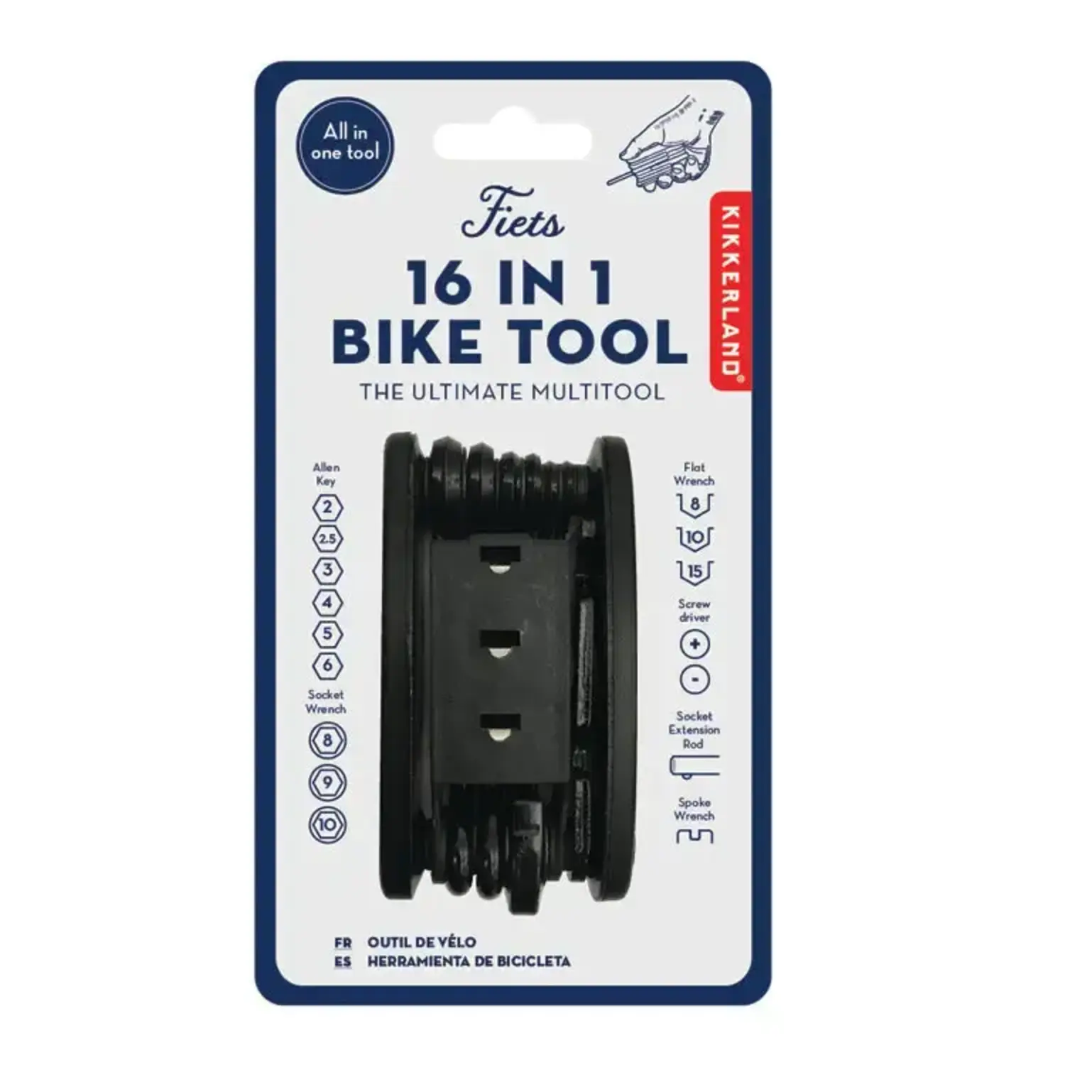 16 different uses include: 2mm allen key, 2.5mm allen key, 3mm allen key, 4mm allen key, 5mm allen key, 6mm allen key, square socket extension rod, 8mm hex, 9mm hex, 10mm hex, Phillips head screwdriver, flathead screwdriver, 8mm open end wrench, 10mm open end wrench, 15mm open end wrench, 14GE spoke wrench.