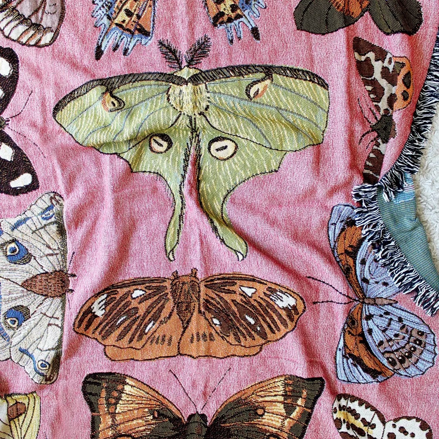 Multi-color tapestry blanket featuring fluttering creatures with the most beautiful patterns, shapes, and textures in a soft cotton/acrylic knit.