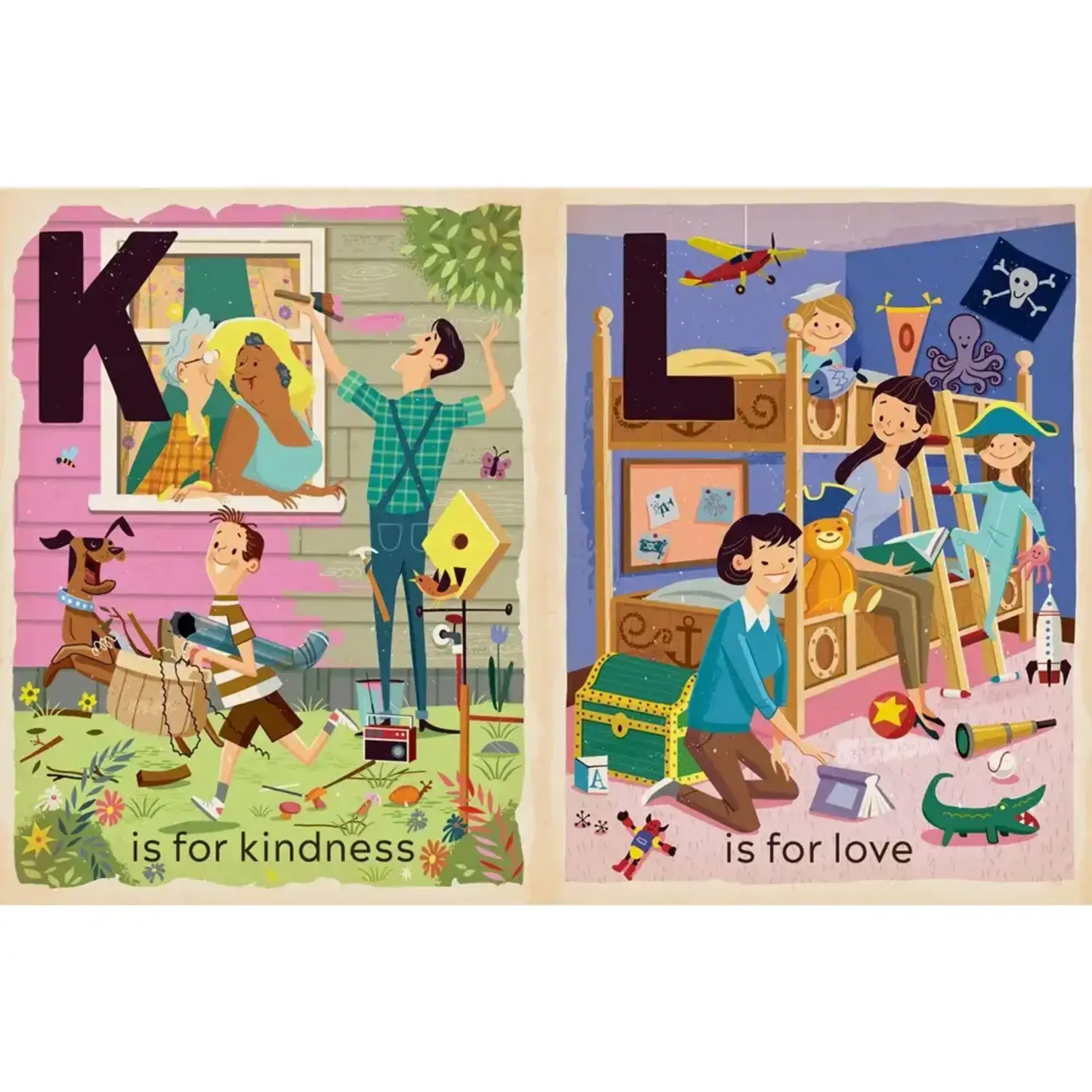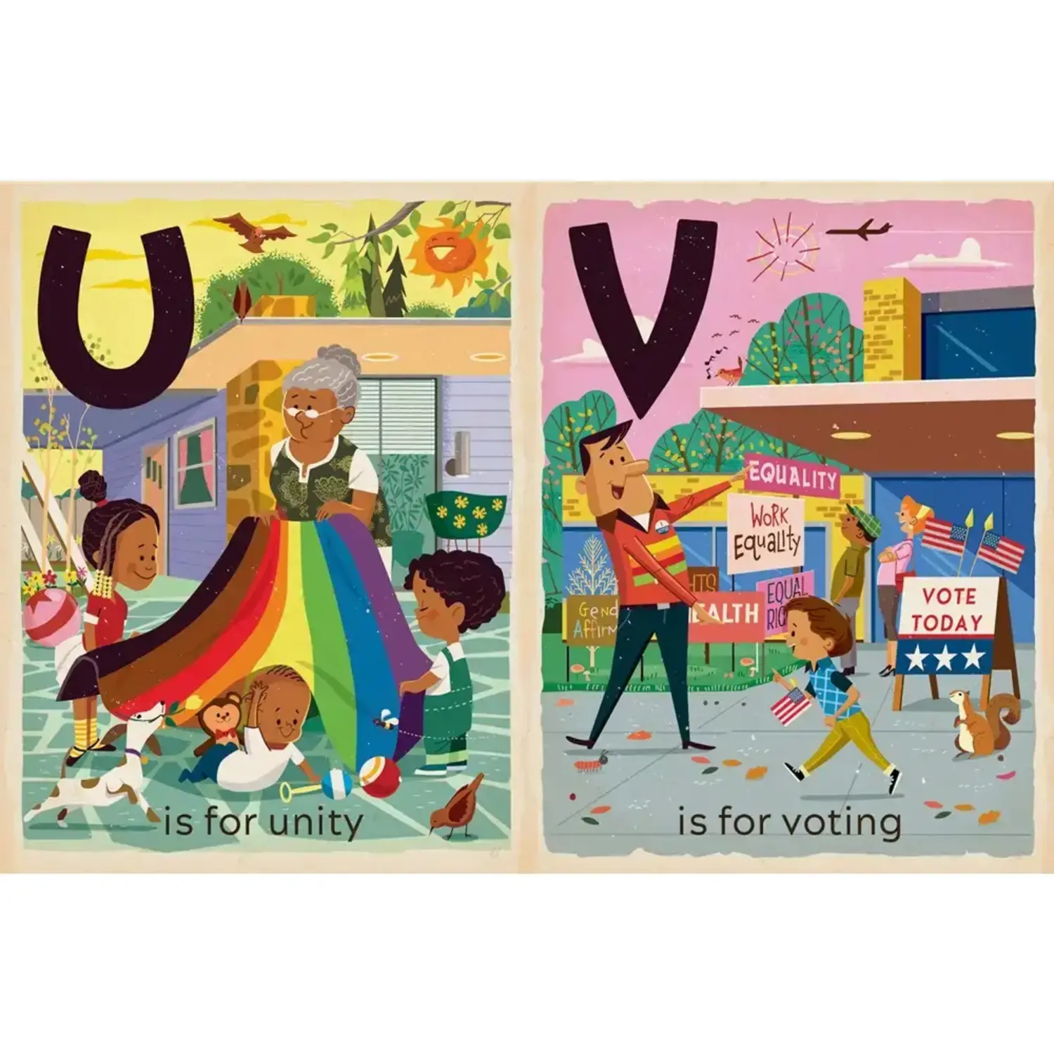 Learn how to be inclusive with words like Courage, Equality, Gay, Nonbinary, Rainbow flag, and Hug, Kindness, and Love in scenes showcased with Paprocki’s classically retro mid-century art style that’s proven to be a hit with both toddlers and adults.