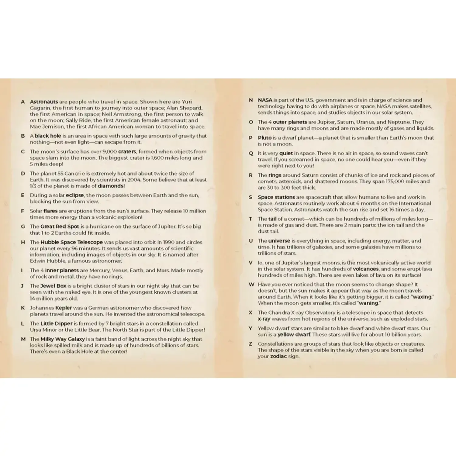 Learn with your toddler from A to Z all about the Universe and what can be found within it.