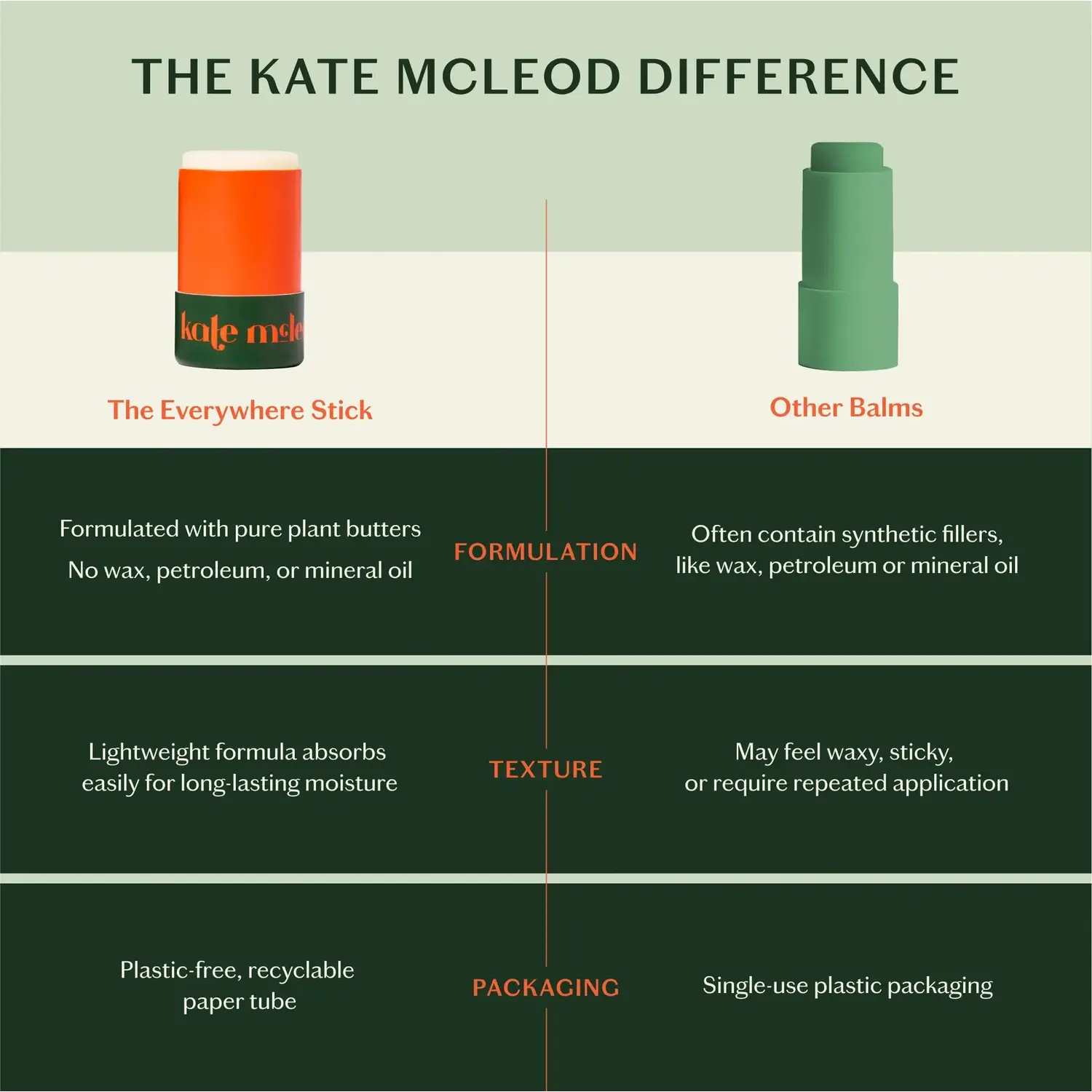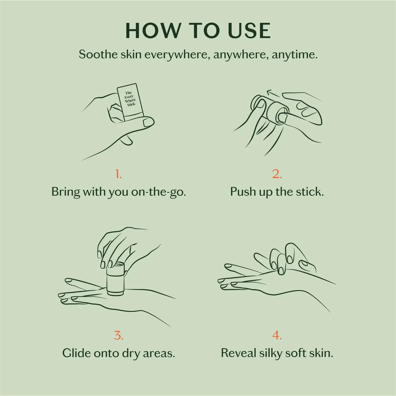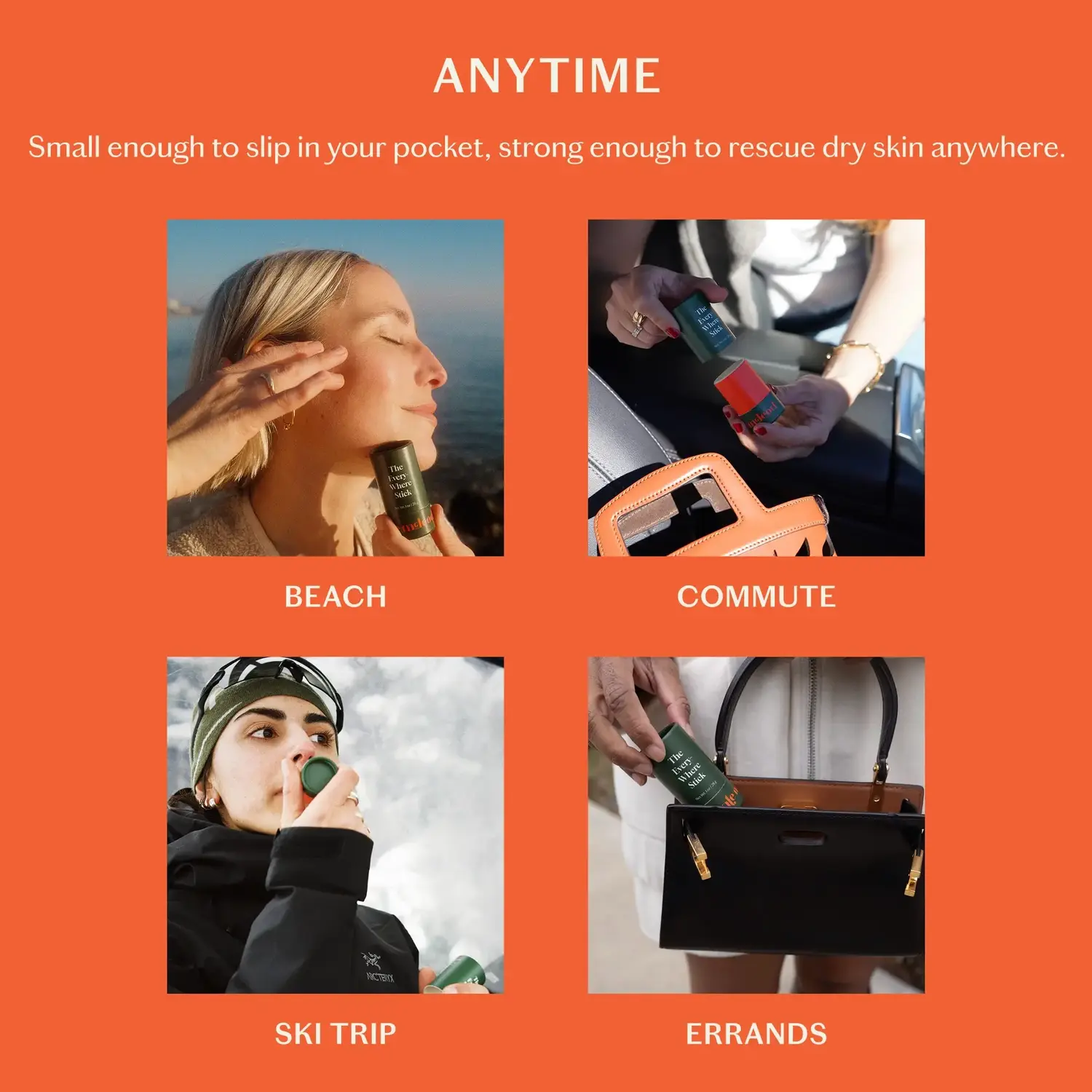 Just tuck the Everywhere Stick in your bag and apply whenever and wherever dryness strikes. Great for travel and outdoor adventures like skiing or hiking.