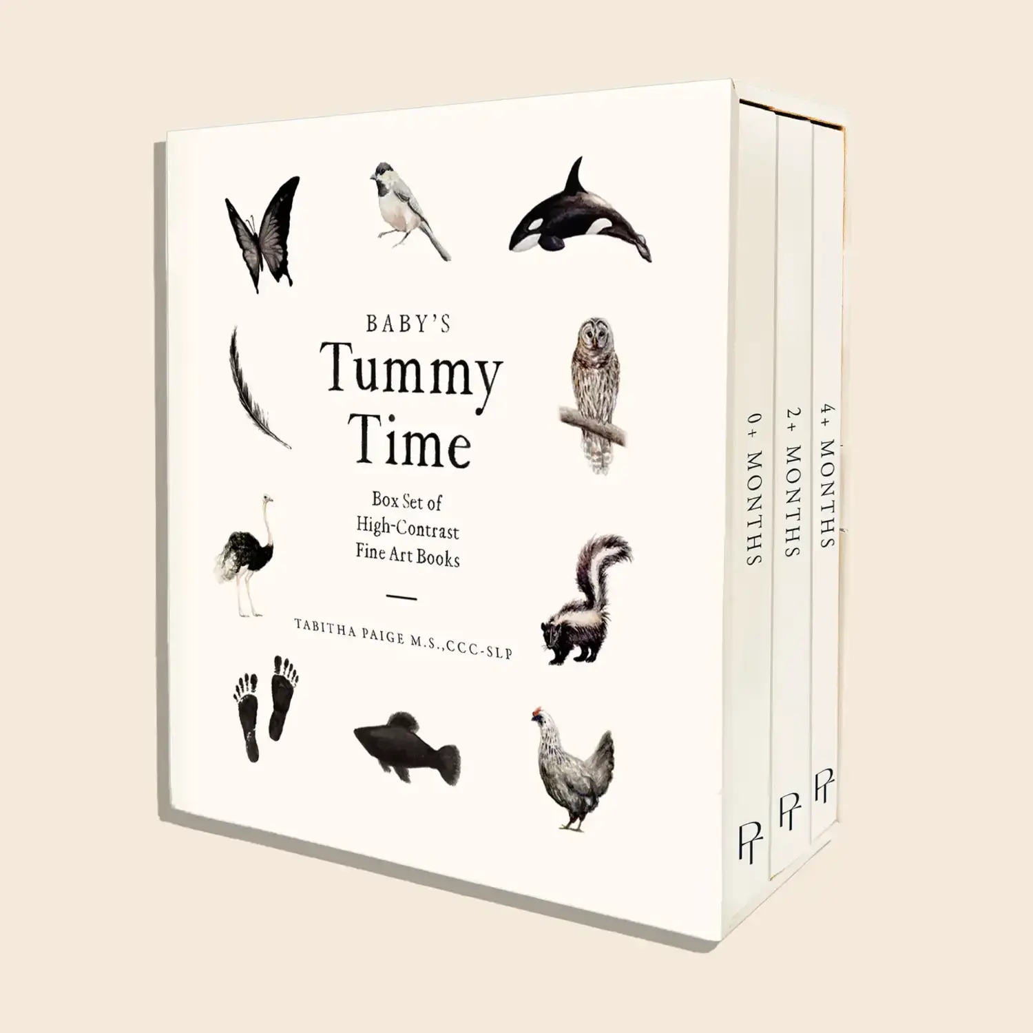 Created by bestselling author and speech pathologist, Tabitha Paige, each of the 3 accordion style board books features high contrast, watercolor artwork that grows with baby’s needs: from bold black-and-white shapes to color illustrations paired with words you can sound.
