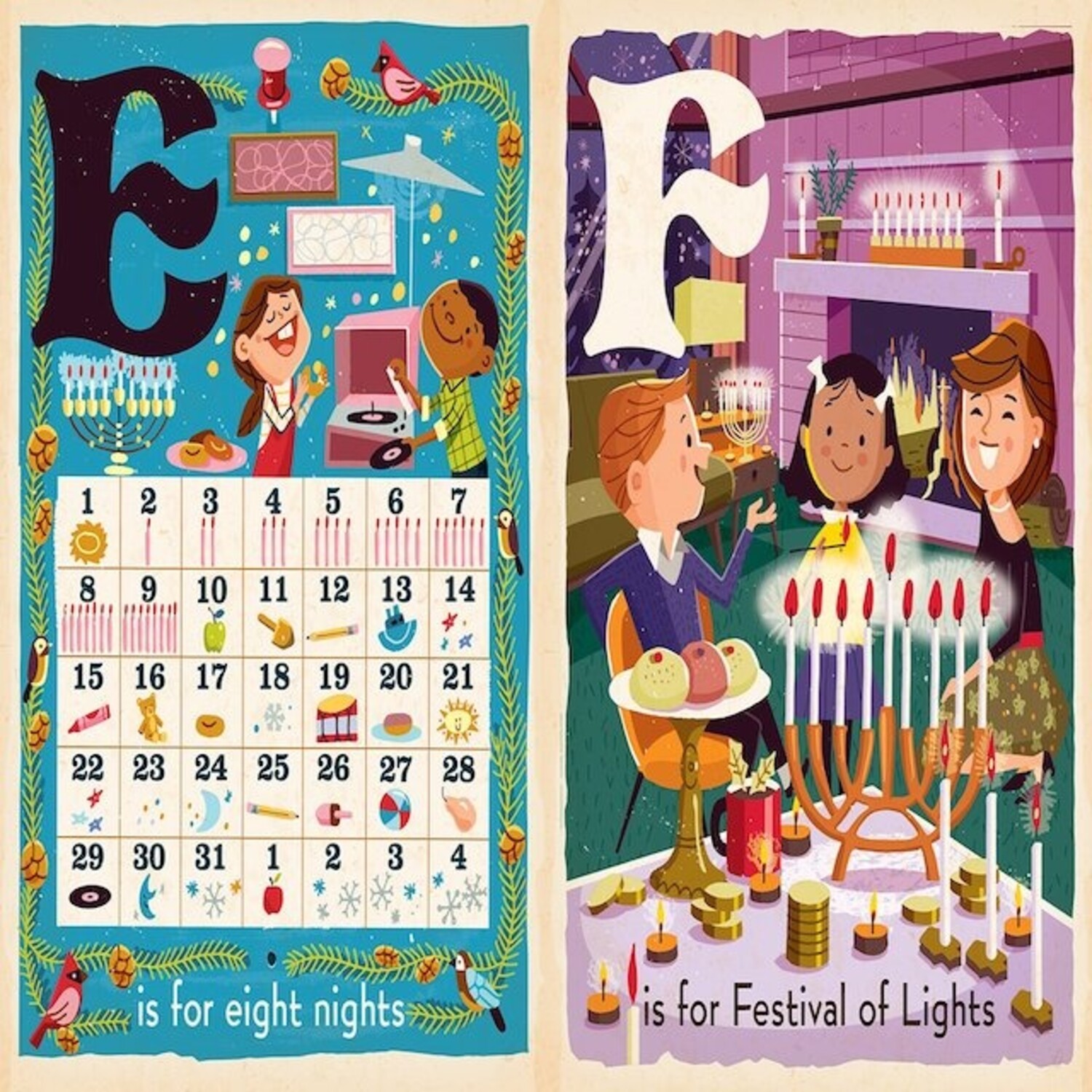 Featuring a retro-cool illustration for each letter of the alphabet and Hanukkah-themed items such as latkes, the menorah, and dreidels.