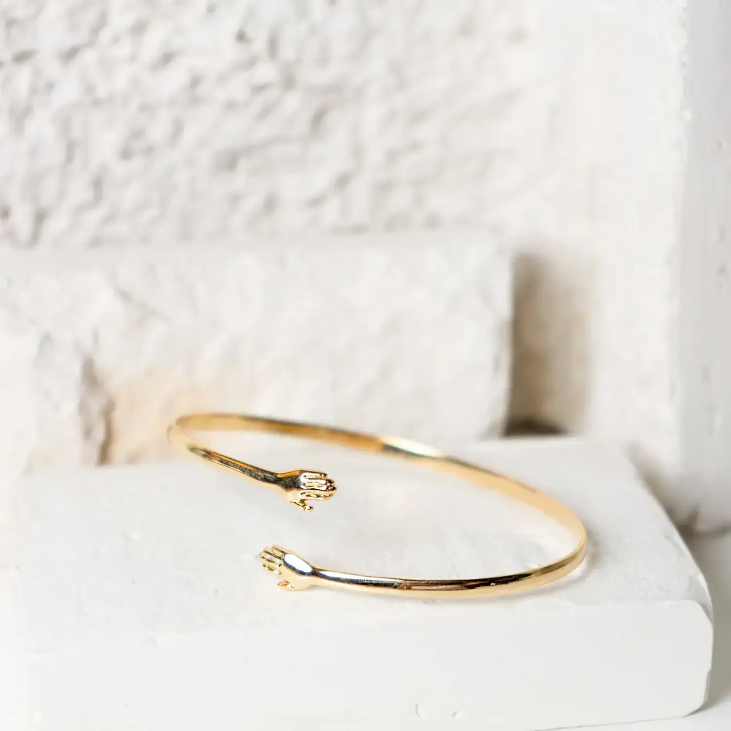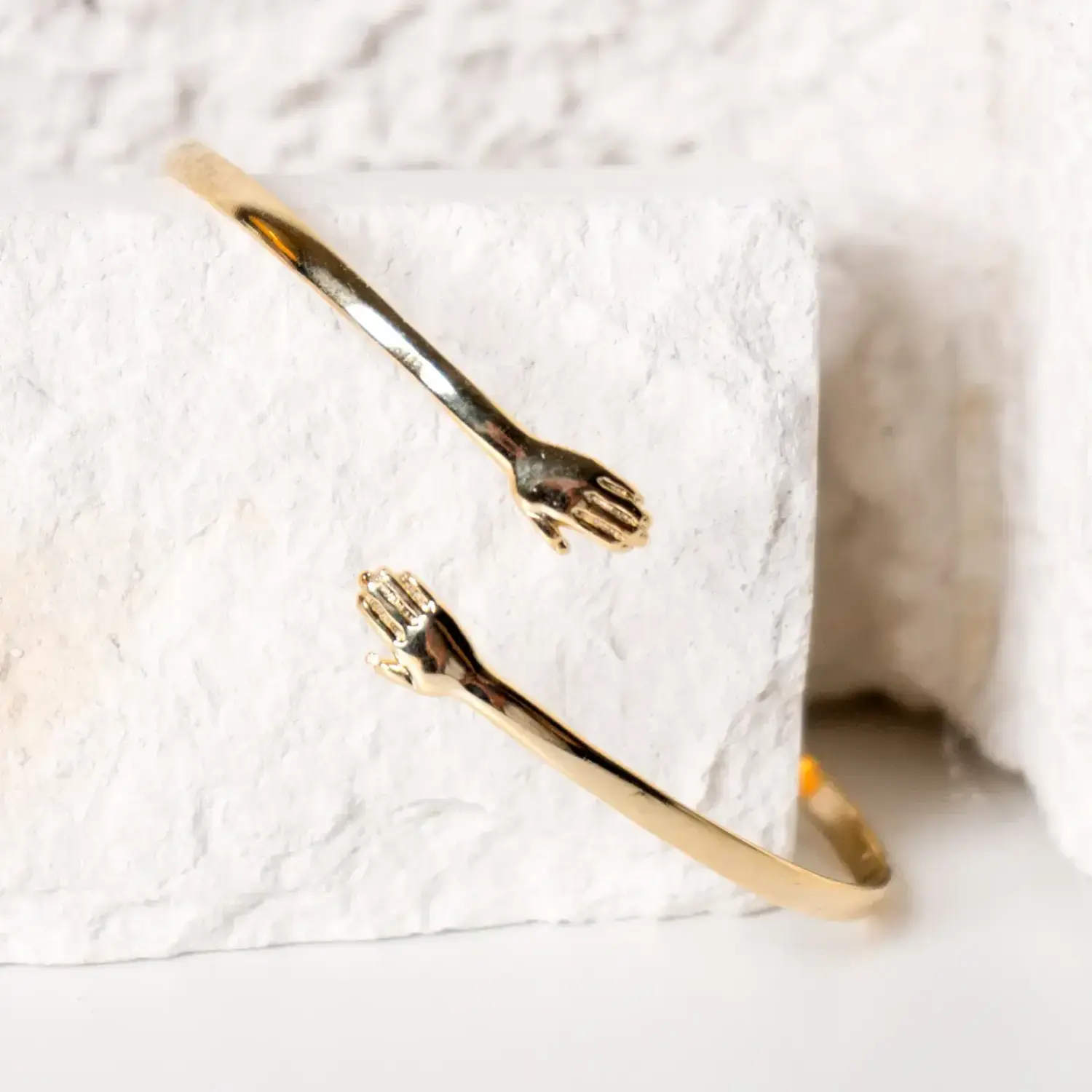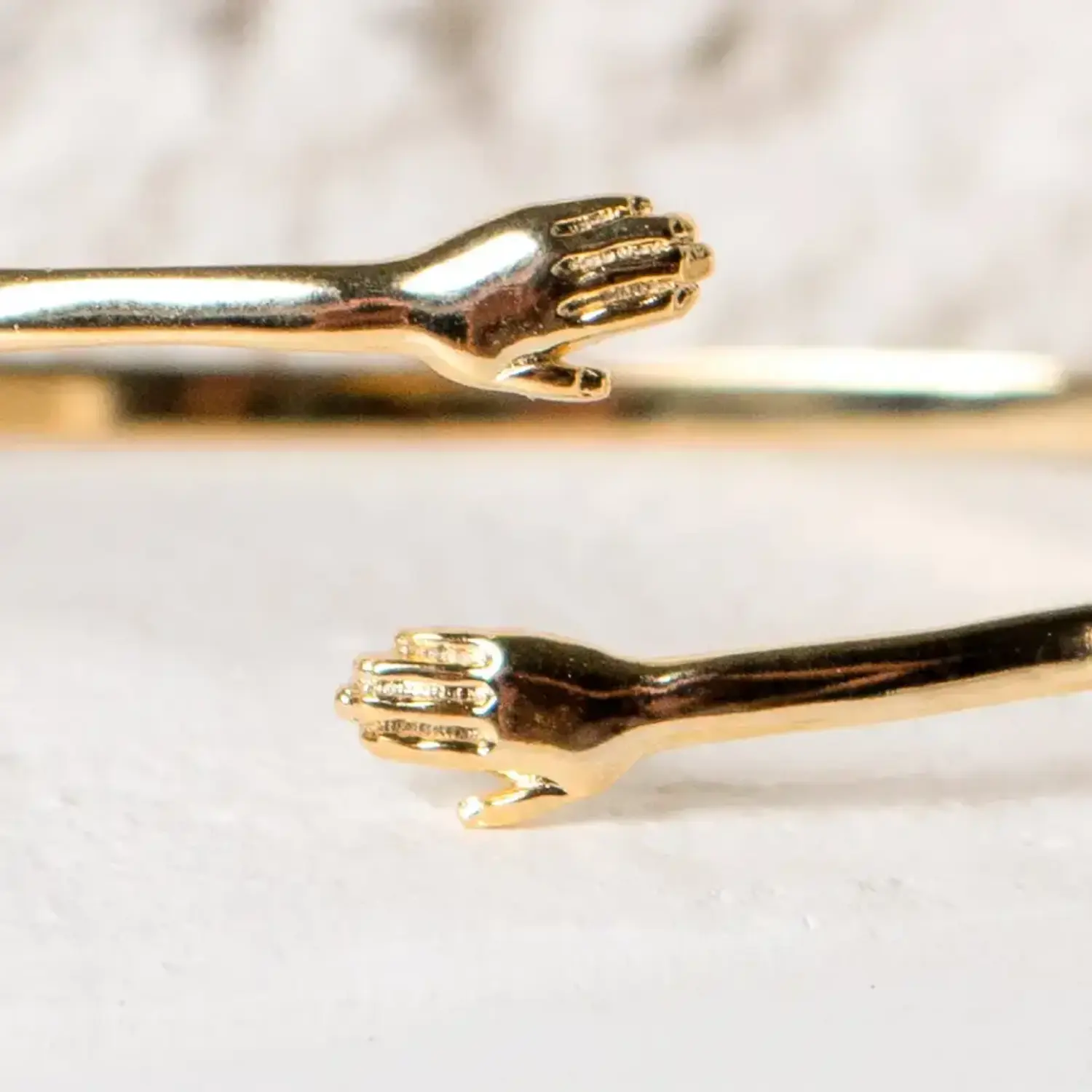 Crafted with the same thoughtful detail as the signature hand ring, this sleek, minimalist cuff features two delicate hands reaching toward one another in a symbol of enduring bond and comfort.