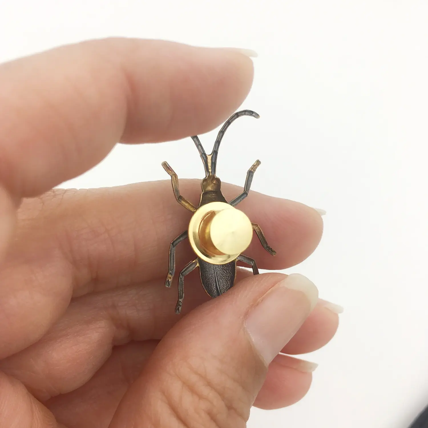 This brass long-horned beetle pin design is 100% handcrafted and assembled in the USA!