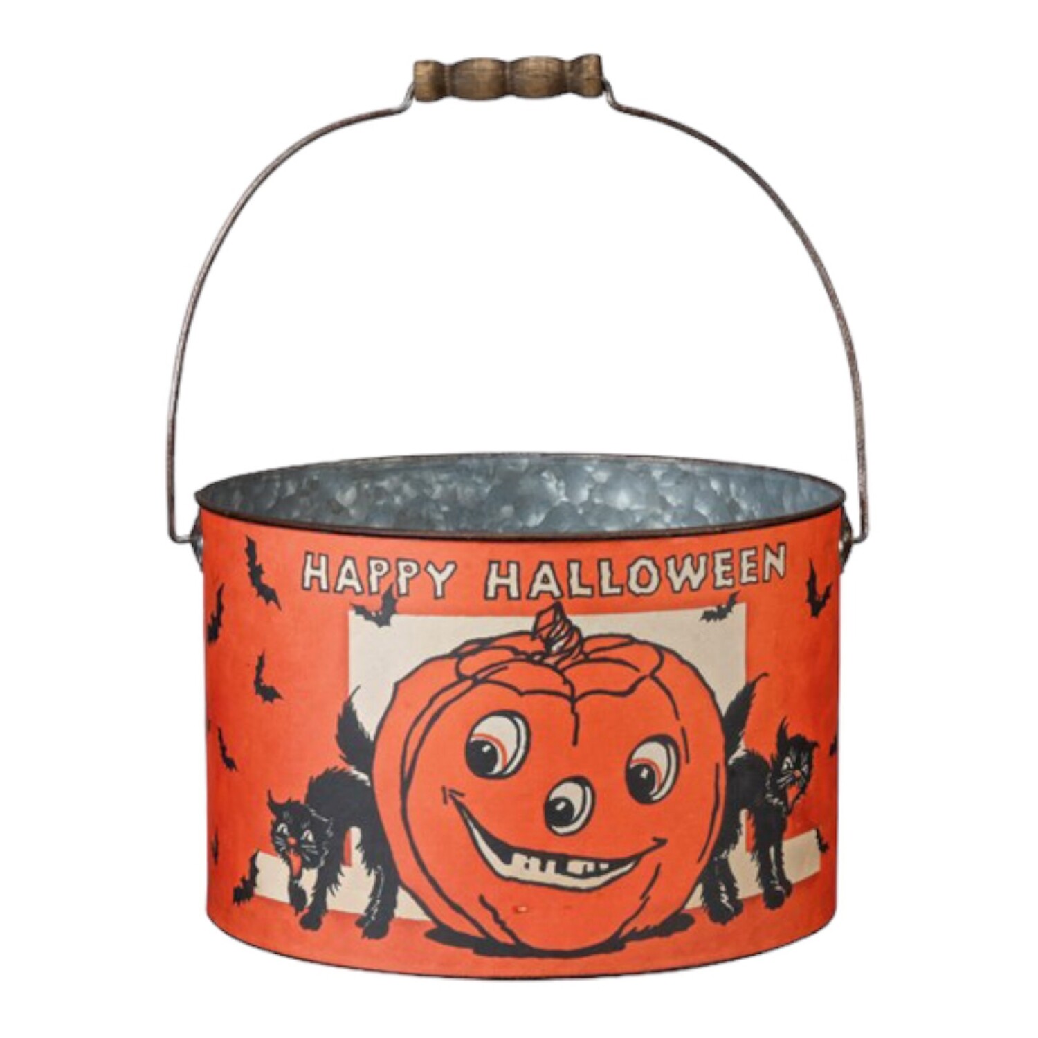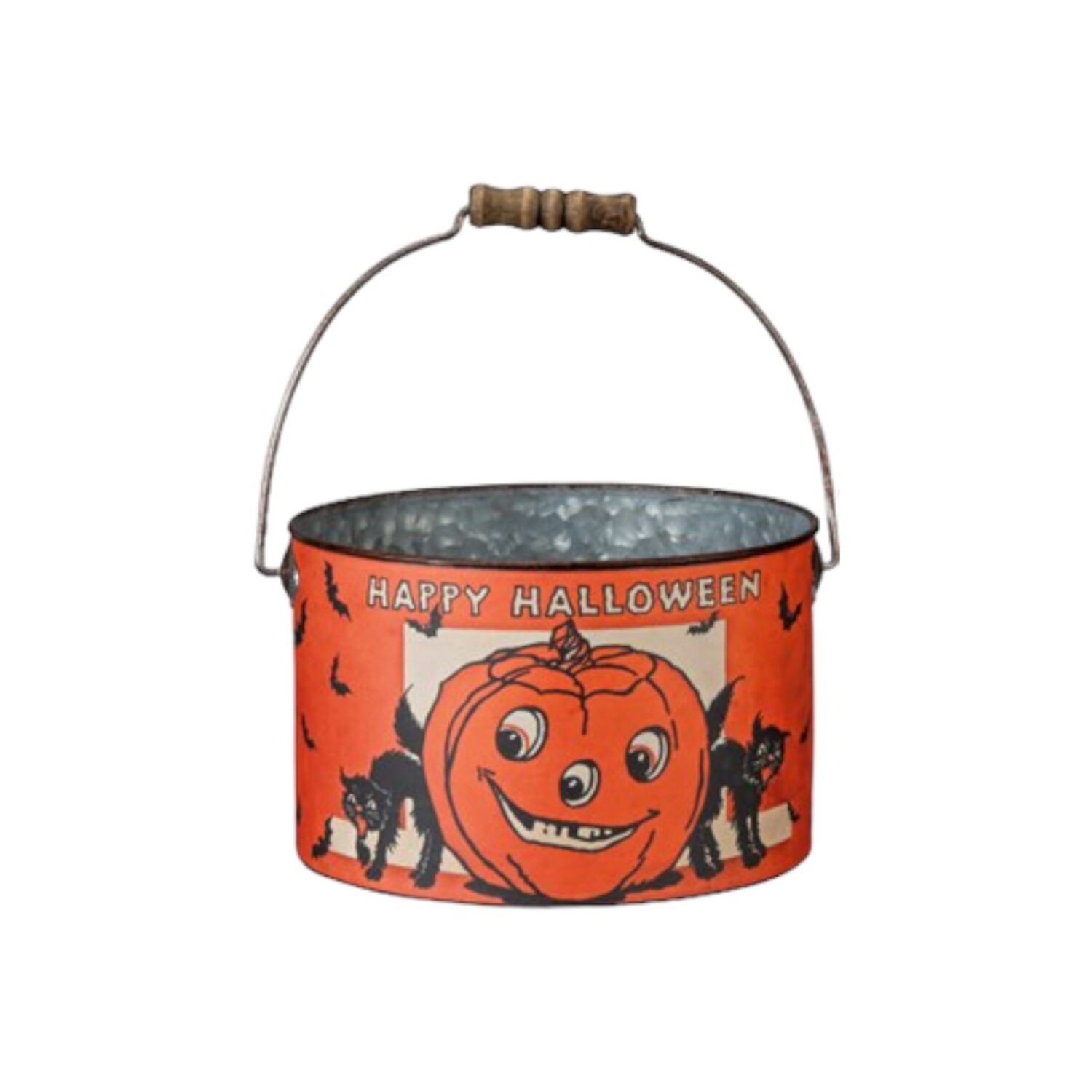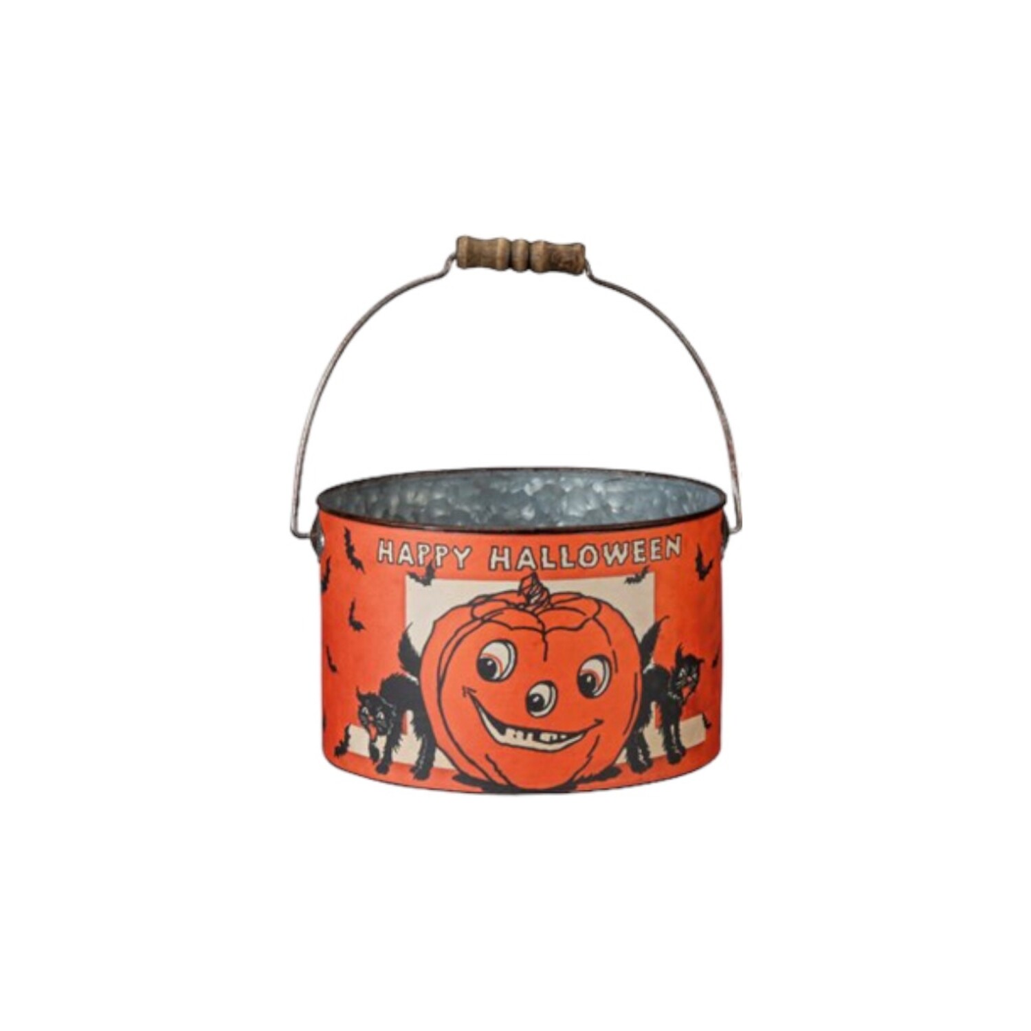 Step back in time with these retro-inspired metal buckets, featuring charming "Happy Halloween" sentiments and classic designs of Jack-o'-lanterns, black cats, and bats.