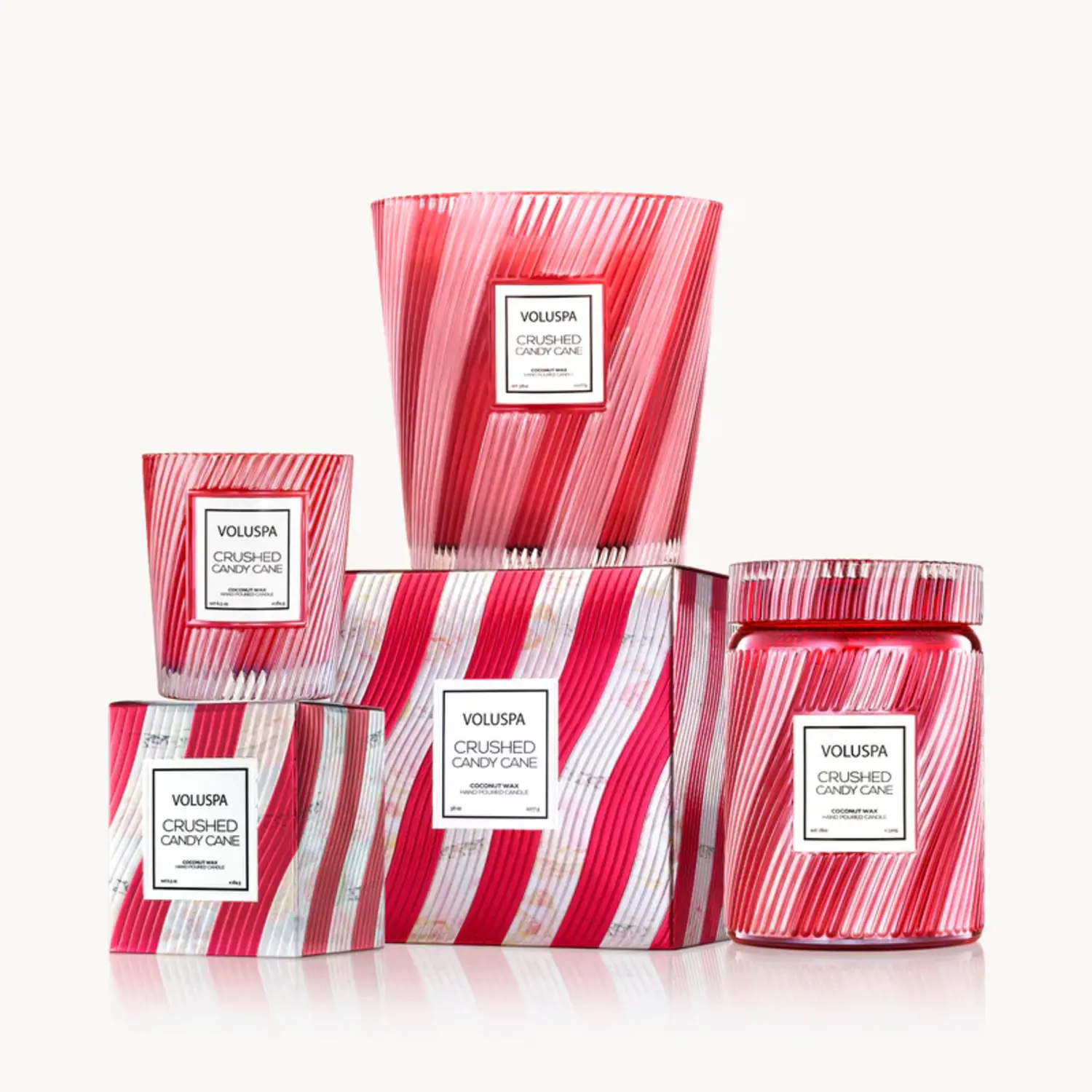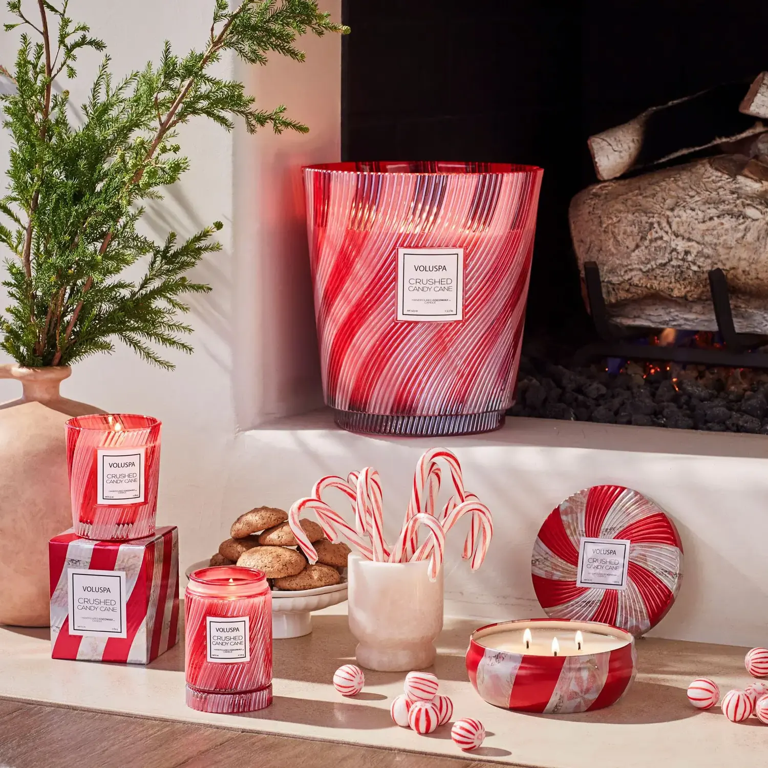 Voluspa's unique coconut wax blend is hand-poured into a gorgeous vessel embossed with a swirl pattern and hand painted with a festive red and white stripe detailing.