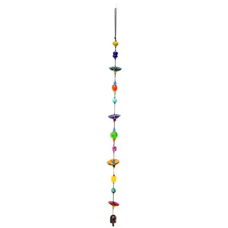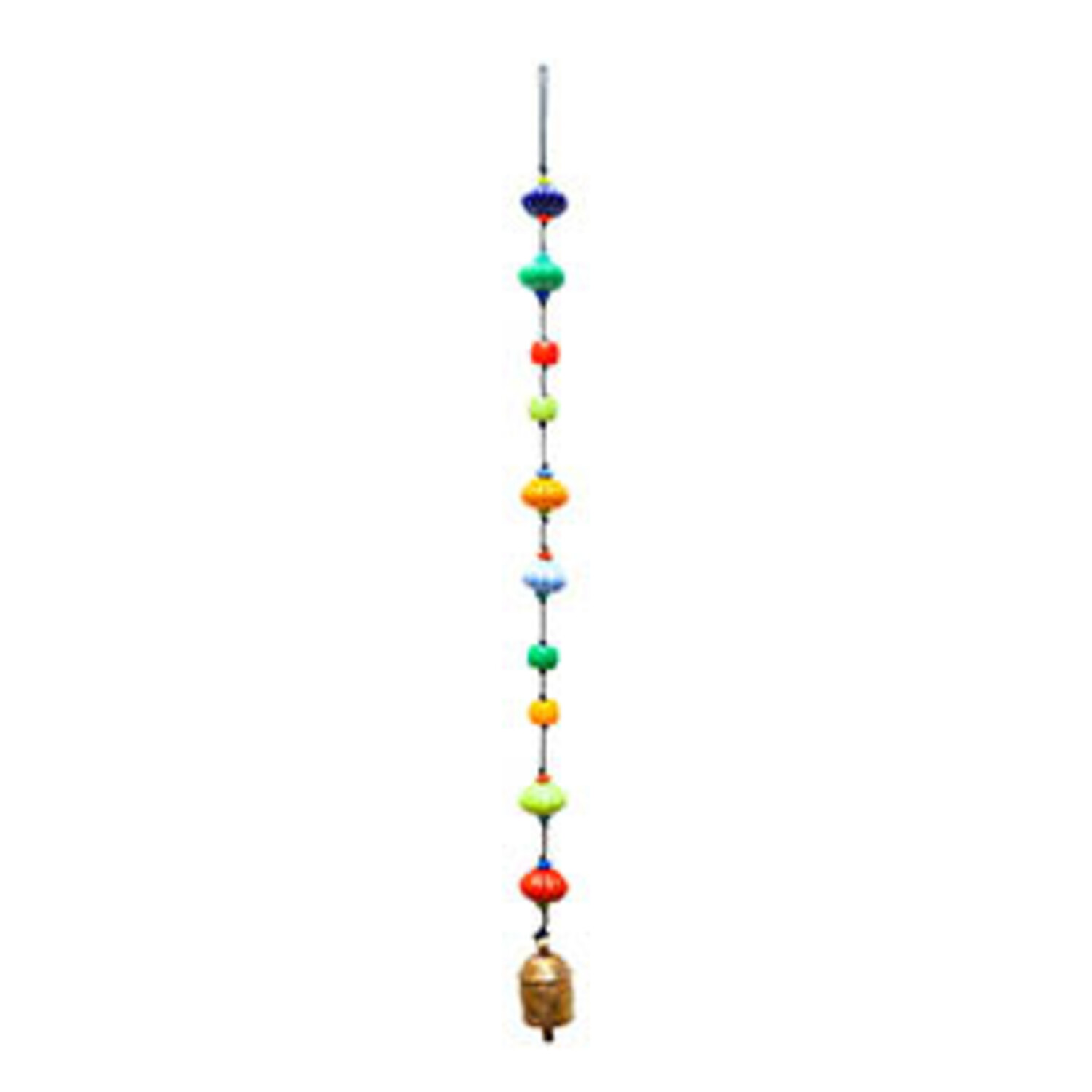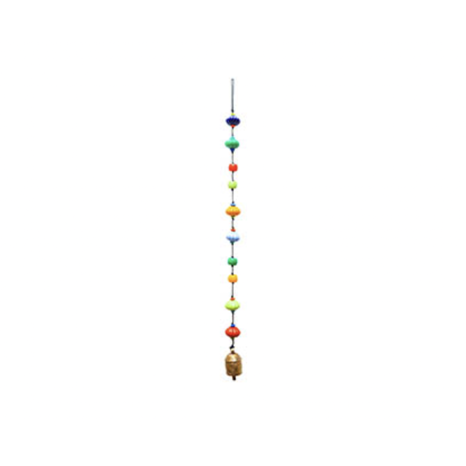 It features a 1-inch antiqued patina brass Nana bell with wood clapper at the end of the strand.