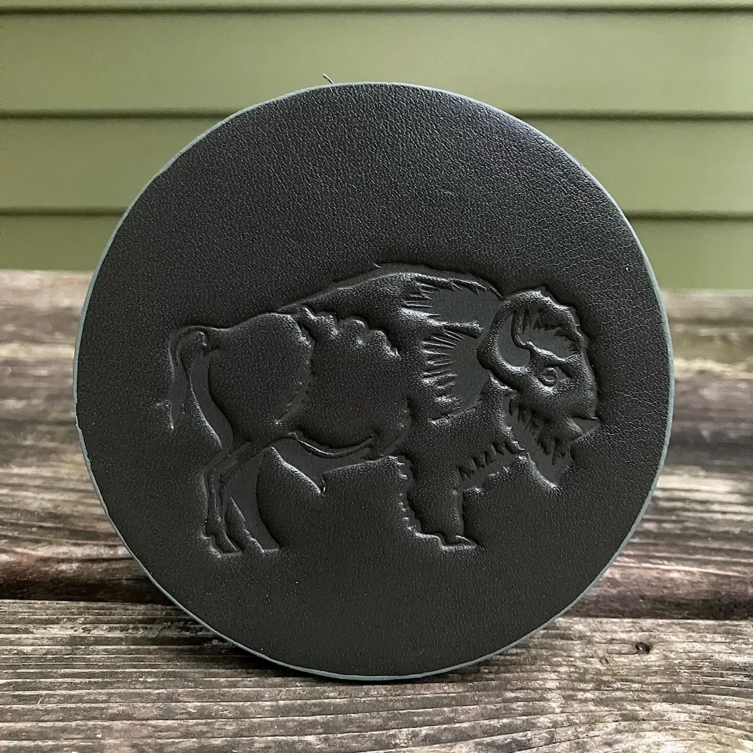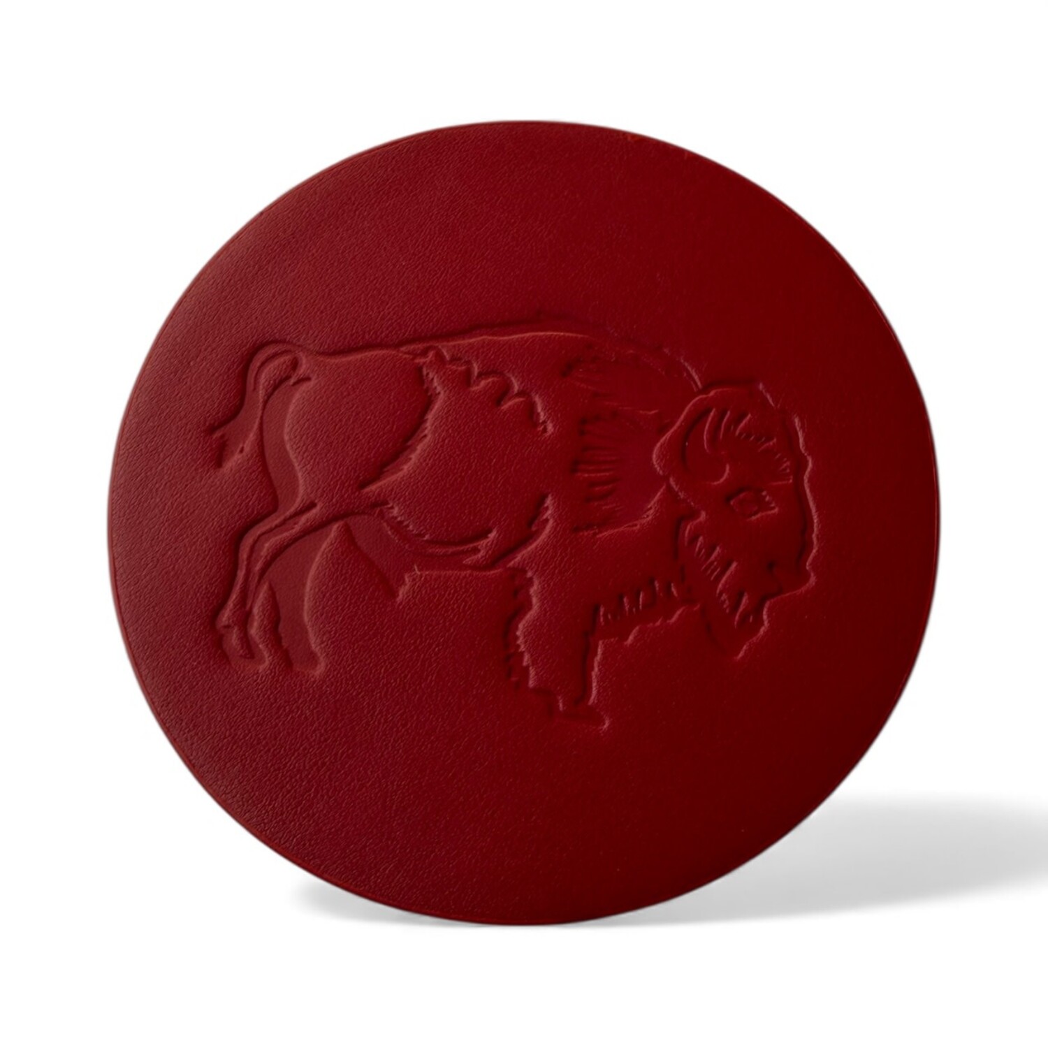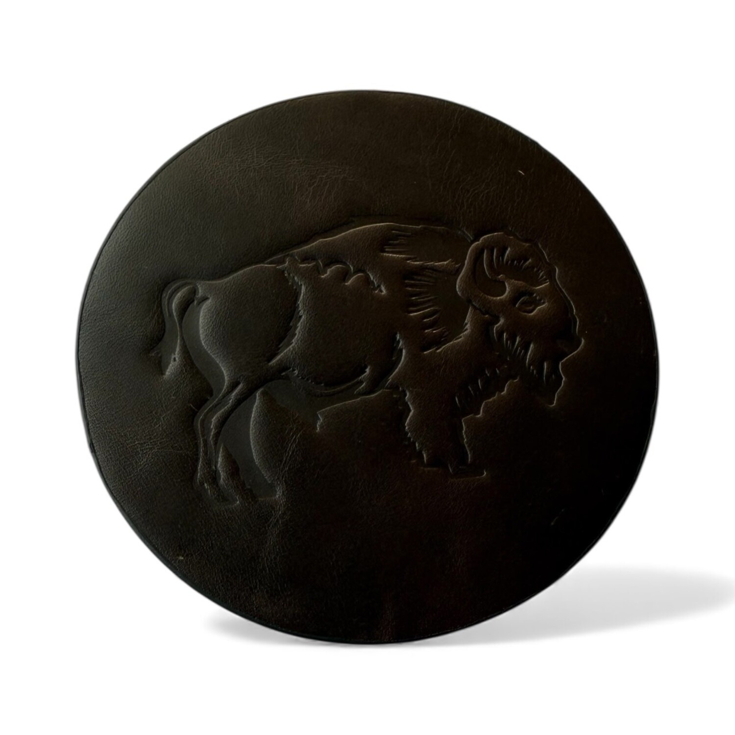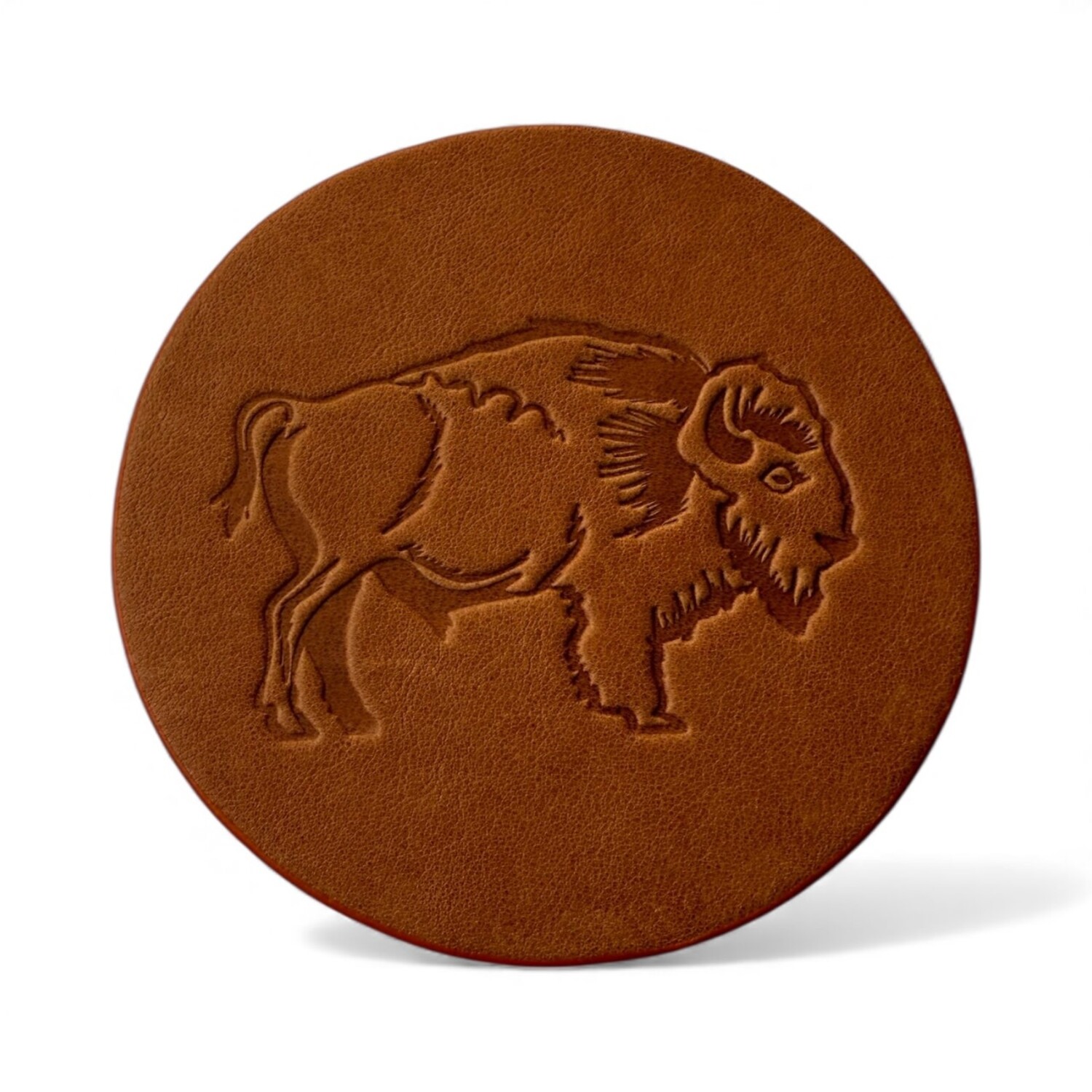 Crafted from premium American leather and stamped with a bold, hand-drawn bison, this coaster brings a touch of the prairie to any tabletop.