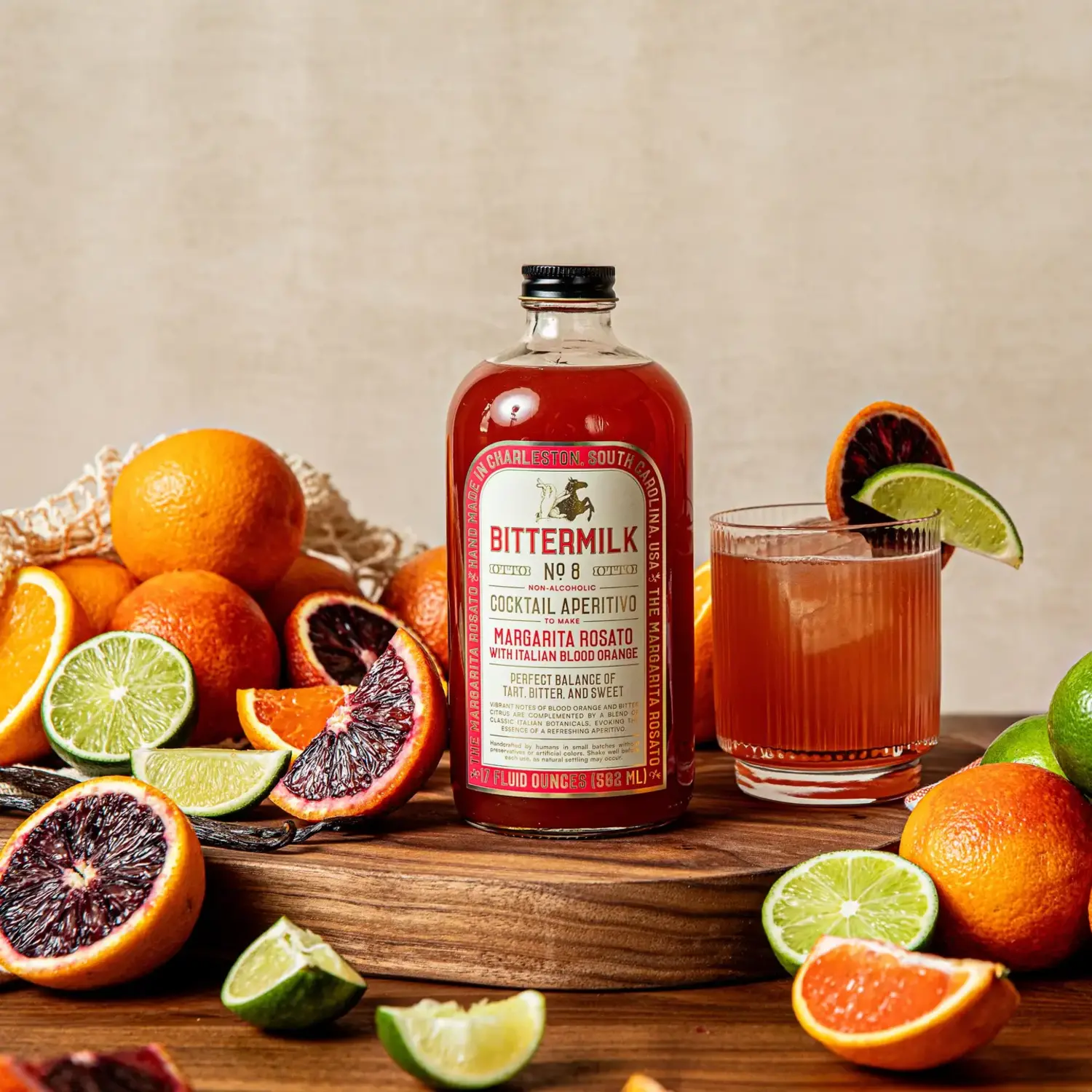 Bittermilk No.8 Margarita Rosato is a non-alcoholic mixer that honors the proportions of a margarita, but is built with Italian blood orange and lime with subtle hints of gentian, rhubarb and orange peel, reminiscent of a classic Italian Aperitivo.