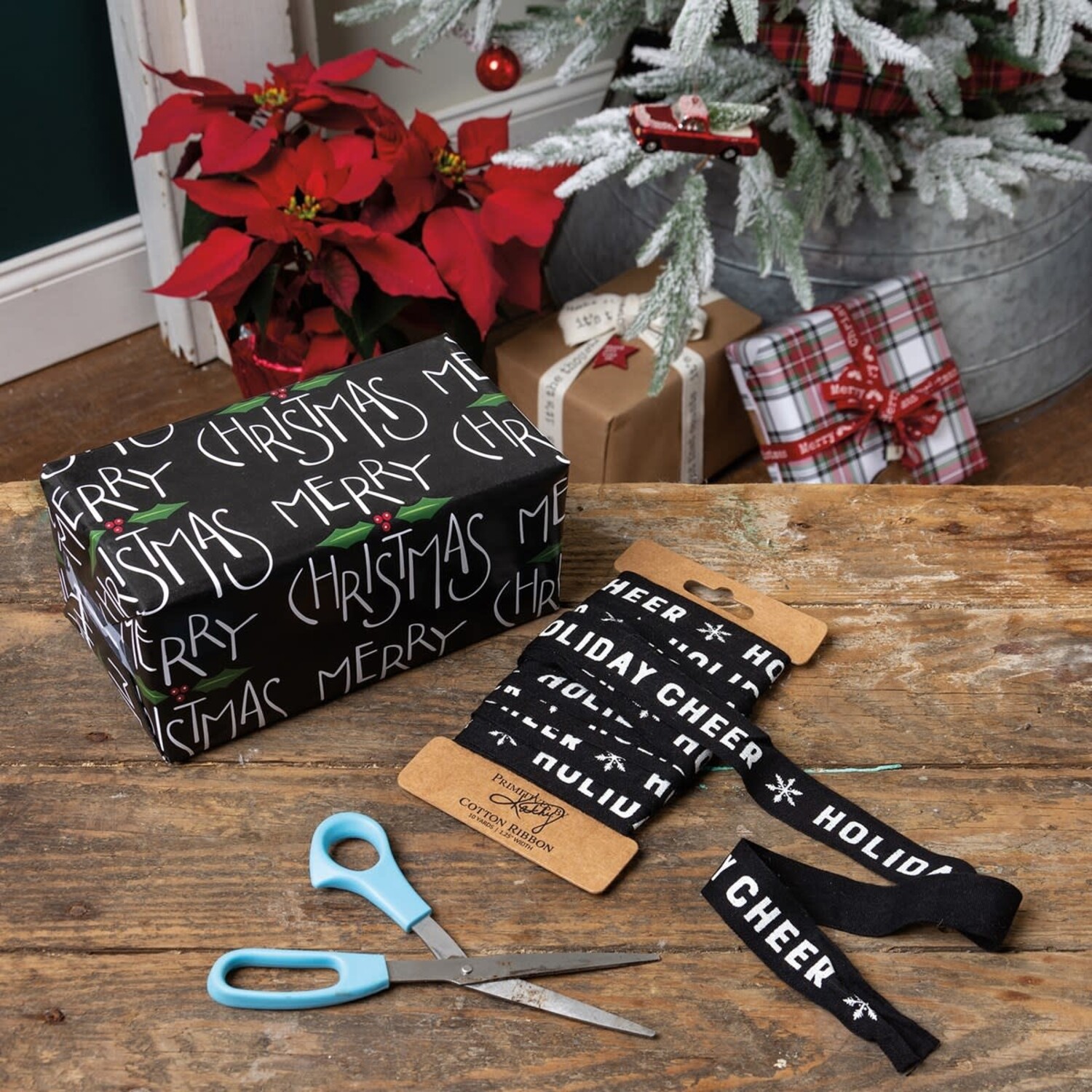 A charming touch for the holidays, a cotton ribbon featuring hand lettered "Holiday Cheer" sentiments in a bold palette to add a unique element to gifts!