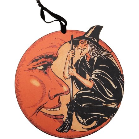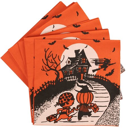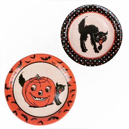 Featuring a full wrap-around vintage design of a Jack O' Lantern and black cat with orange stripes and bat patterns at the top and bottom.