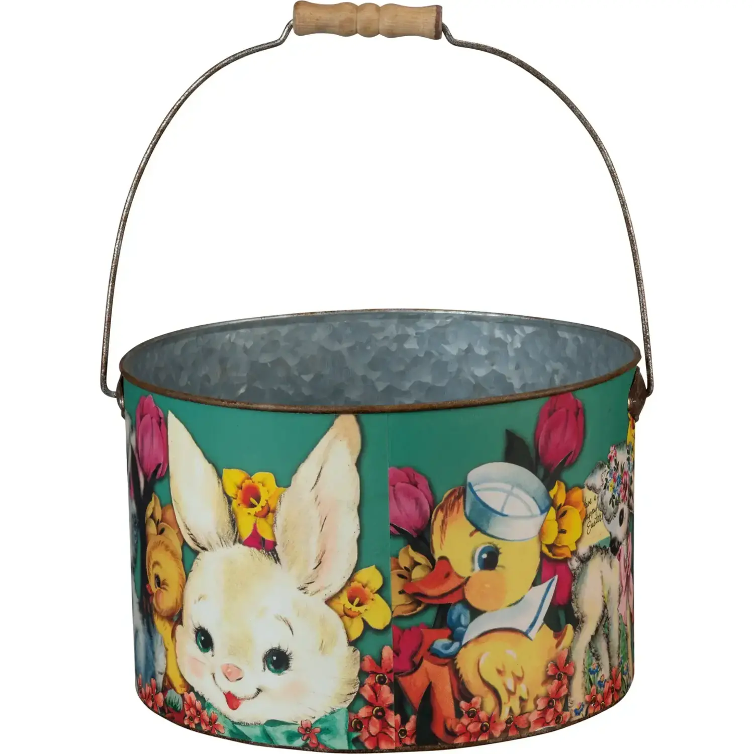 Tin buckets featuring wrap-around vintage-inspired spring themed animal designs.