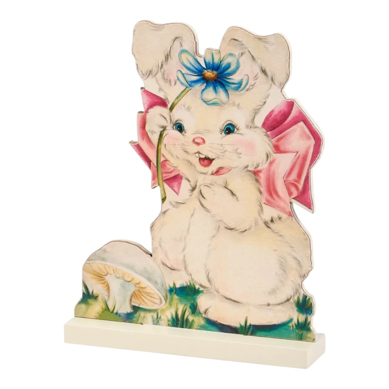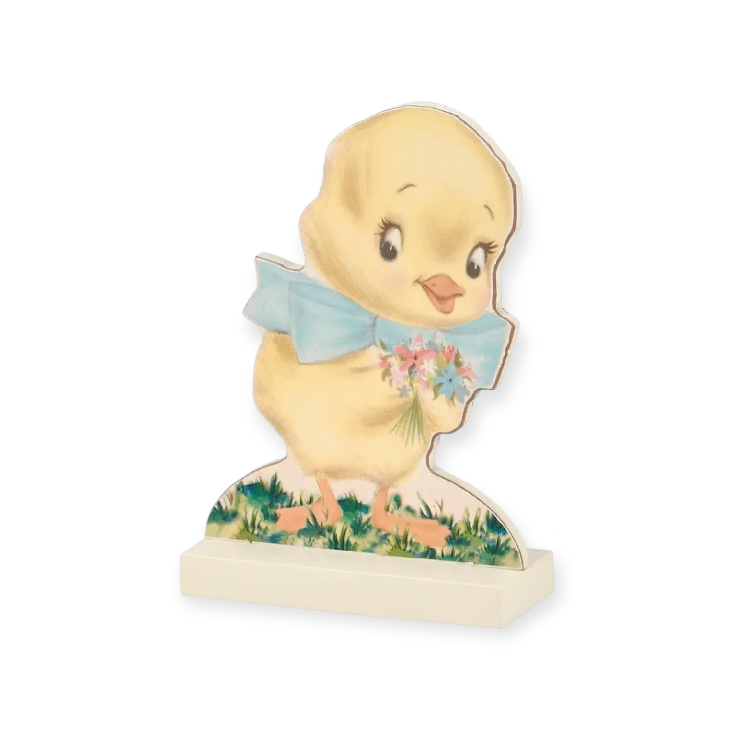 Wooden stand ups from the Easter & Spring Collection displaying individual cutout designs of a bunny and a chick in a fun vintage art style.