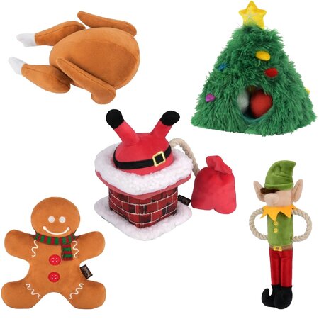 This festive red truck is packed with fun surprises—squeaks, crinkles, and a tree attached to a rope for added excitement.