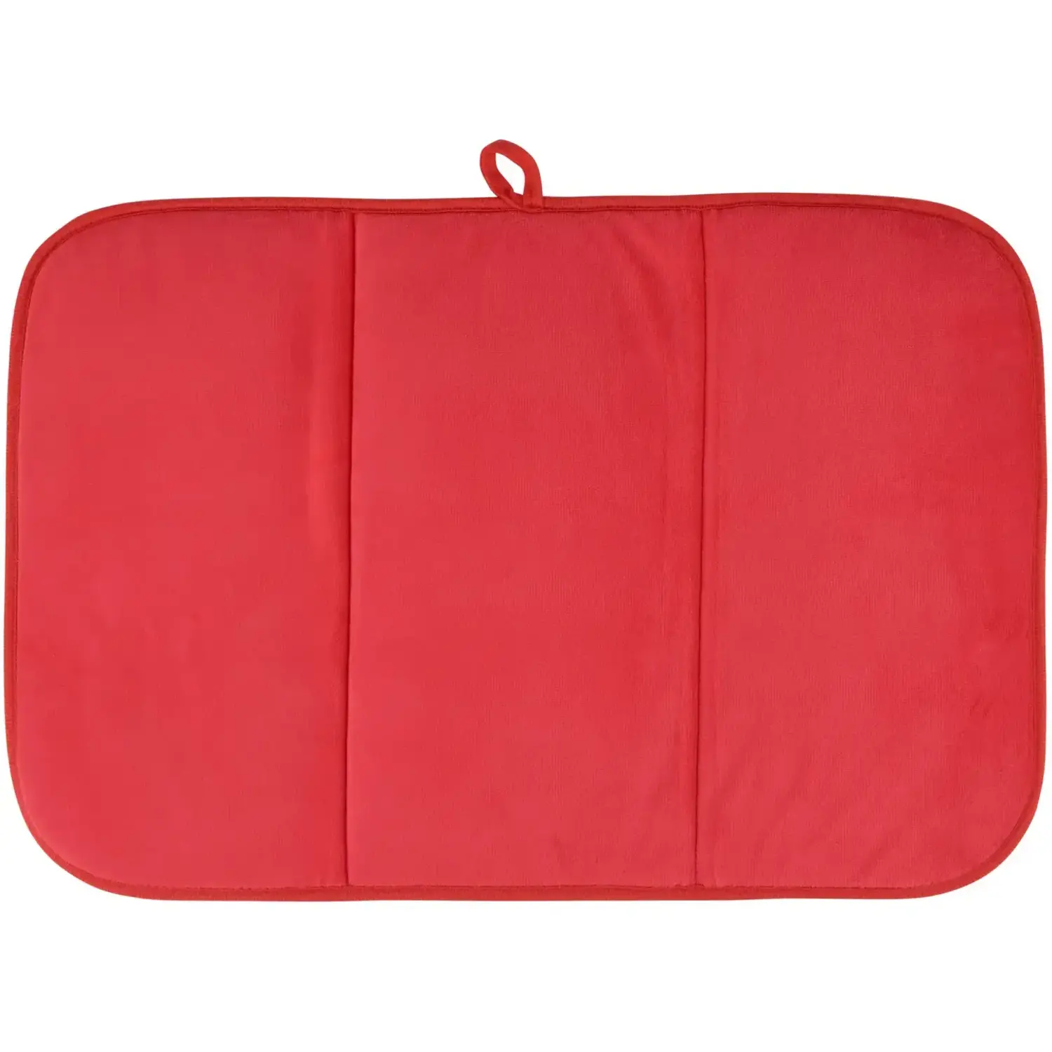 Seasonal drying mat features full color design on the 21 inch by 14 inch space to place items to dry with coordinating red color on the back and trim.