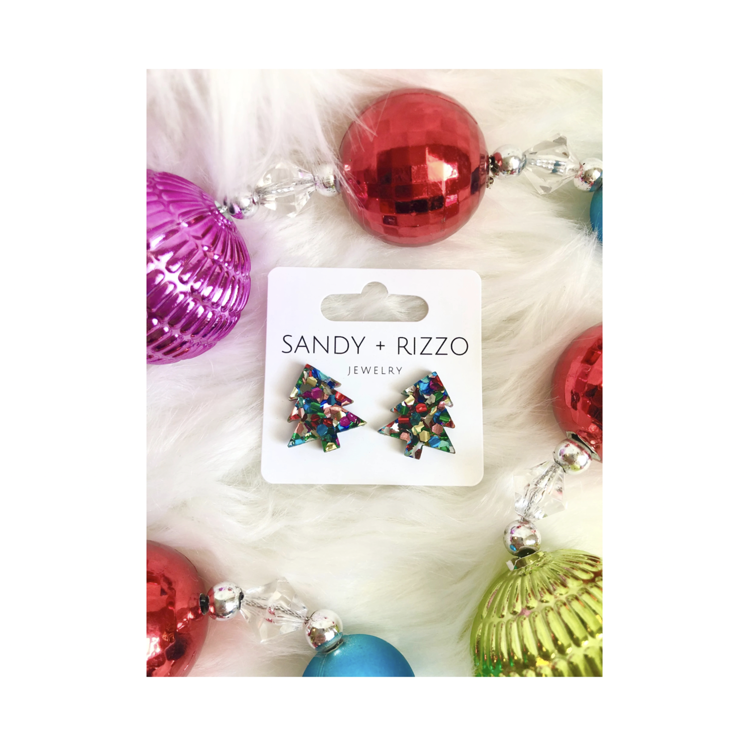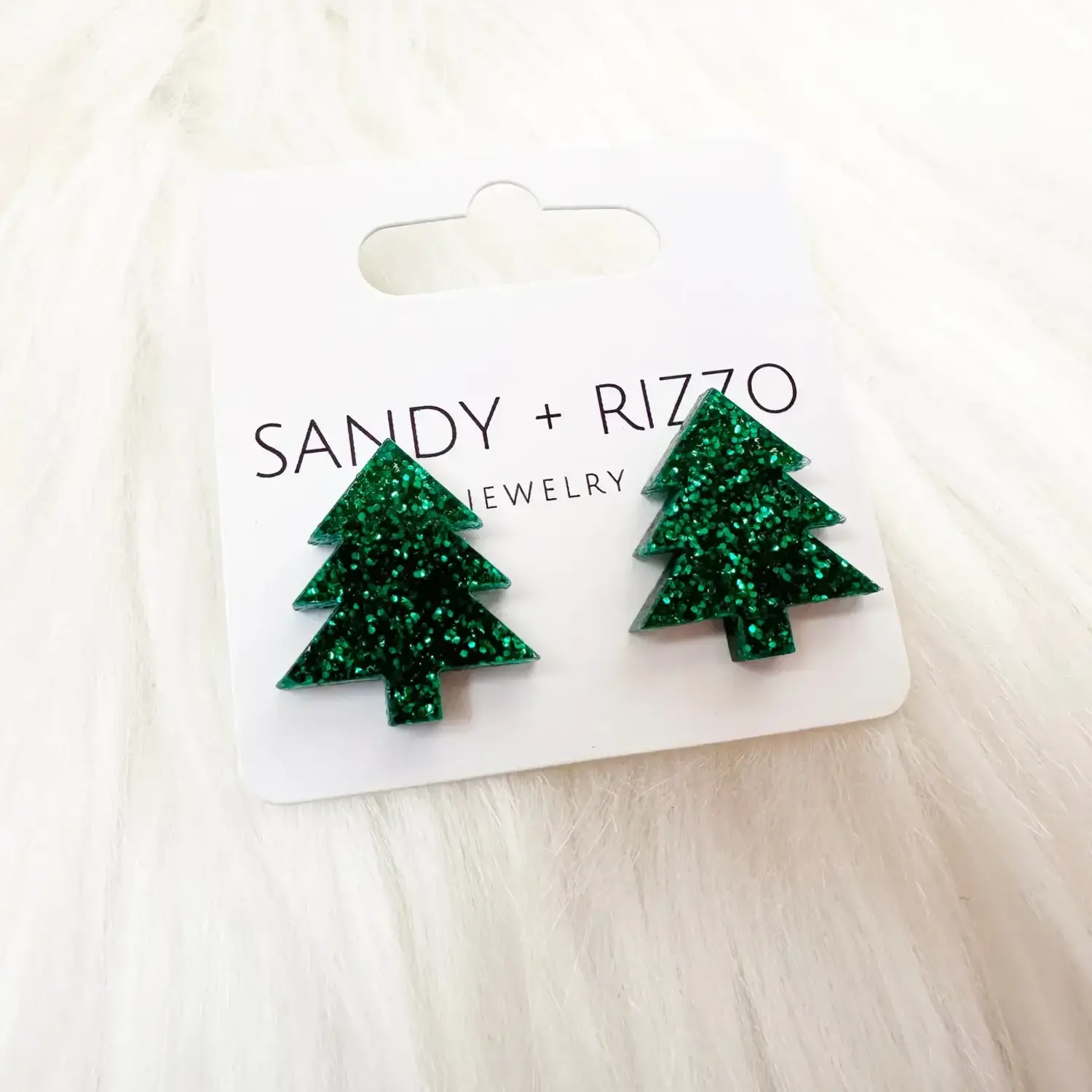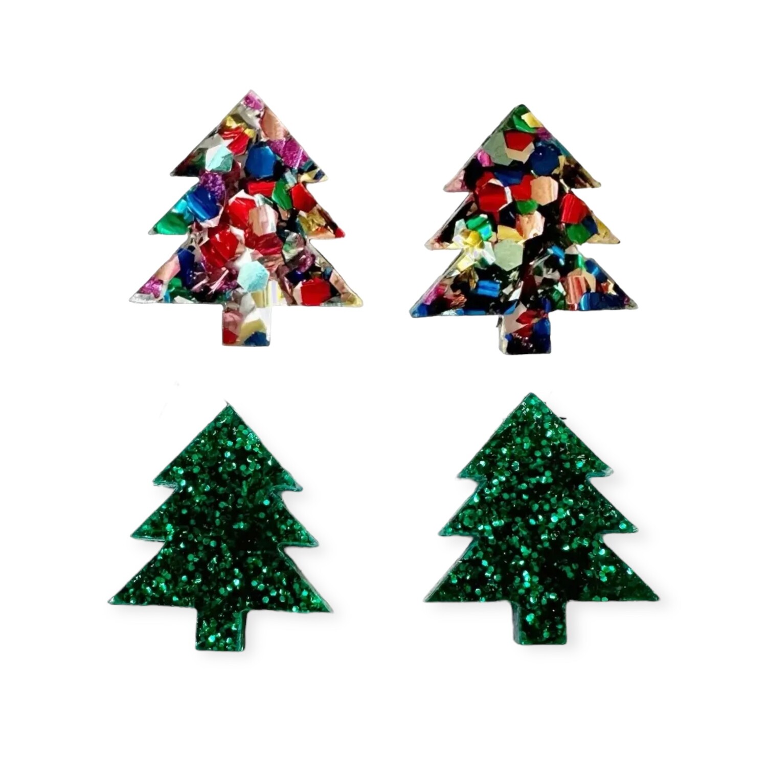 Deck the halls with sparkly Christmas tree statement earrings featuring confetti or glitter decoration.