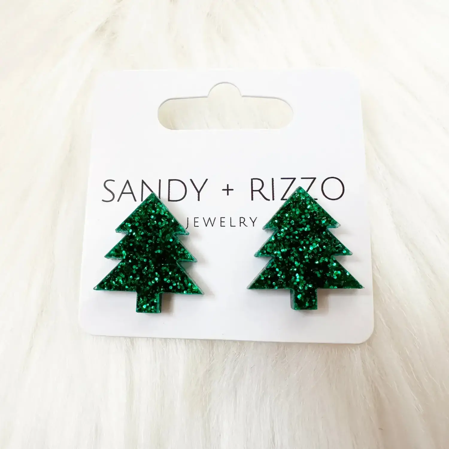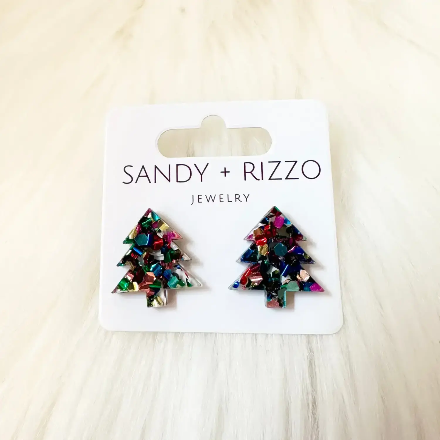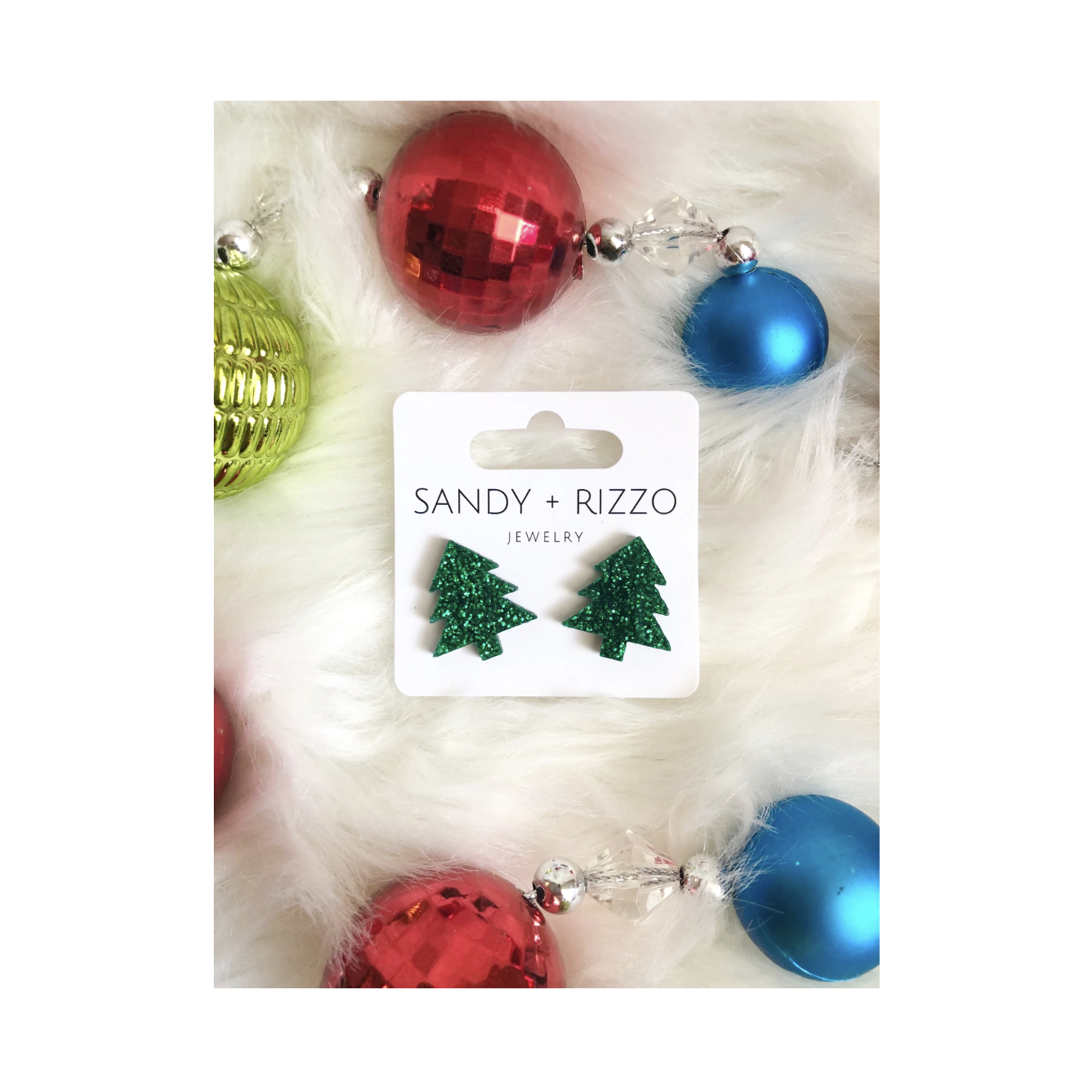 Deck the halls with sparkly Christmas tree statement earrings featuring confetti or glitter decoration.