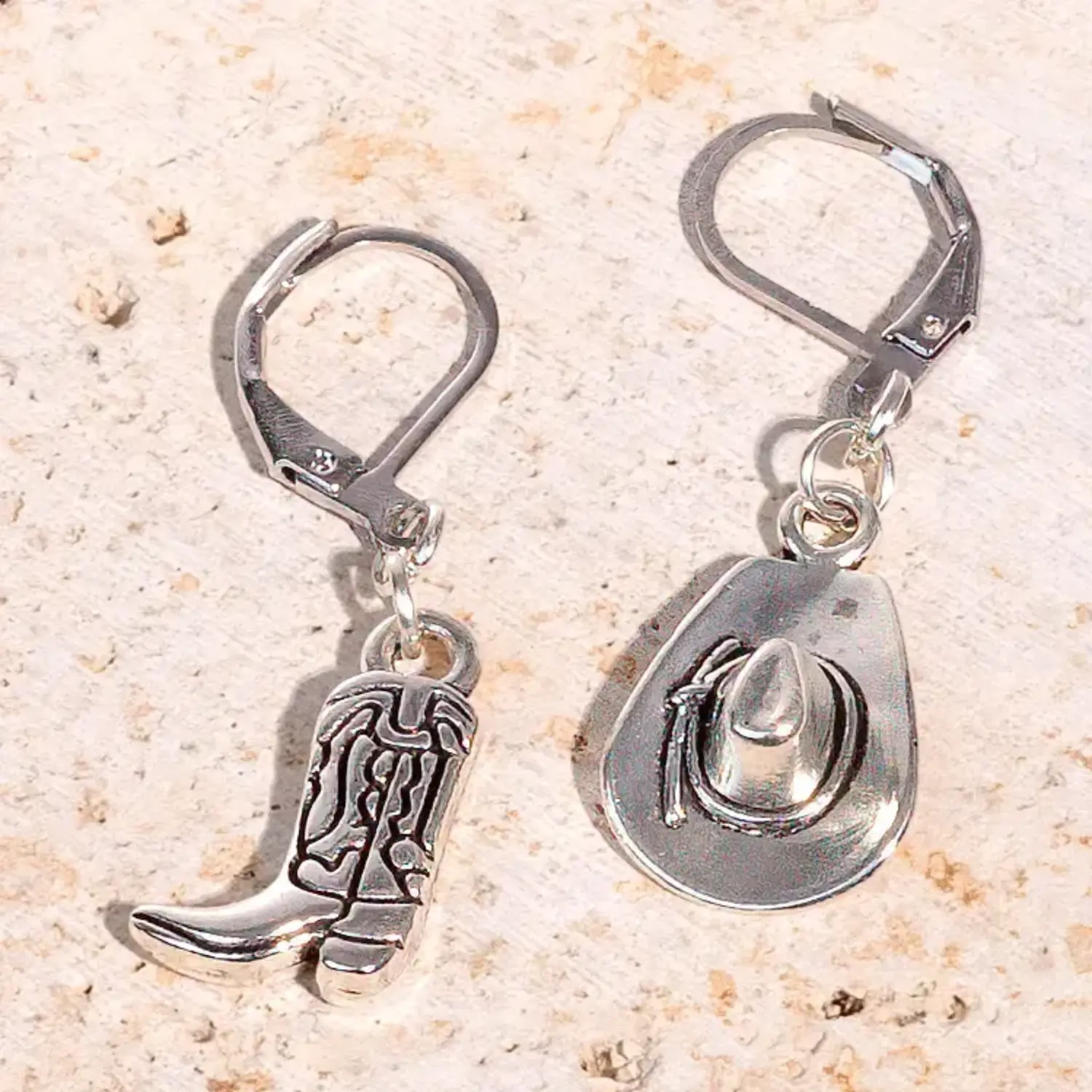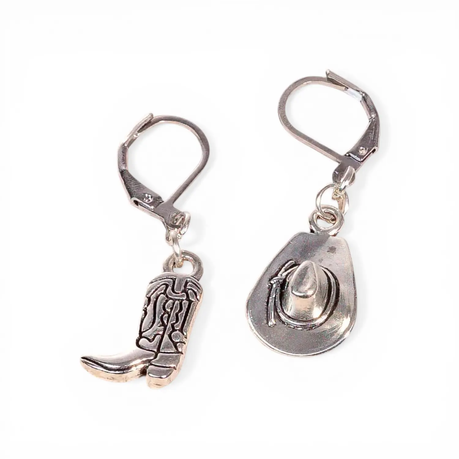 This playful mismatched set features two meticulously detailed charms—a classic cowboy hat and a finely stitched boot—hanging from sleek, hypoallergenic hoops.