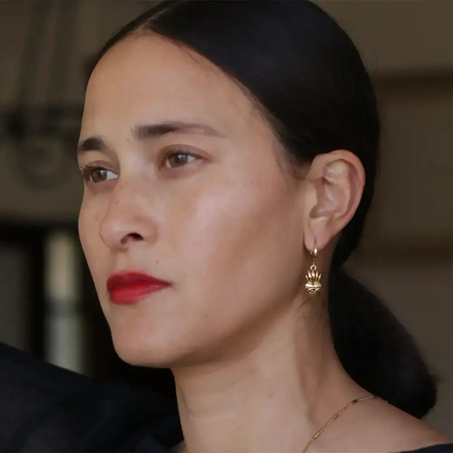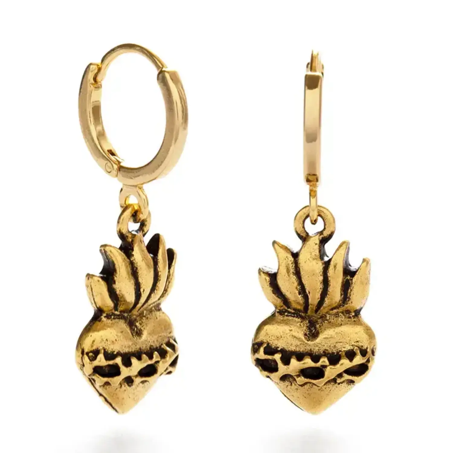 Sacred heart charm suspended from huggie hoops.