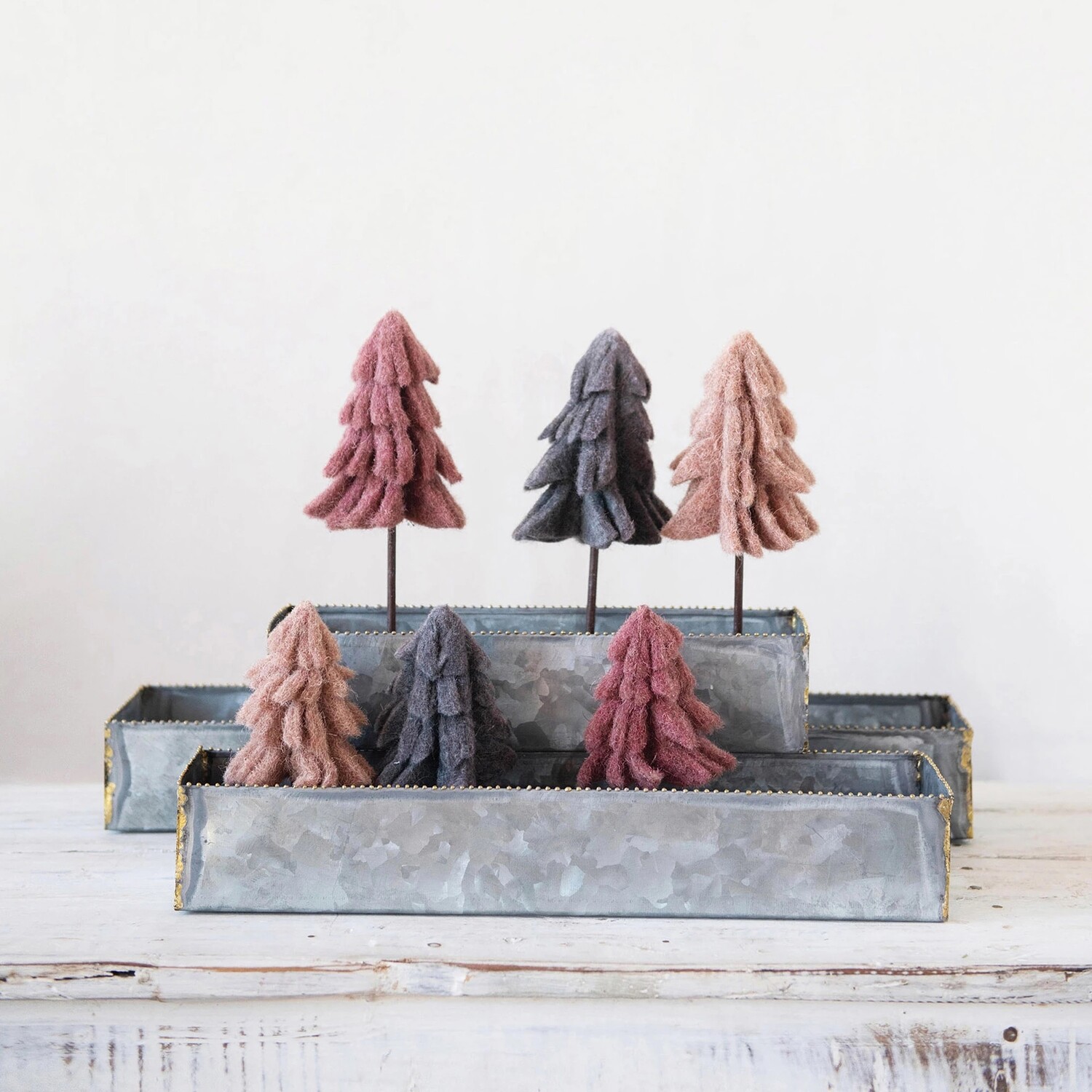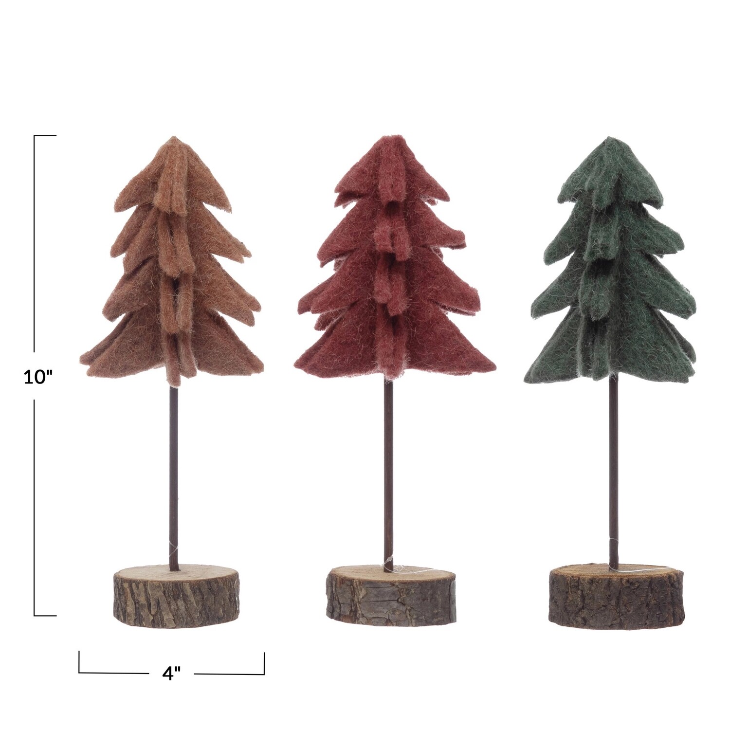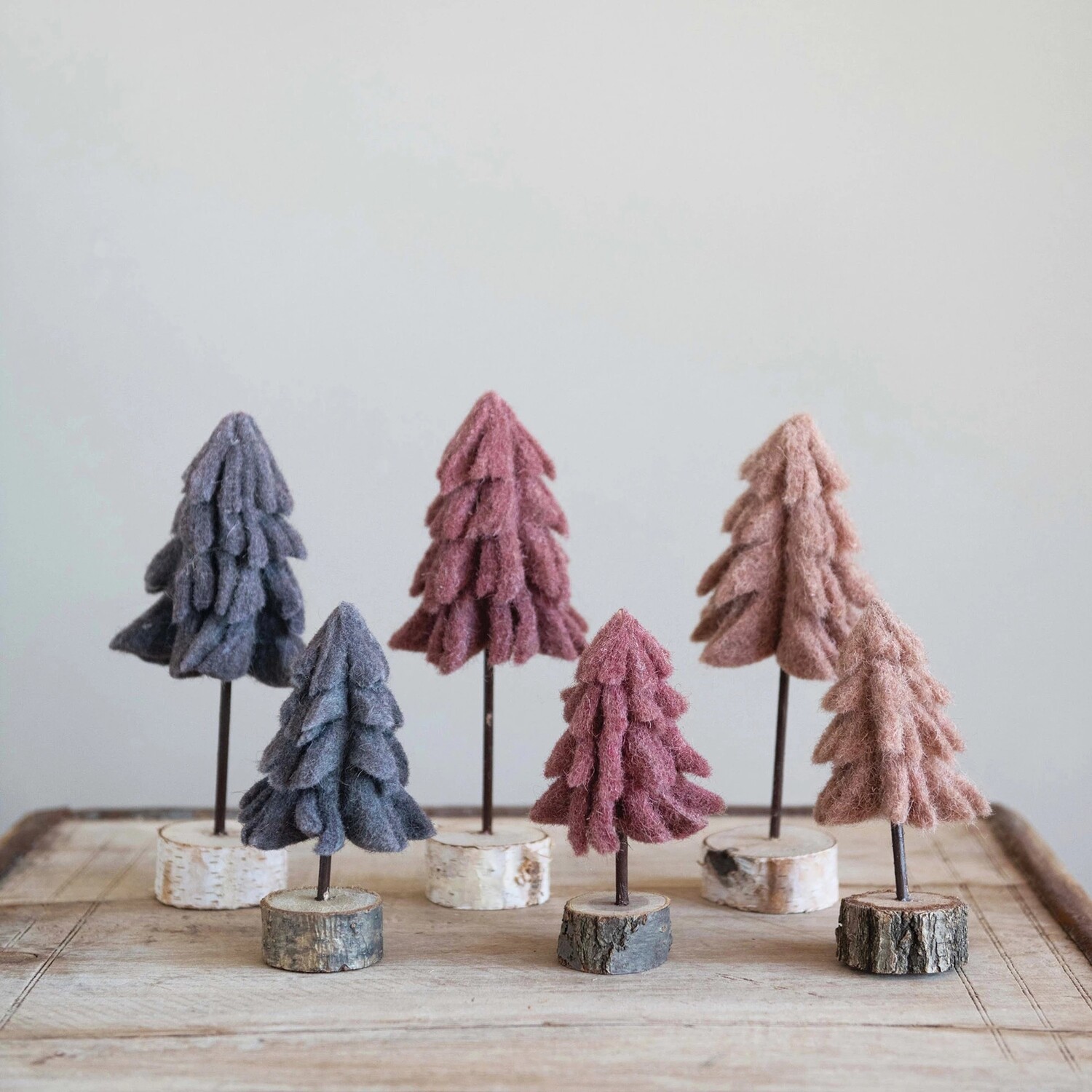 Made out of sustainable felt, these trees each come in a festive color with a wooden base.