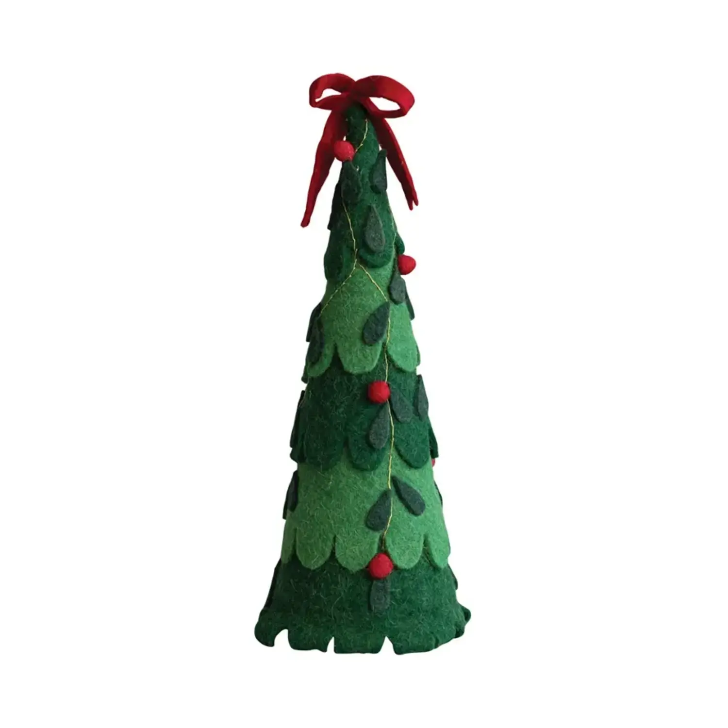 Add a whimsical touch to your holiday décor with this handmade wool felt tree, adorned with a festive red bow and playful pom poms in classic green and red.