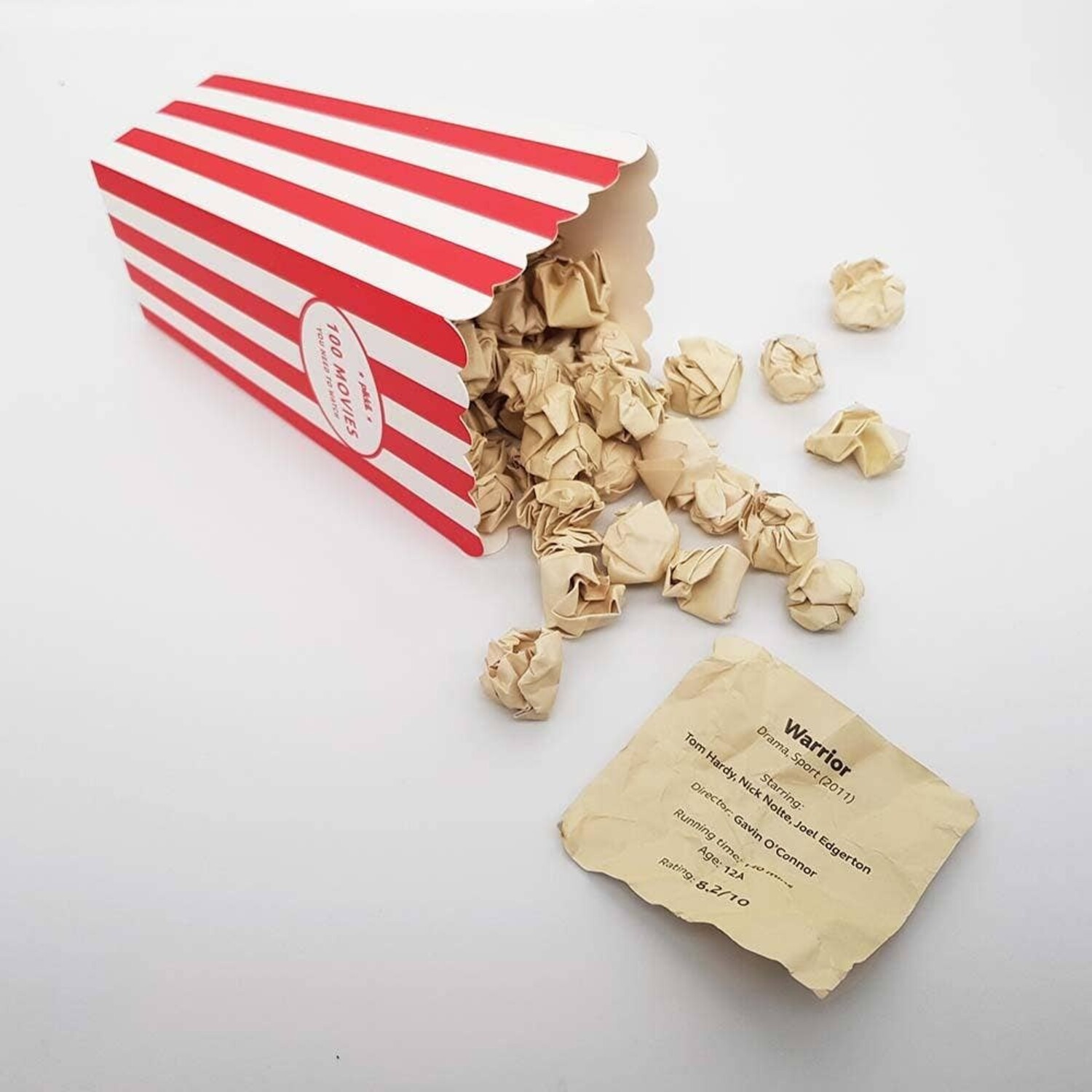 The mini retro popcorn box contains 100 pieces of “popcorn” each featuring one of the greatest movies of all time.