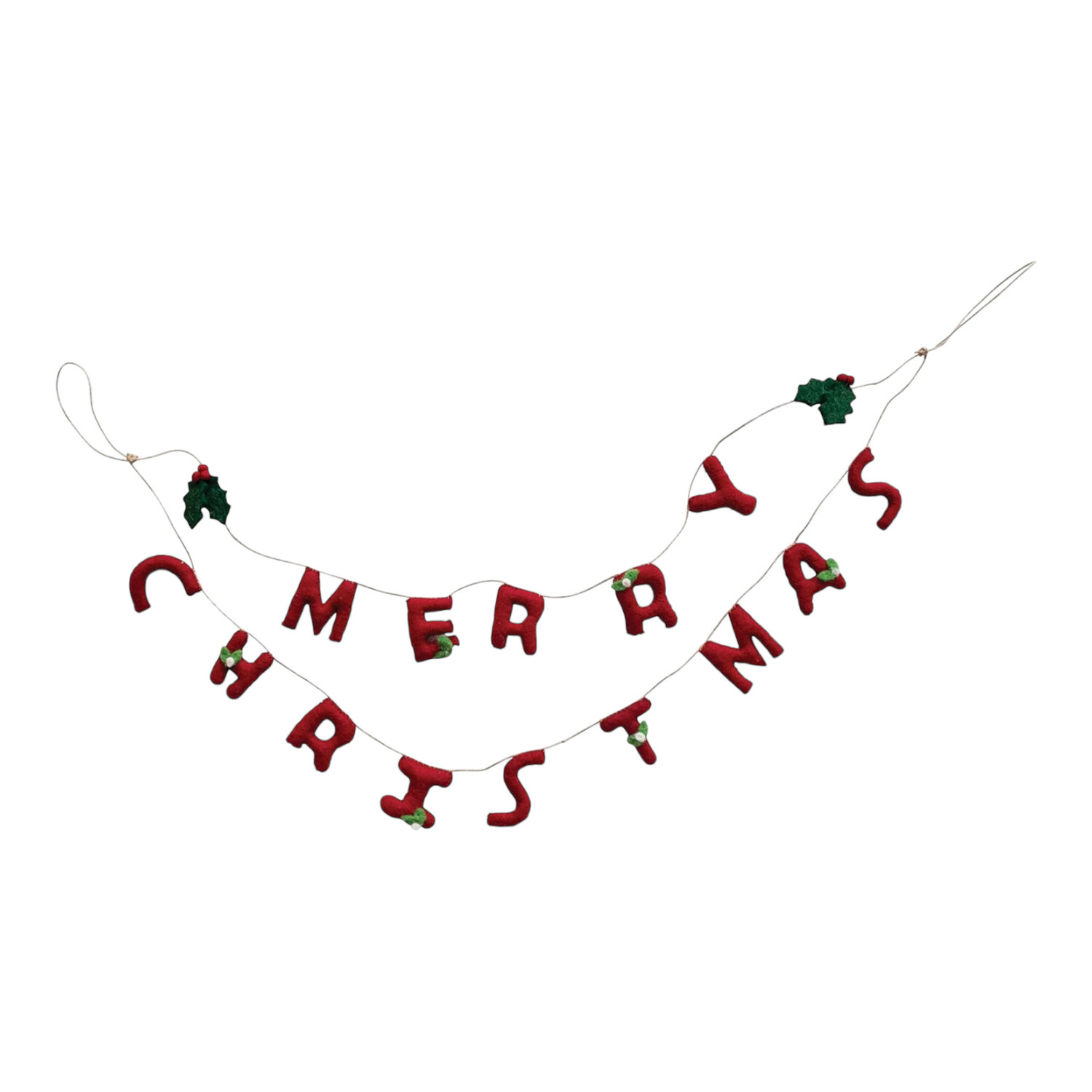 This handcrafted garland is a celebration of the holiday spirit, featuring lush wool felt holly leaves and bright red berries that spell out "Merry Christmas."