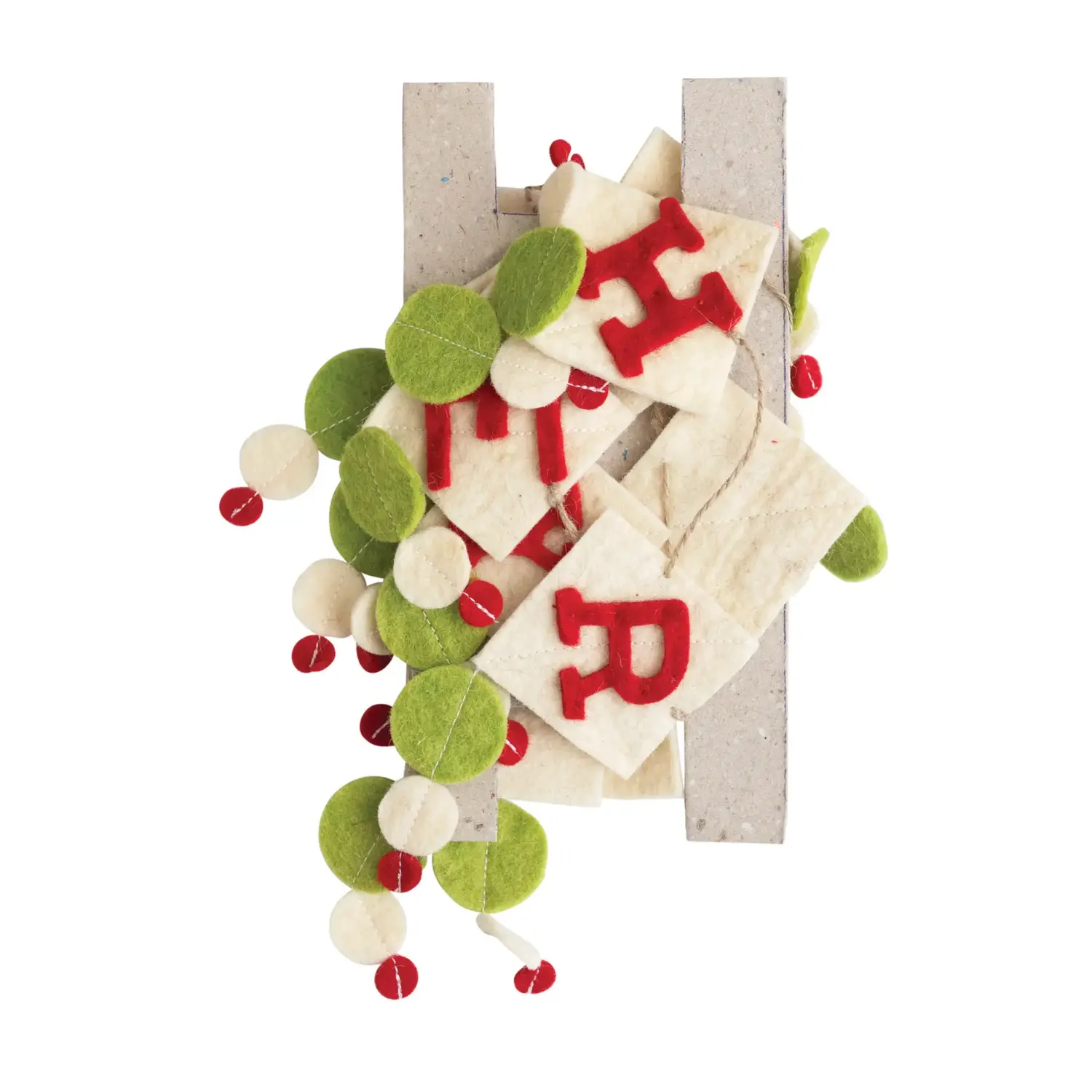 This festive "Merry Christmas" garland, crafted from 100% sustainable wool felt, features a delightful mix of red, white, and green colors with diamond and circle-shaped cut-outs.
