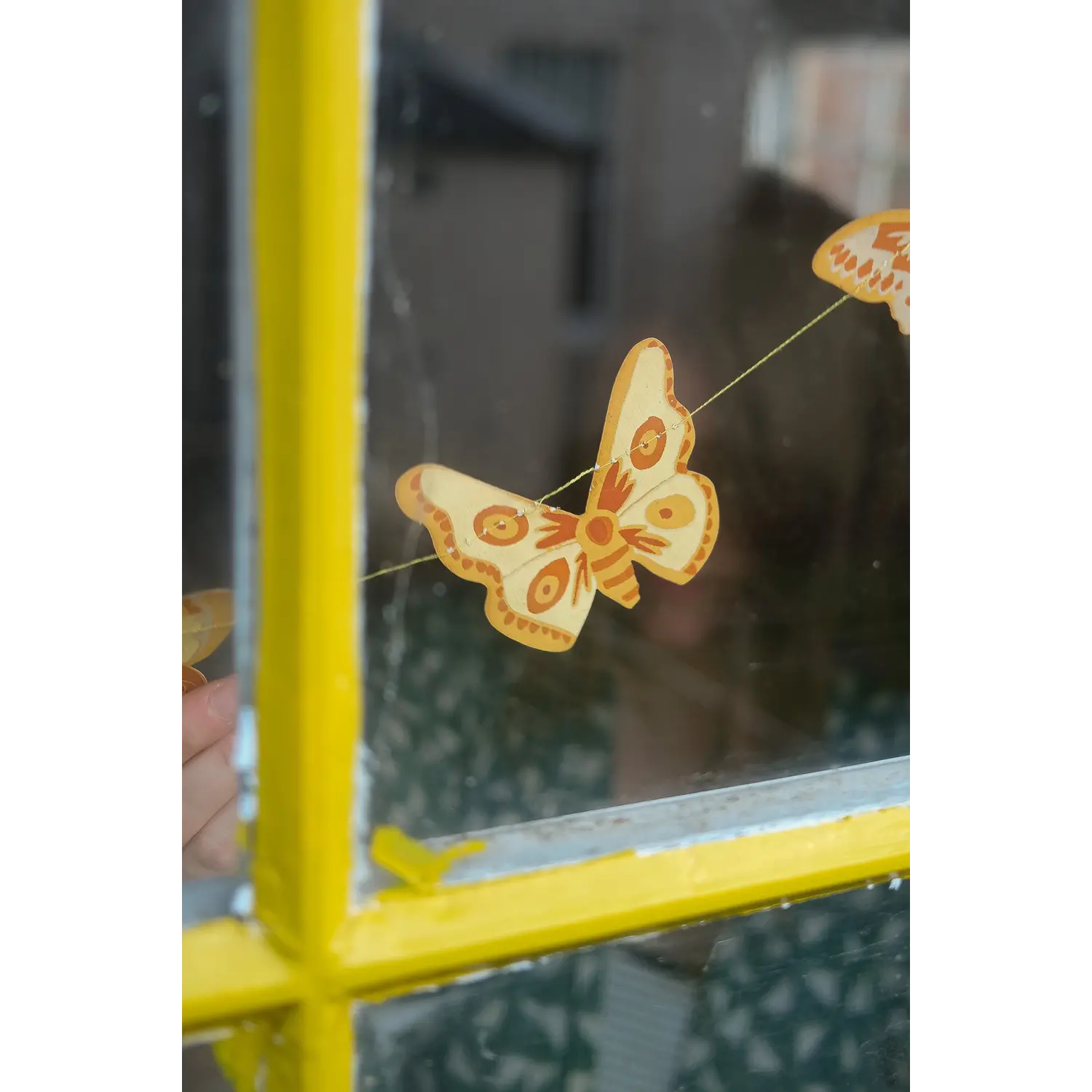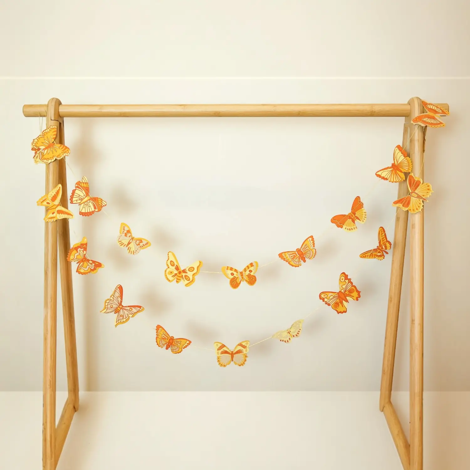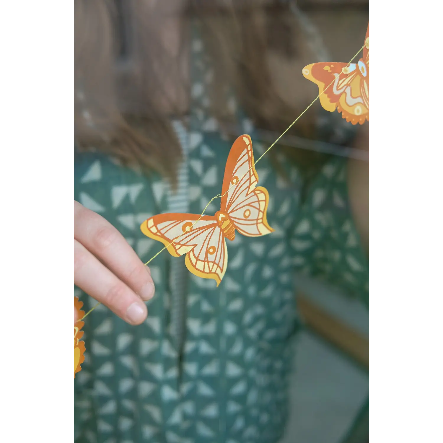 Butterflies with decorative patterned wings in muted yellows, rich oranges, and warm whites adorn this garland.