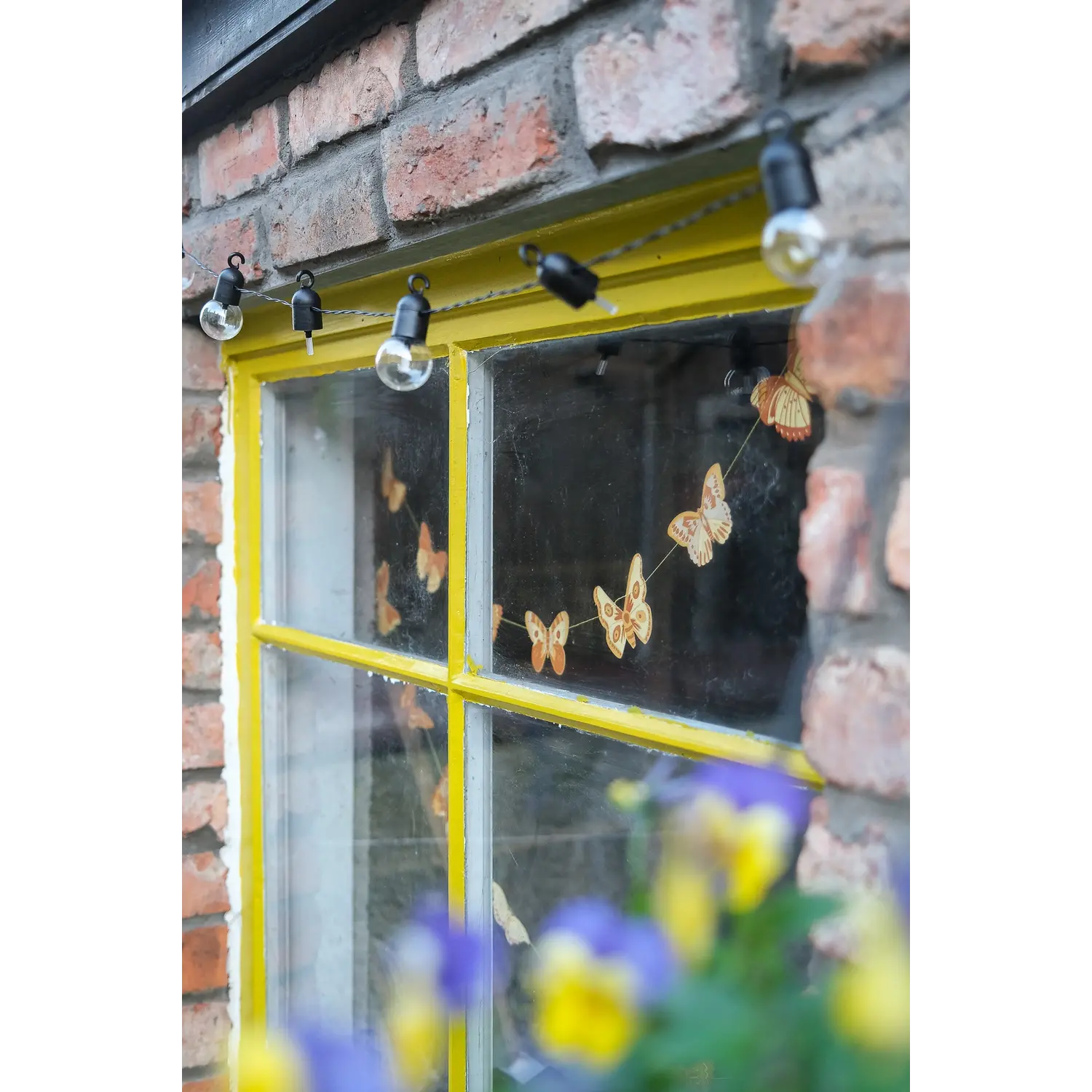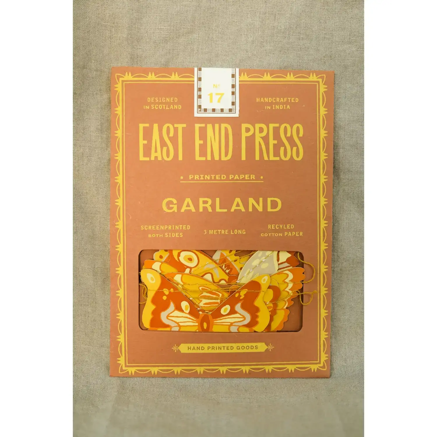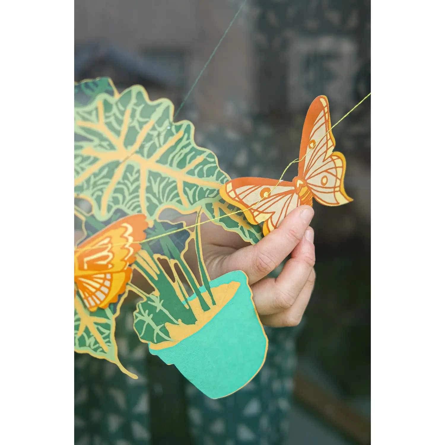 Butterflies with decorative patterned wings in muted yellows, rich oranges, and warm whites adorn this garland.