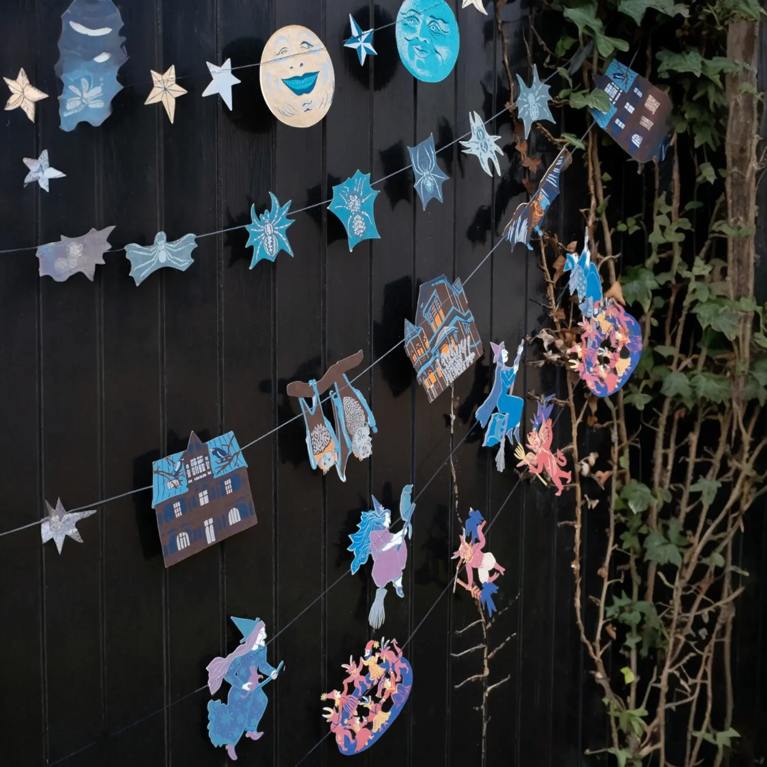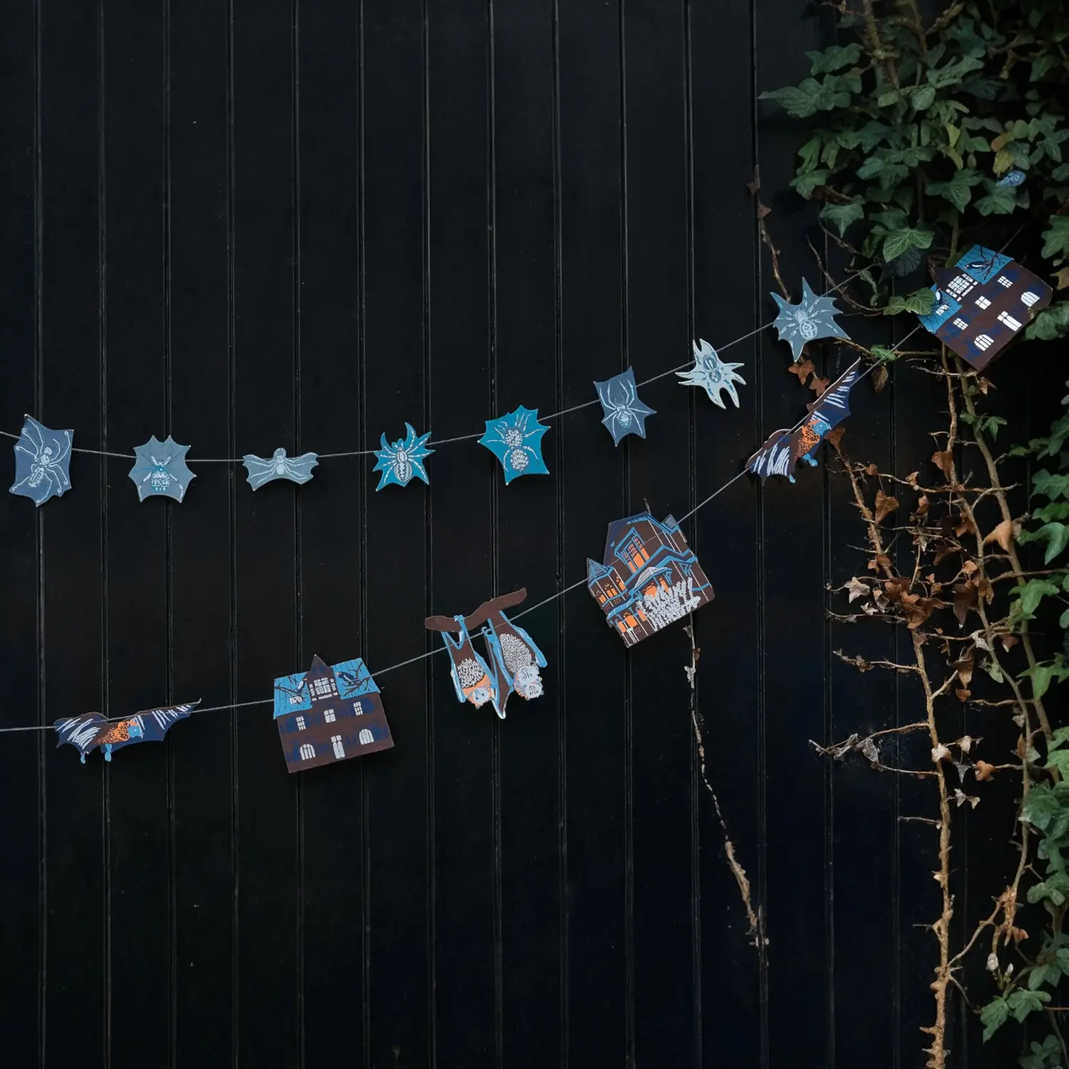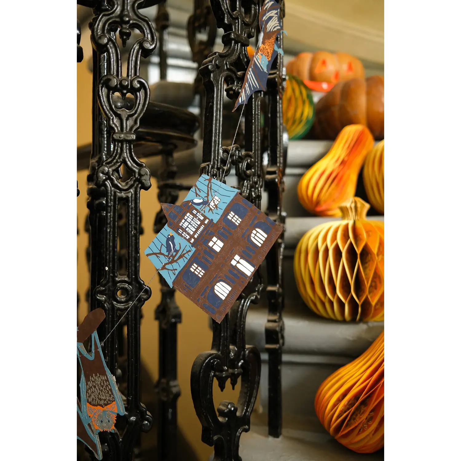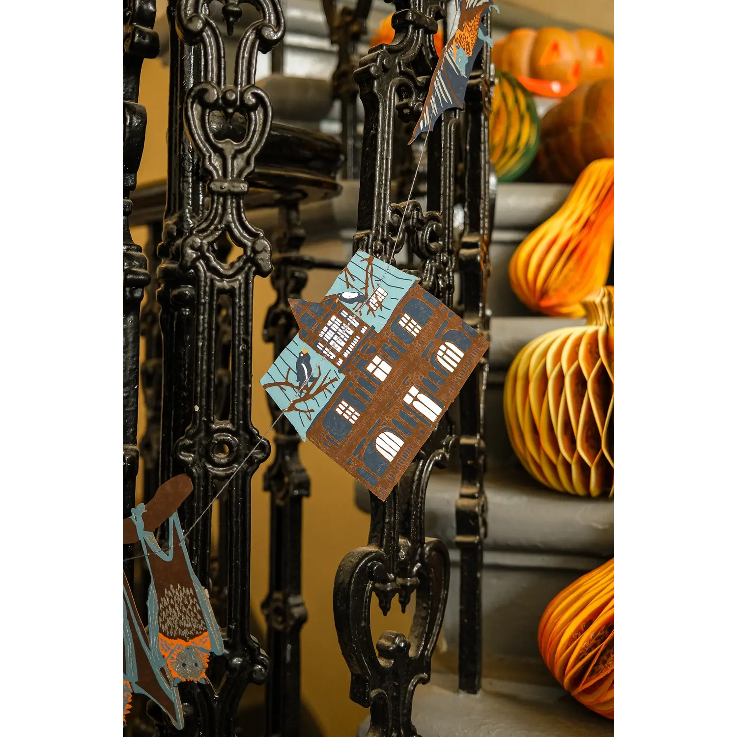 Haunted houses, moons and bats are spread along this garland, perfect for adding some spookiness and enchantment to your Halloween decor!