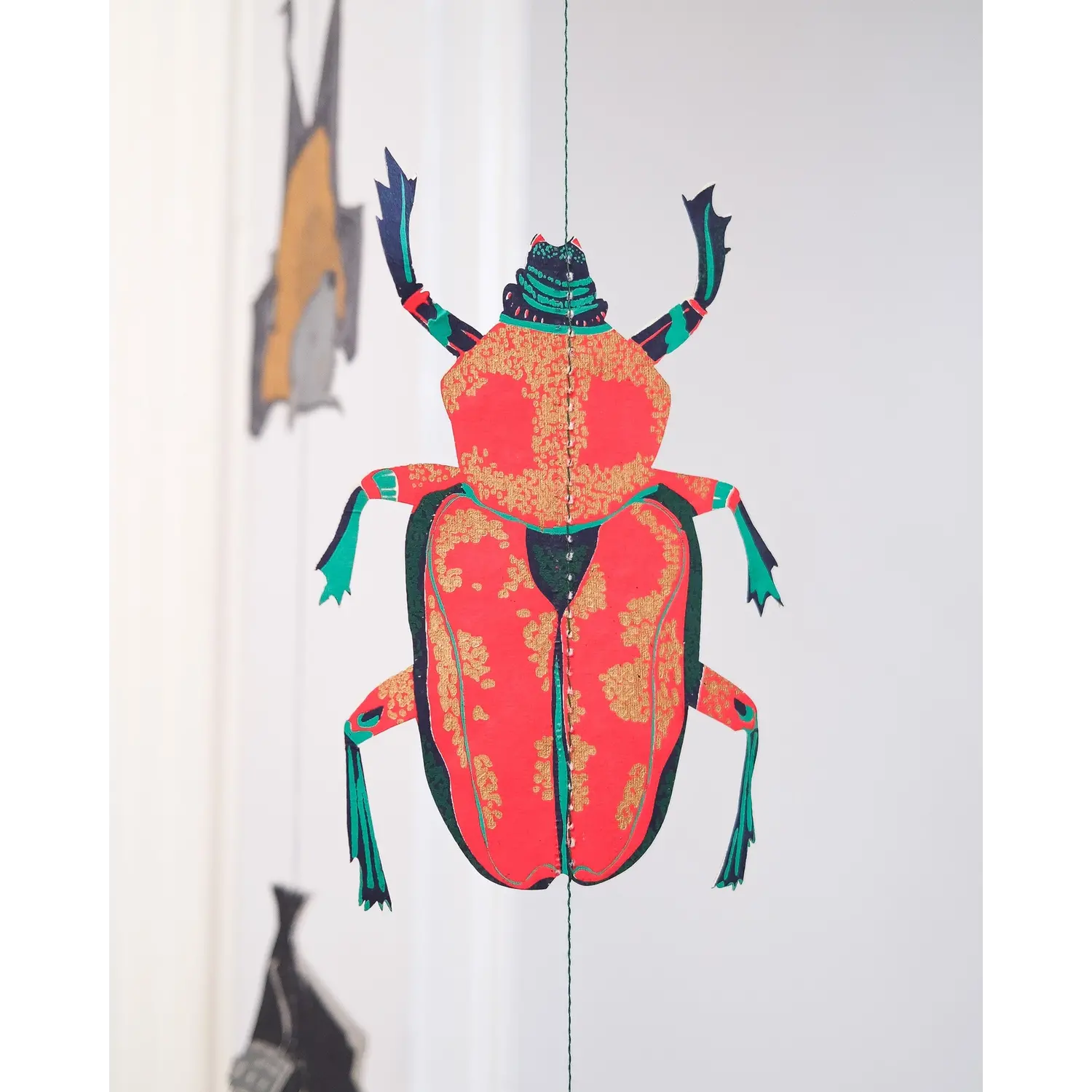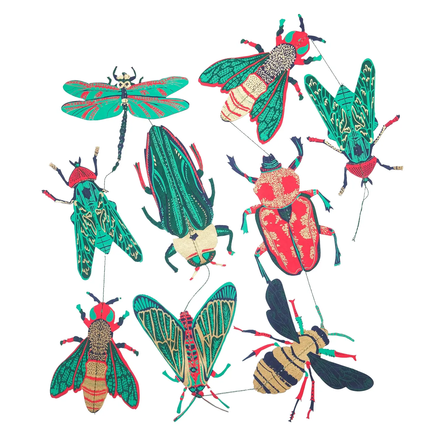 An East End Press classic, this vertical hanging garland is hand-sewn along 6.6 ft cotton thread and features 9 original bugs adorned with golden flourishes.