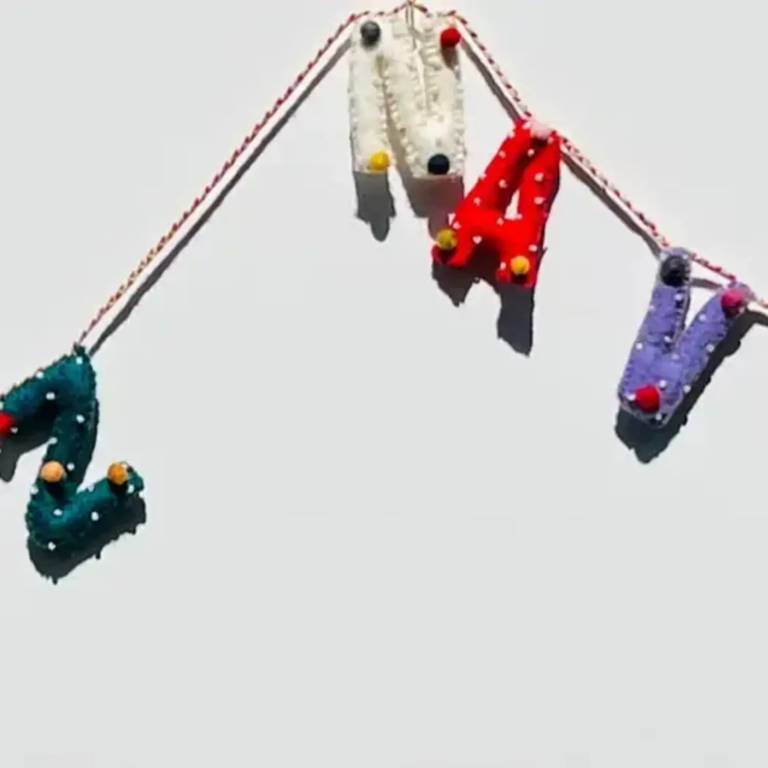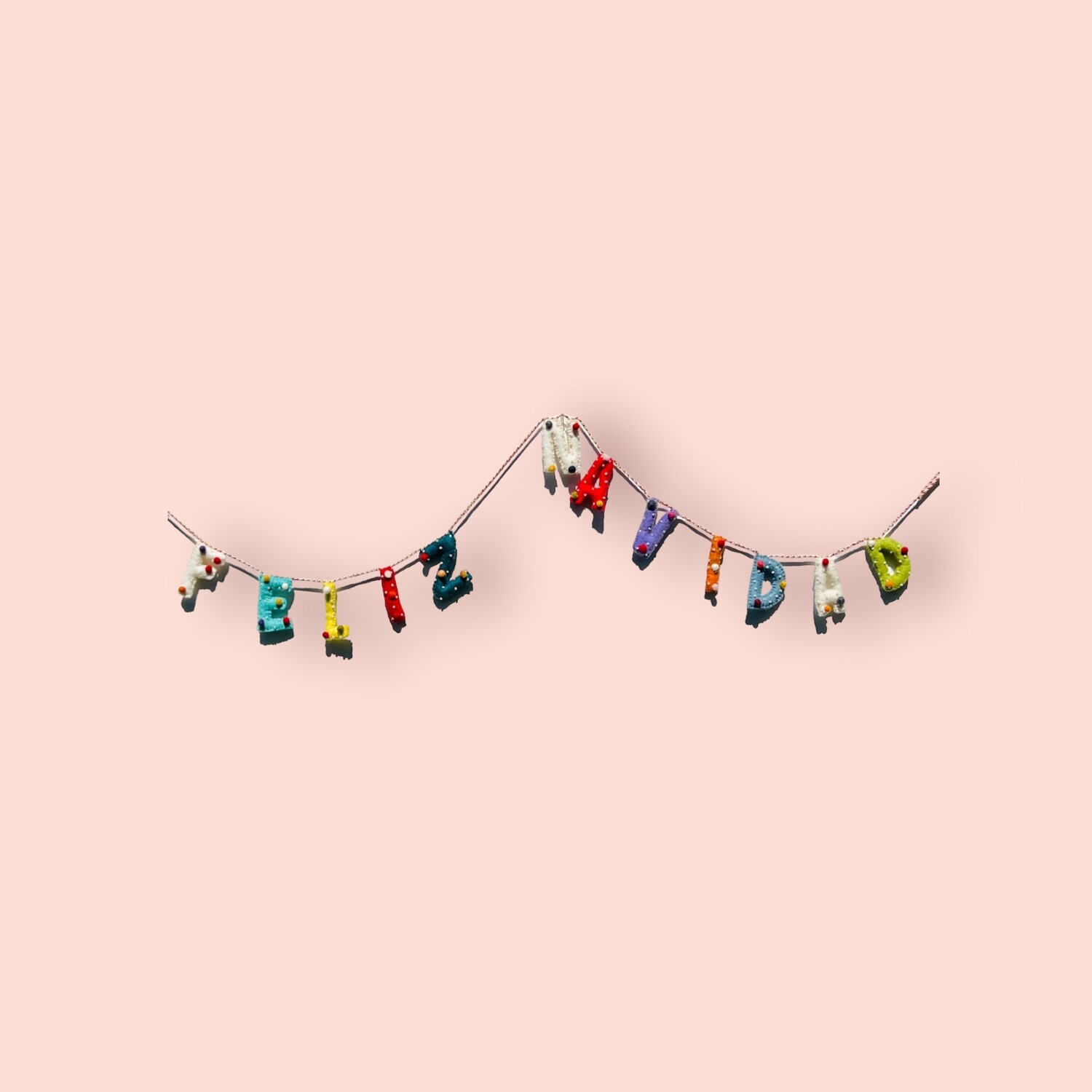 Bubble letter garland made with sustainable wool felt, beaded and adorned with pom-poms.