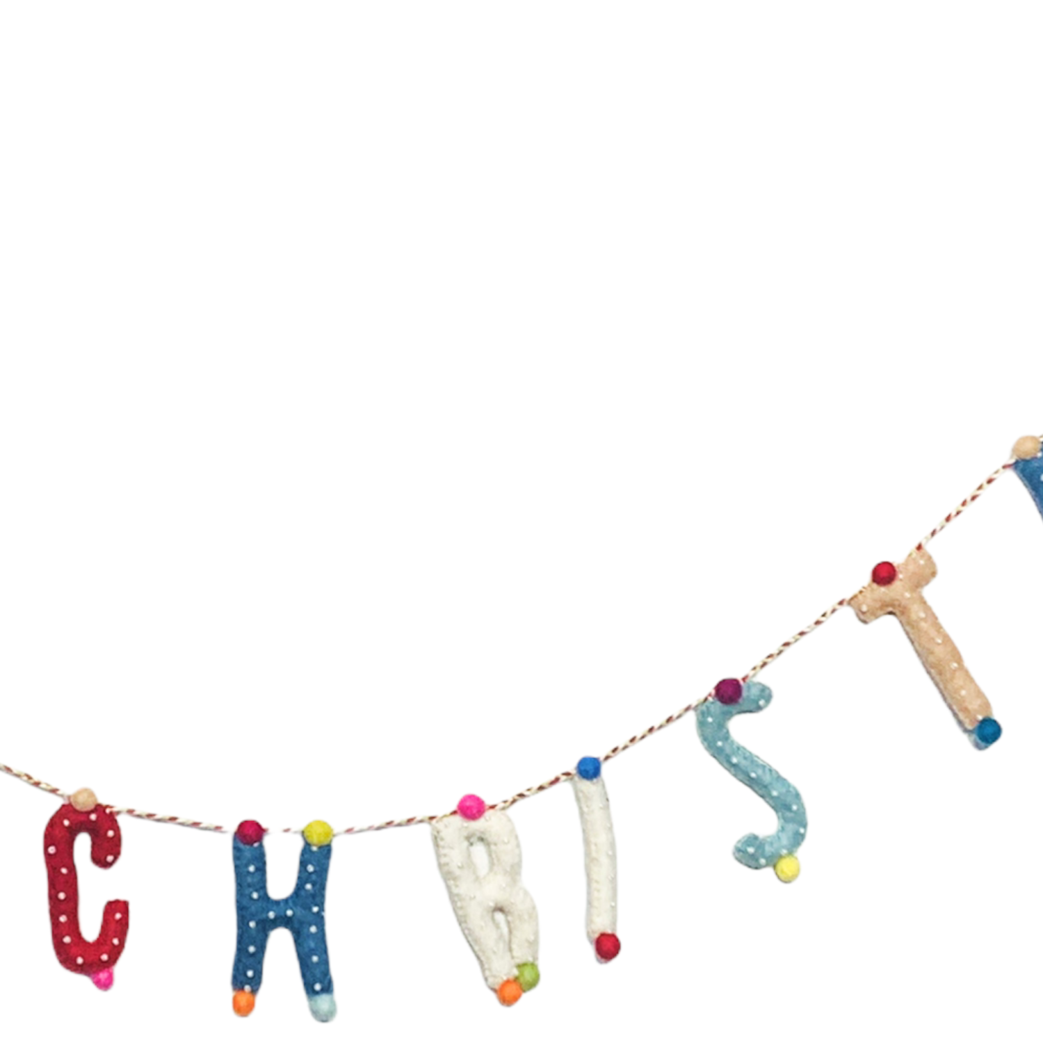 Strung on heavy thread, the felt letters measure approximately 2” and feature dots and poms details.
