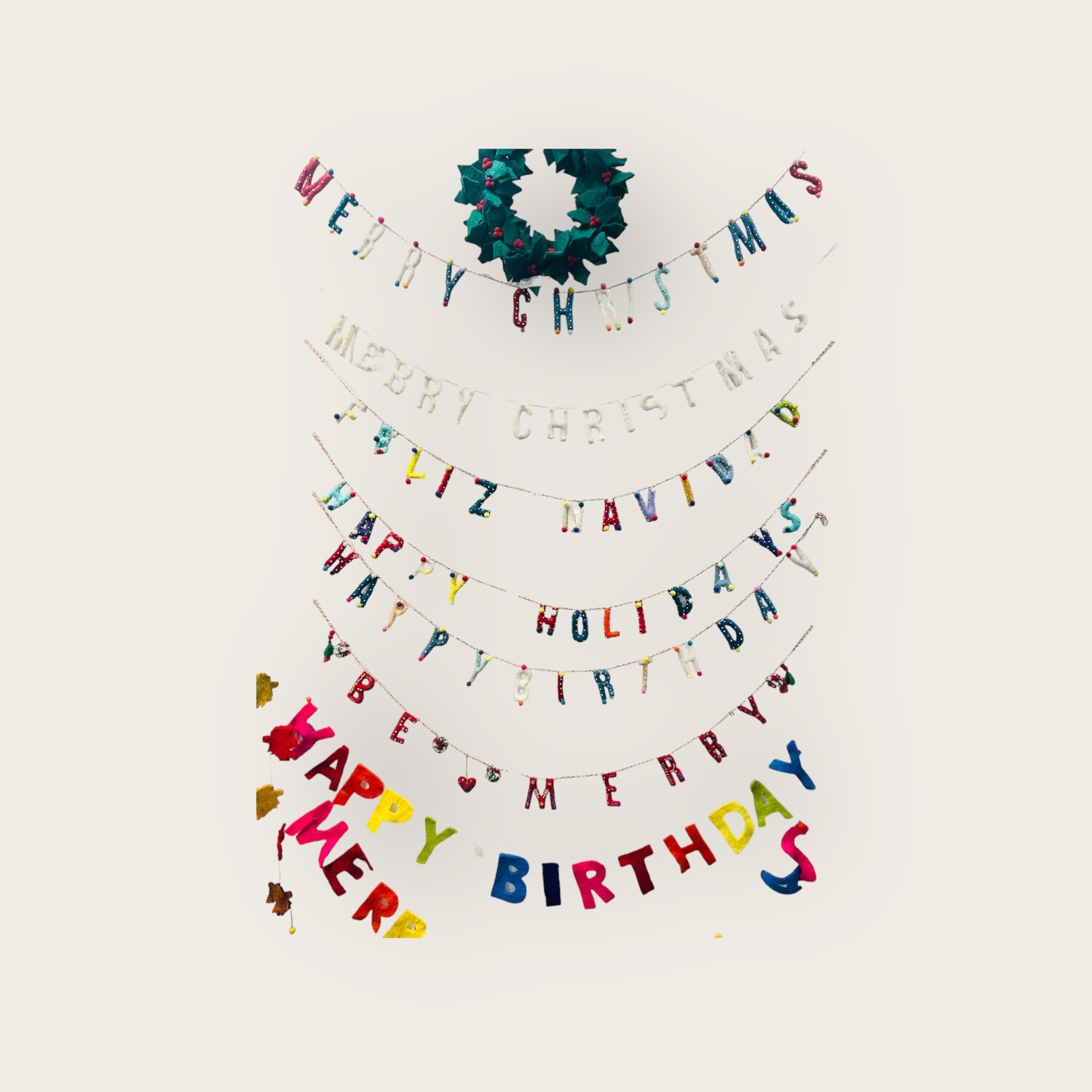 Individually handmade by Nepalese women's cooperatives, Giftsland Felt Merry Christmas Garlands add a festive flair to any space or gathering.