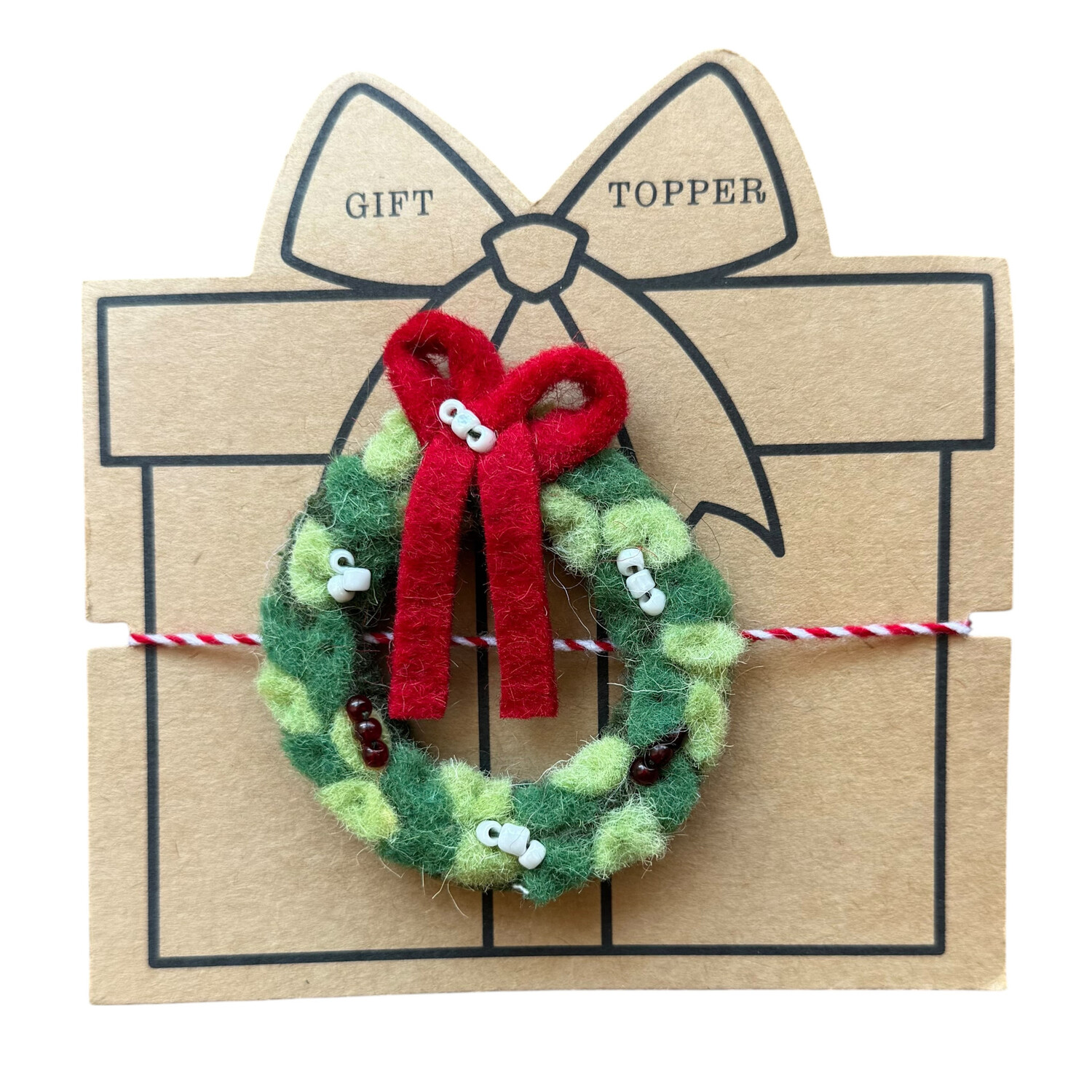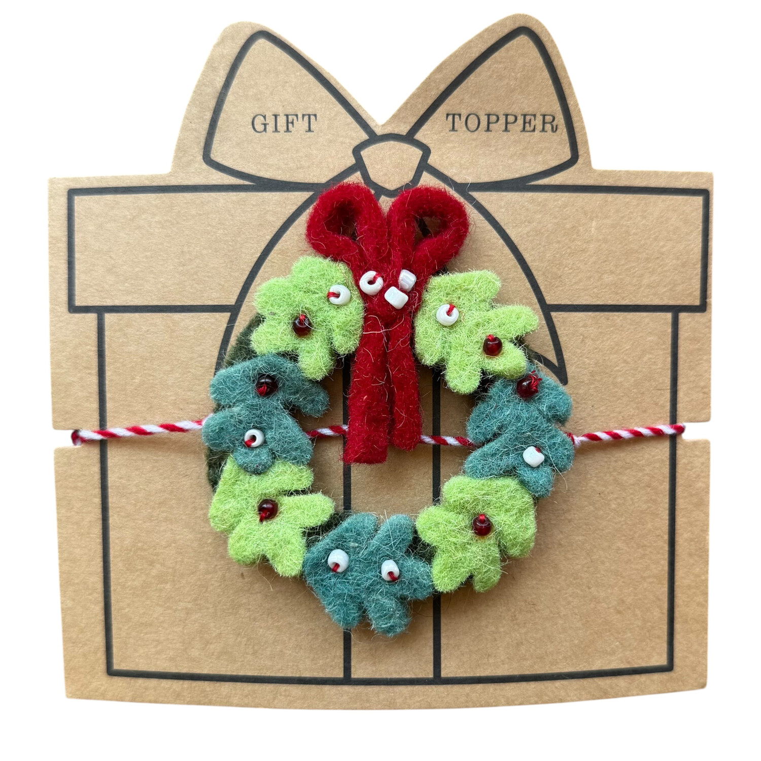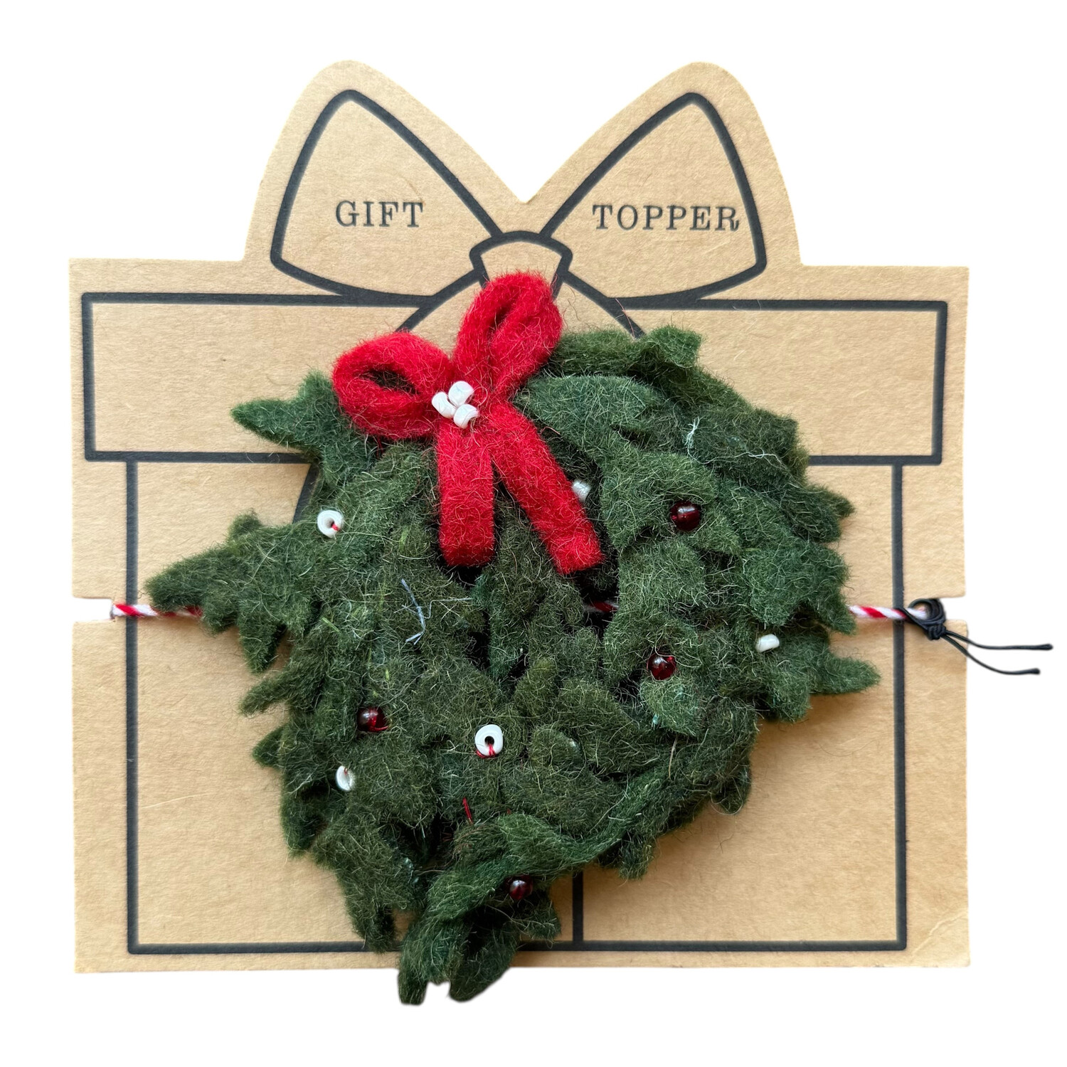 Add a touch of handmade charm to your holiday wrapping with this delightful wool felt wreath gift topper.