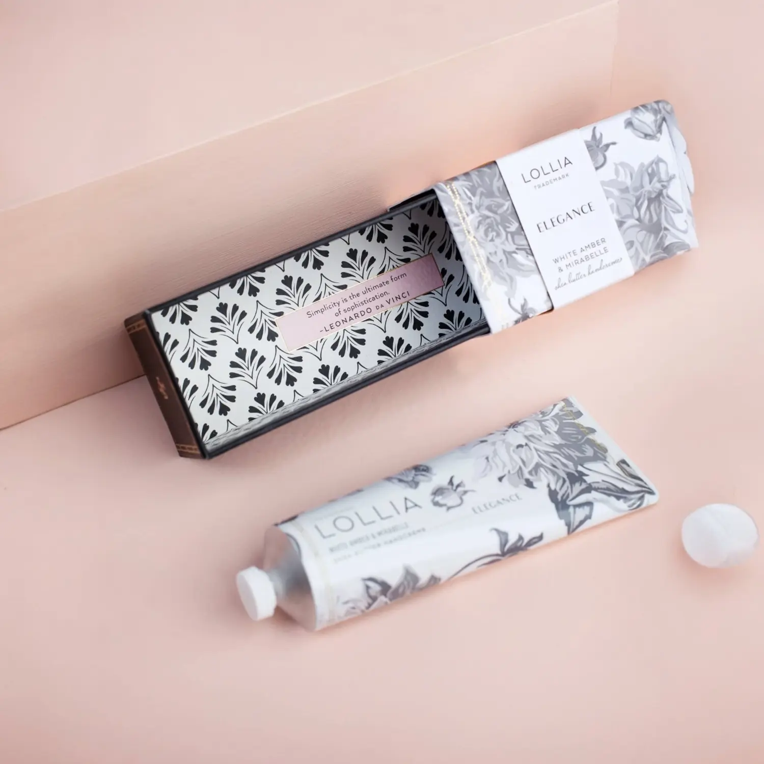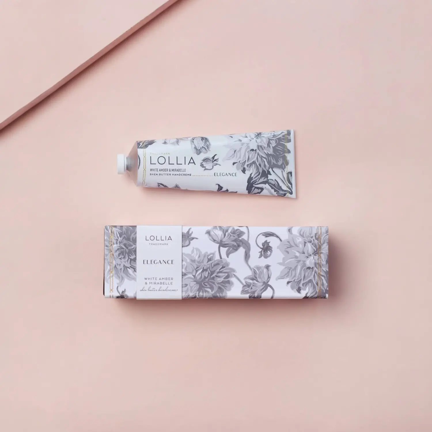 Decadent Shea Butter Handcreme leaves skin nourished and radiant, while lingering notes of opulent White Amber & Mirabelle captivate the senses.