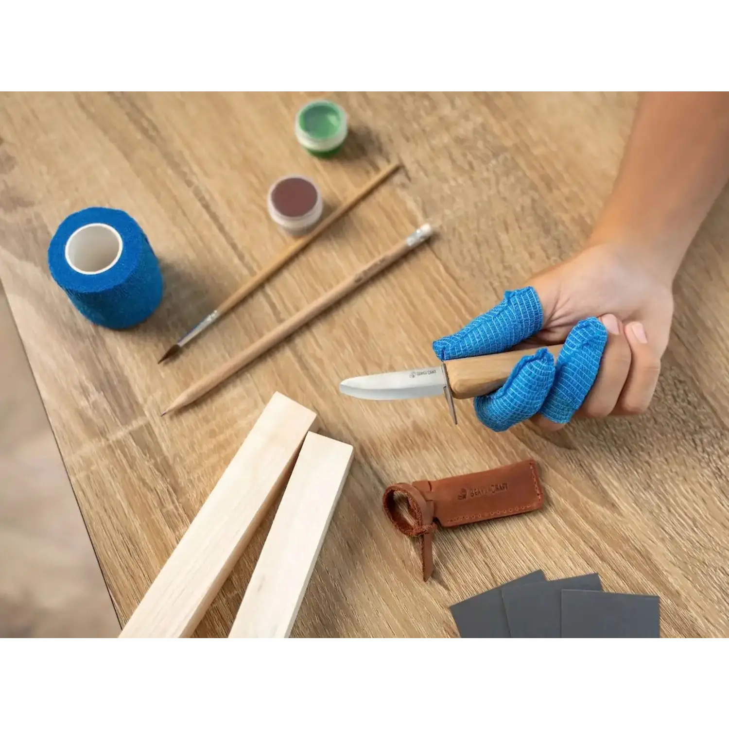 Paired with carefully selected basswood blocks, sandpaper, safety tape, a pencil, paints, and a brush, this kit ensures a smooth creative experience.