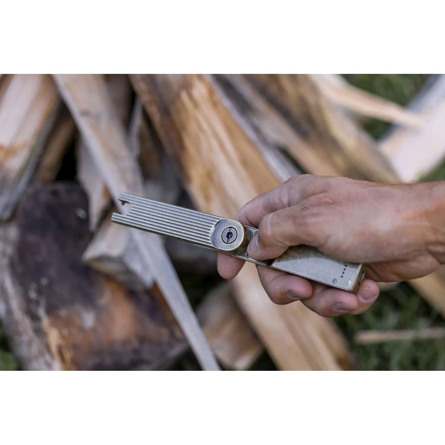 Made with high-quality die-cast zinc parts and finished with a tumbled brass coating, the Pivot Arc Lighter is built to last, and the wind-proof design ensures use in all weather.