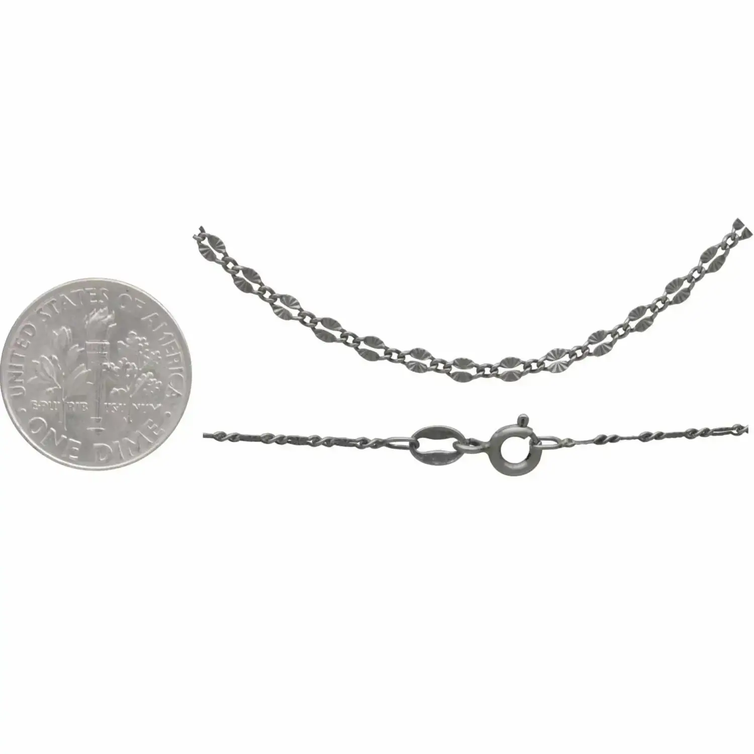 This finished chain features dainty sunburst oval links and is finished with a 5mm Spring Ring Clasp.