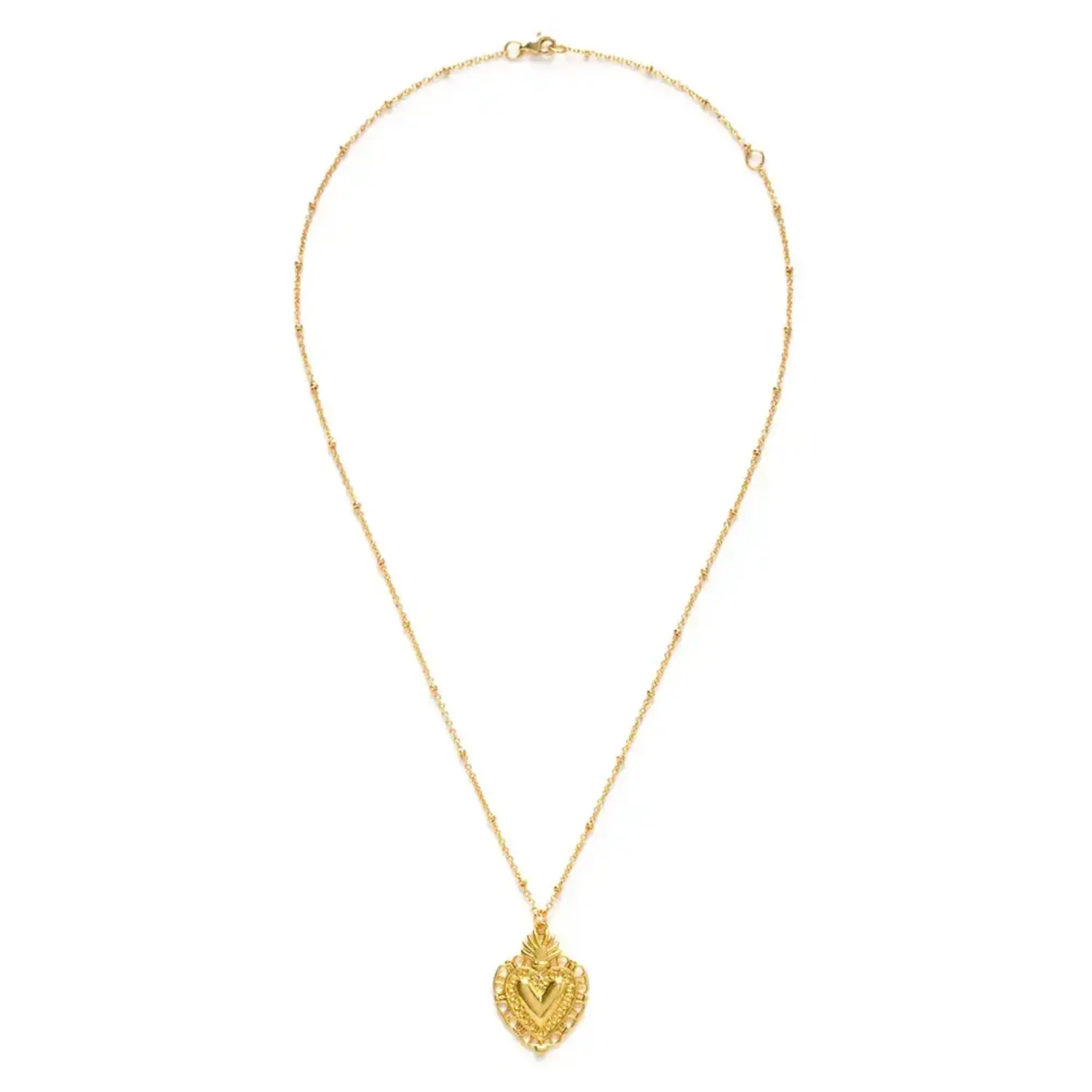 Beautiful sacred heart "ex voto" pendant hangs on a vintage style beaded chain.
