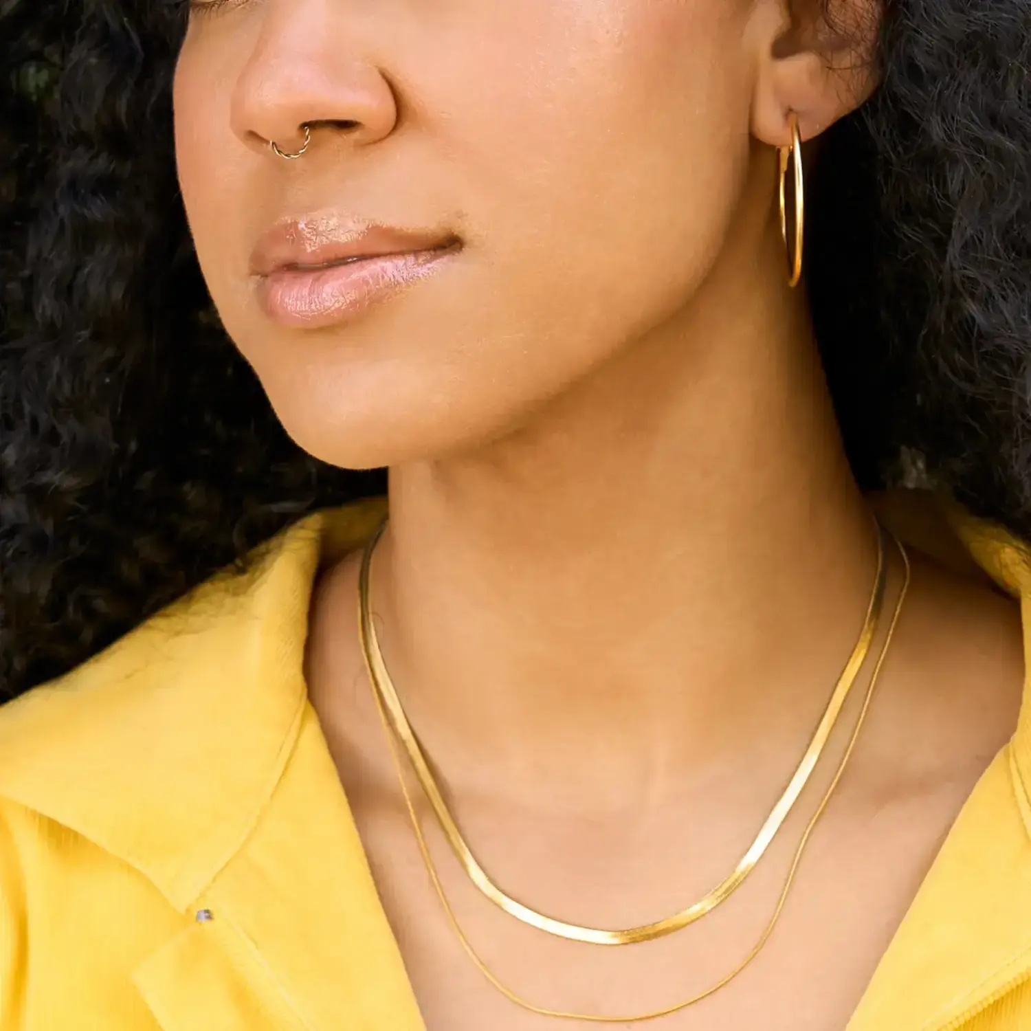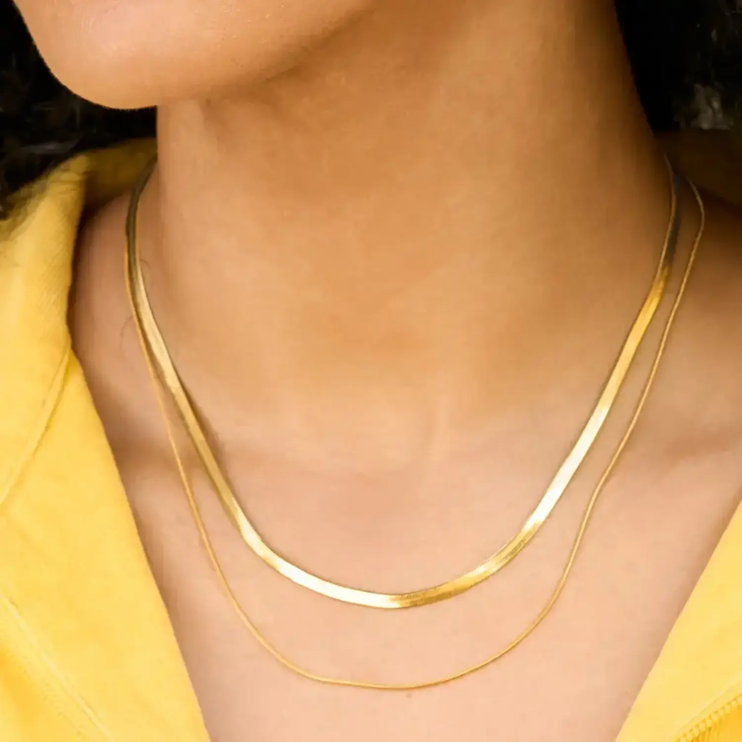 Featuring two graduated snake chains that lay flat against the skin, this set mimics the appearance of liquid gold, offering a sleek and modern aesthetic that transitions seamlessly from day to night.