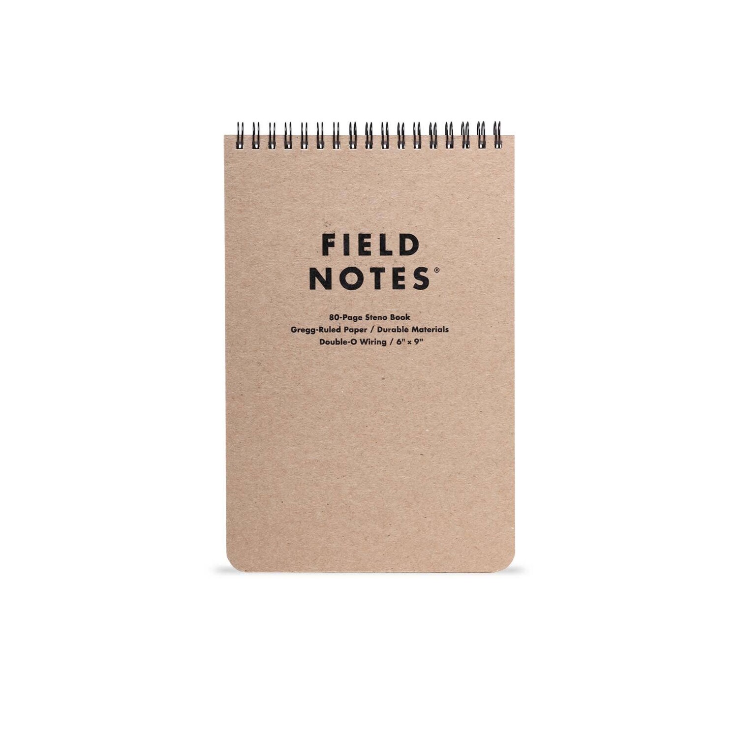 The Steno is 6" by 9" with a black Double-O Wiring spiral at the top, so it lies flat, open or closed.