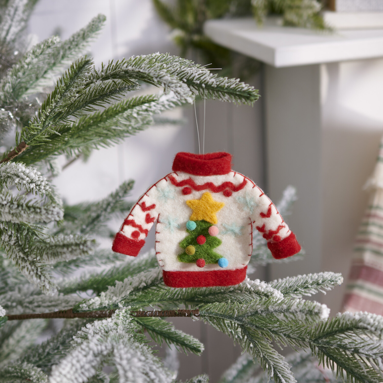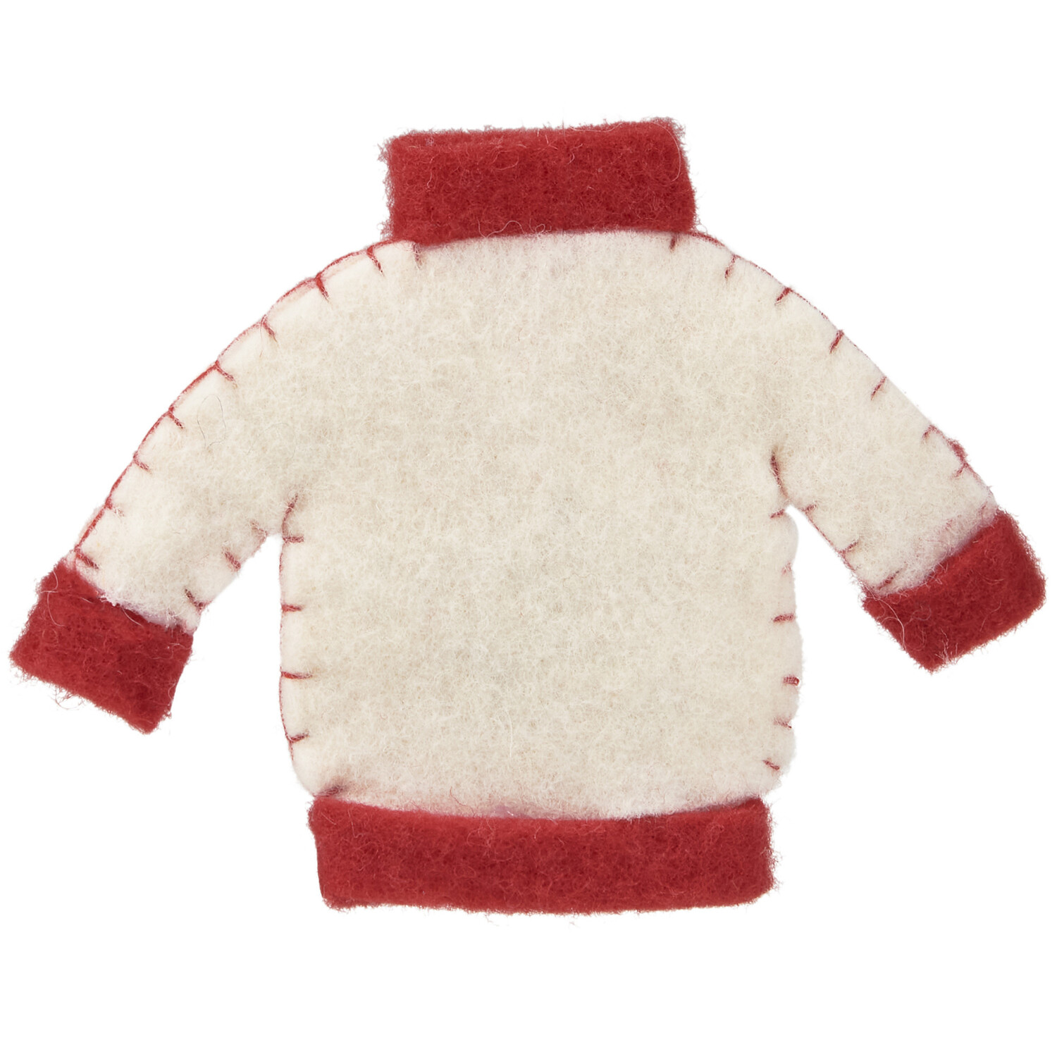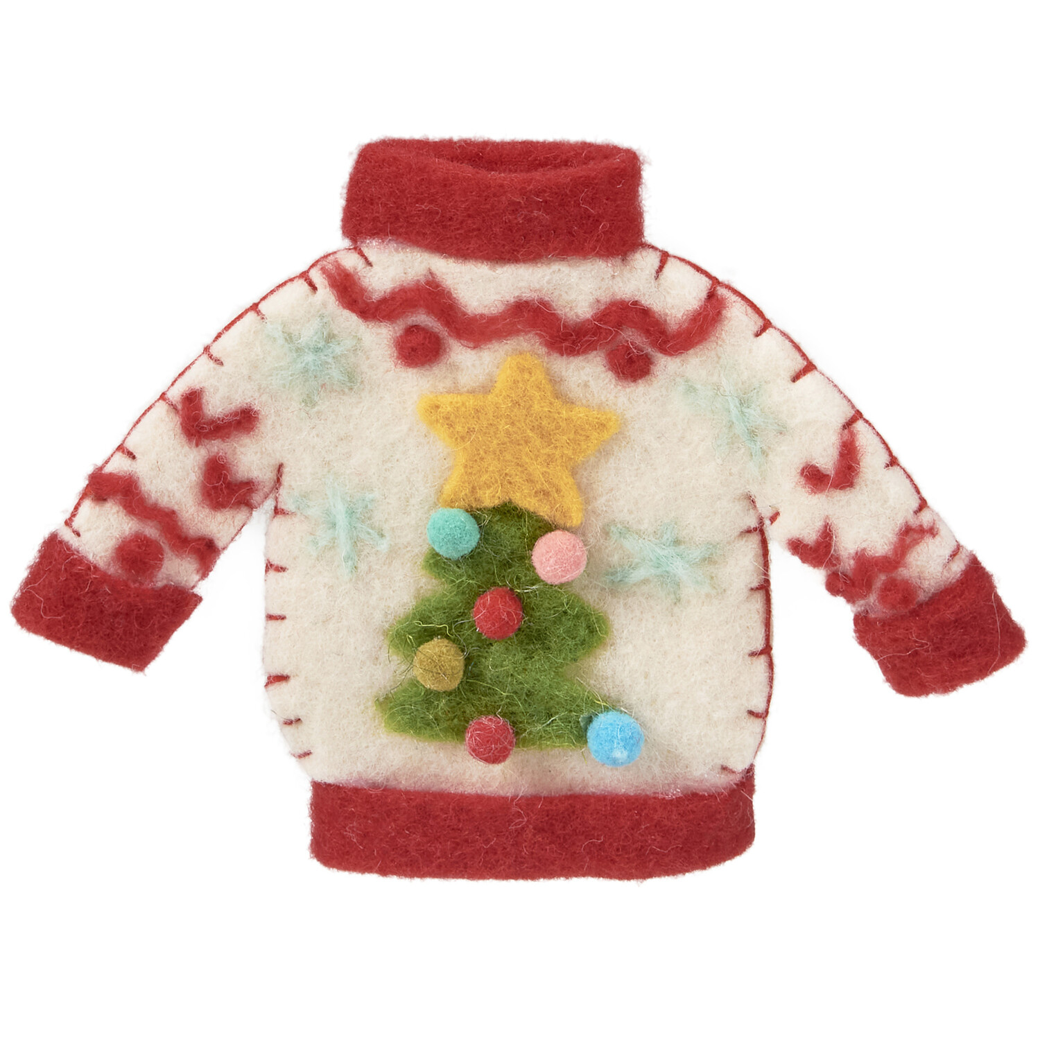This charming ornament features a whimsical Christmas sweater design, complete with handmade details like felt ball ornaments and stitched star accents.