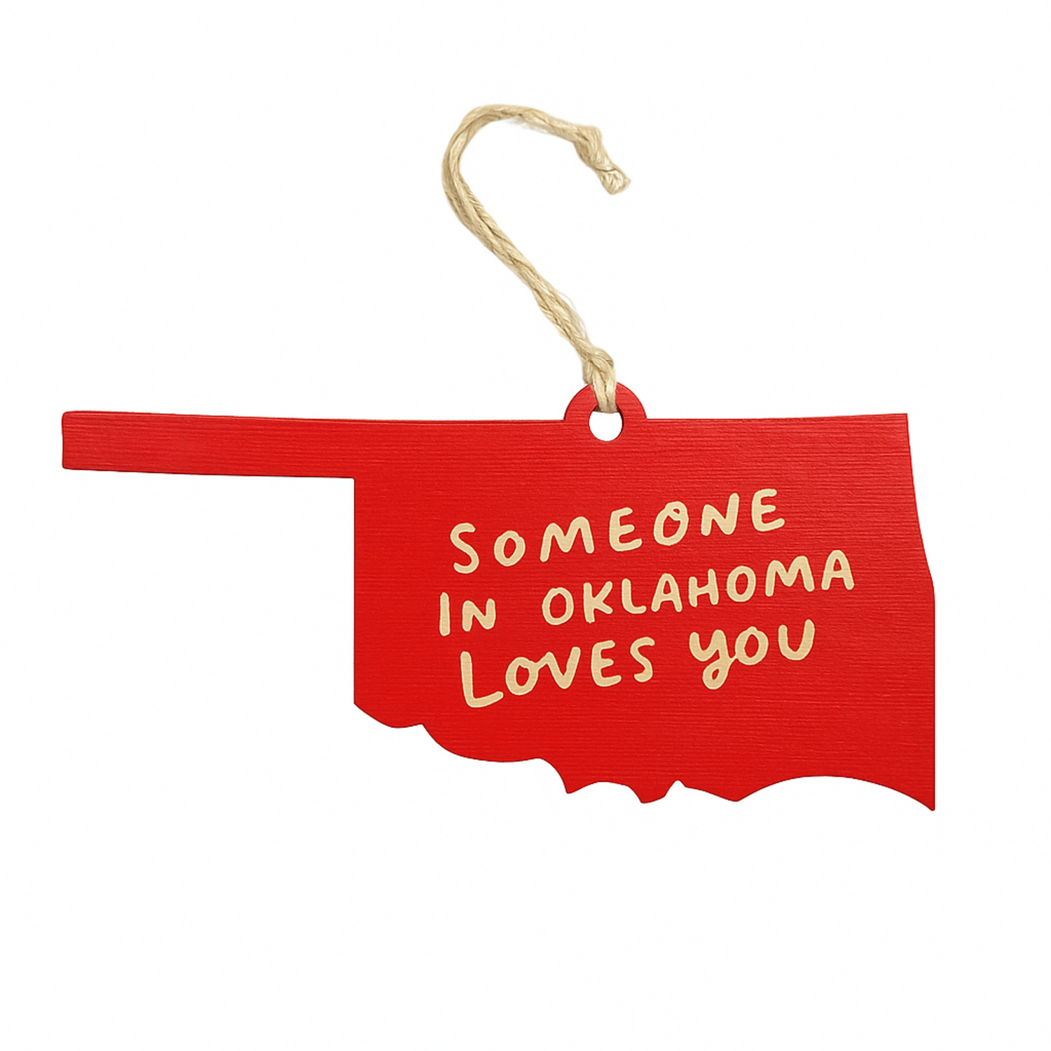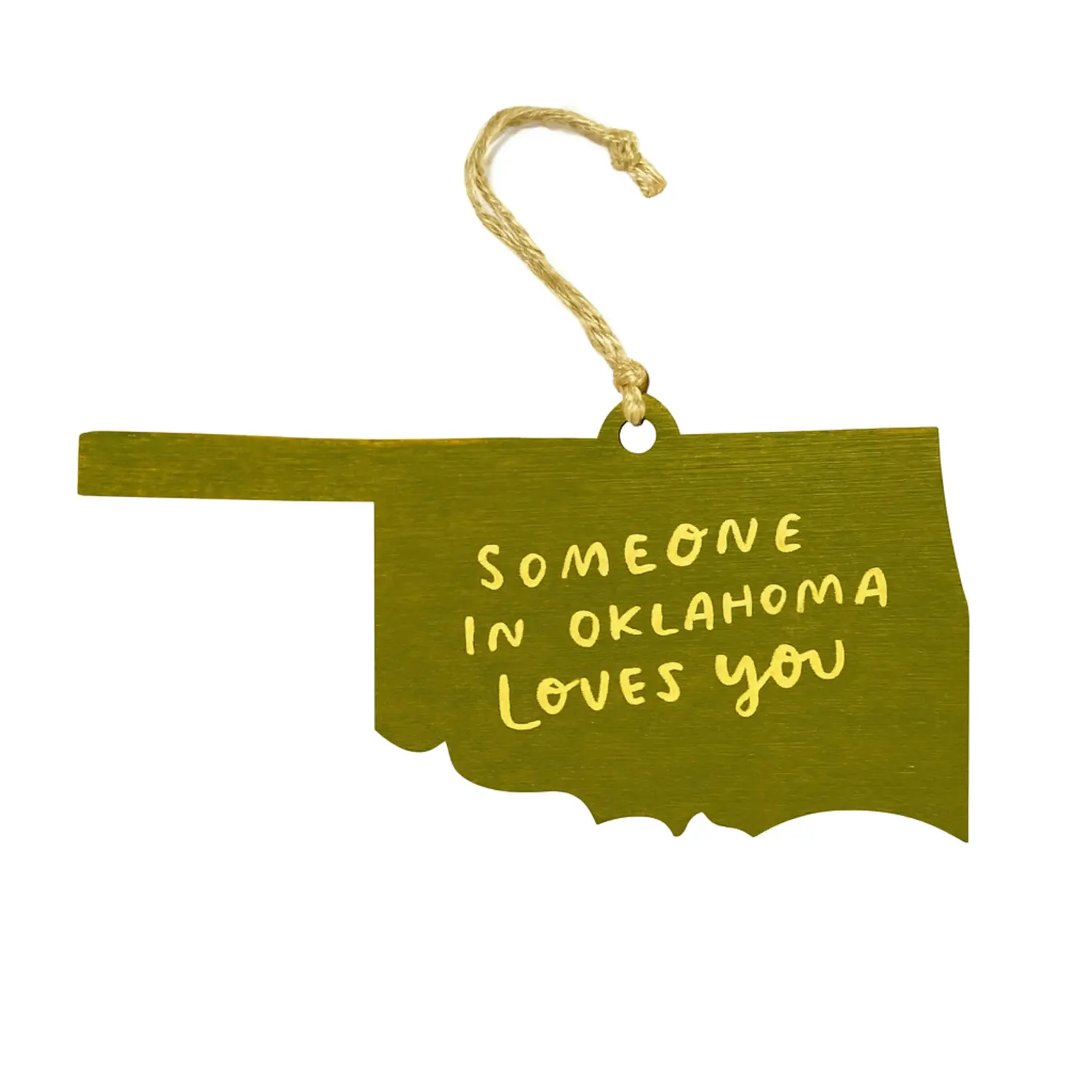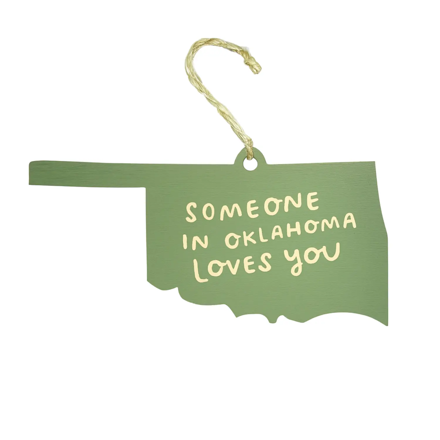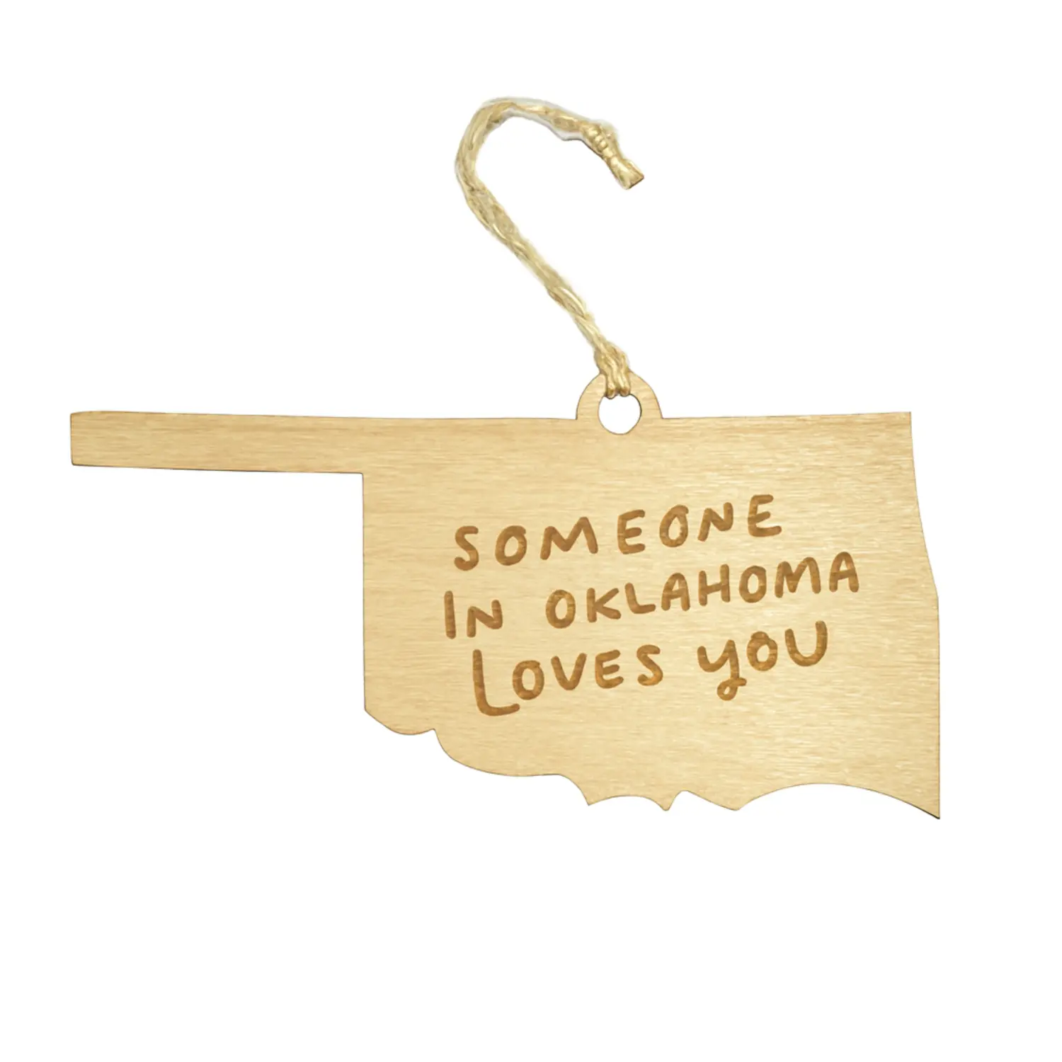 Laser cut wooden large ornament in the shape of Oklahoma engraved with the words 'Someone in Oklahoma Loves You' in signature handwritten font.